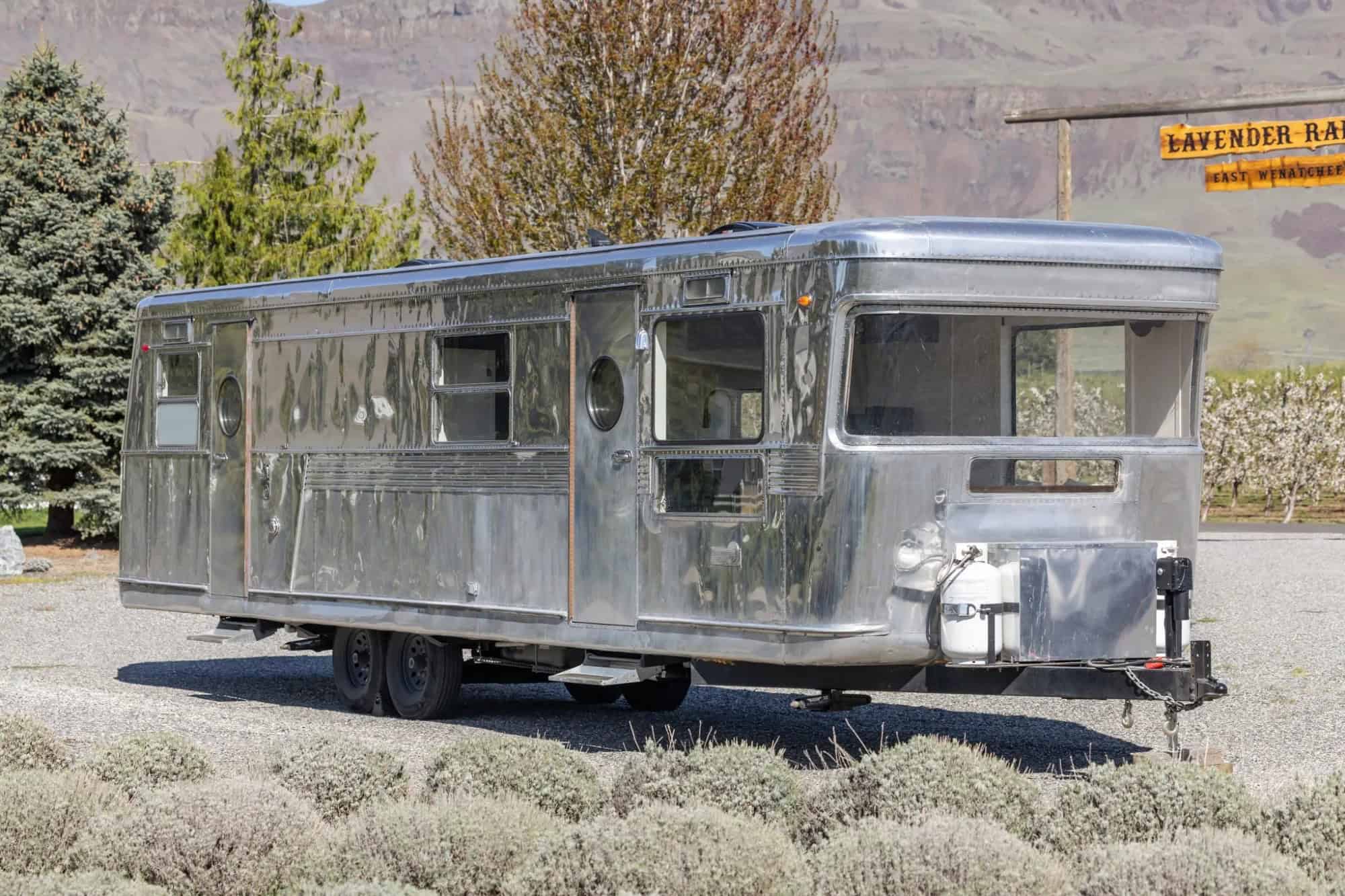 Spartan travel trailers were produced by the Spartan Aircraft Company of Tulsa, Oklahoma, between 1945 and 1962, and their designs were influenced by aircraft construction techniques. The aluminum exterior of this example had been painted under prior ownership, and it was stripped and polished during the refurbishment. Additional work involved adding a hinged frame to the rear window opening, installing a single-piece polycarbonate front window, and replacing the side and rear windows, doors, and aluminum skirting. Features include LED taillights, two camp-side entry doors with porthole windows, slide-out boarding steps, and Spartan badging. Some dings are visible on the body panels.