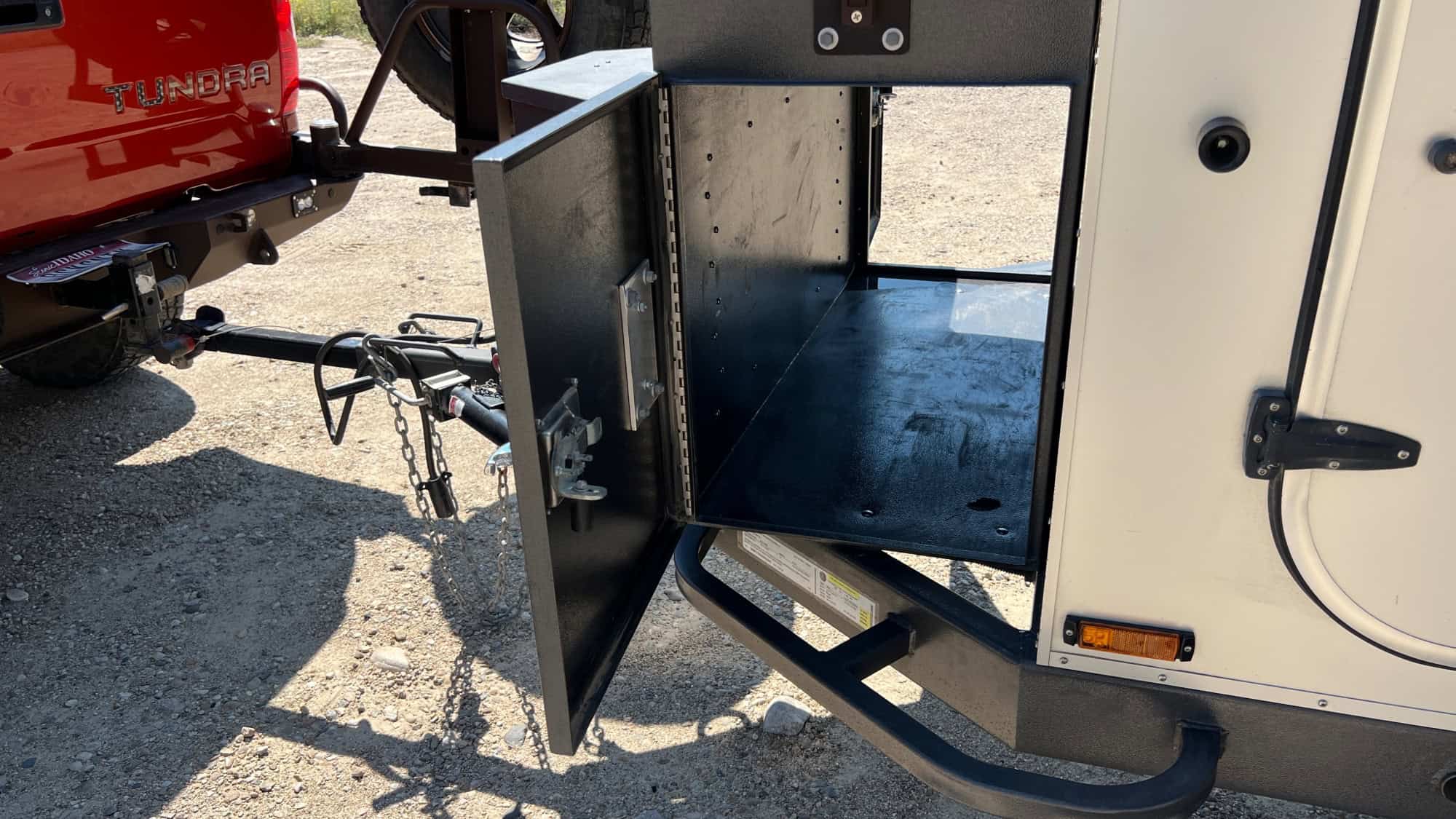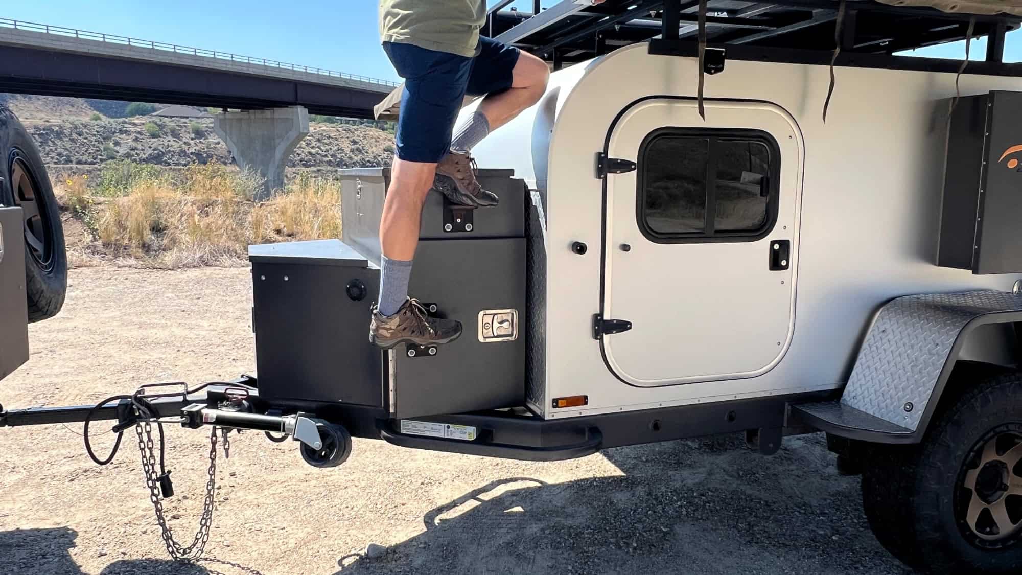 I added four fold down utility steps to the front expedition storage box. 2 on each side. These fold down steps make it easier to climb up onto the roof of the trailer if you have the awnings deployed.