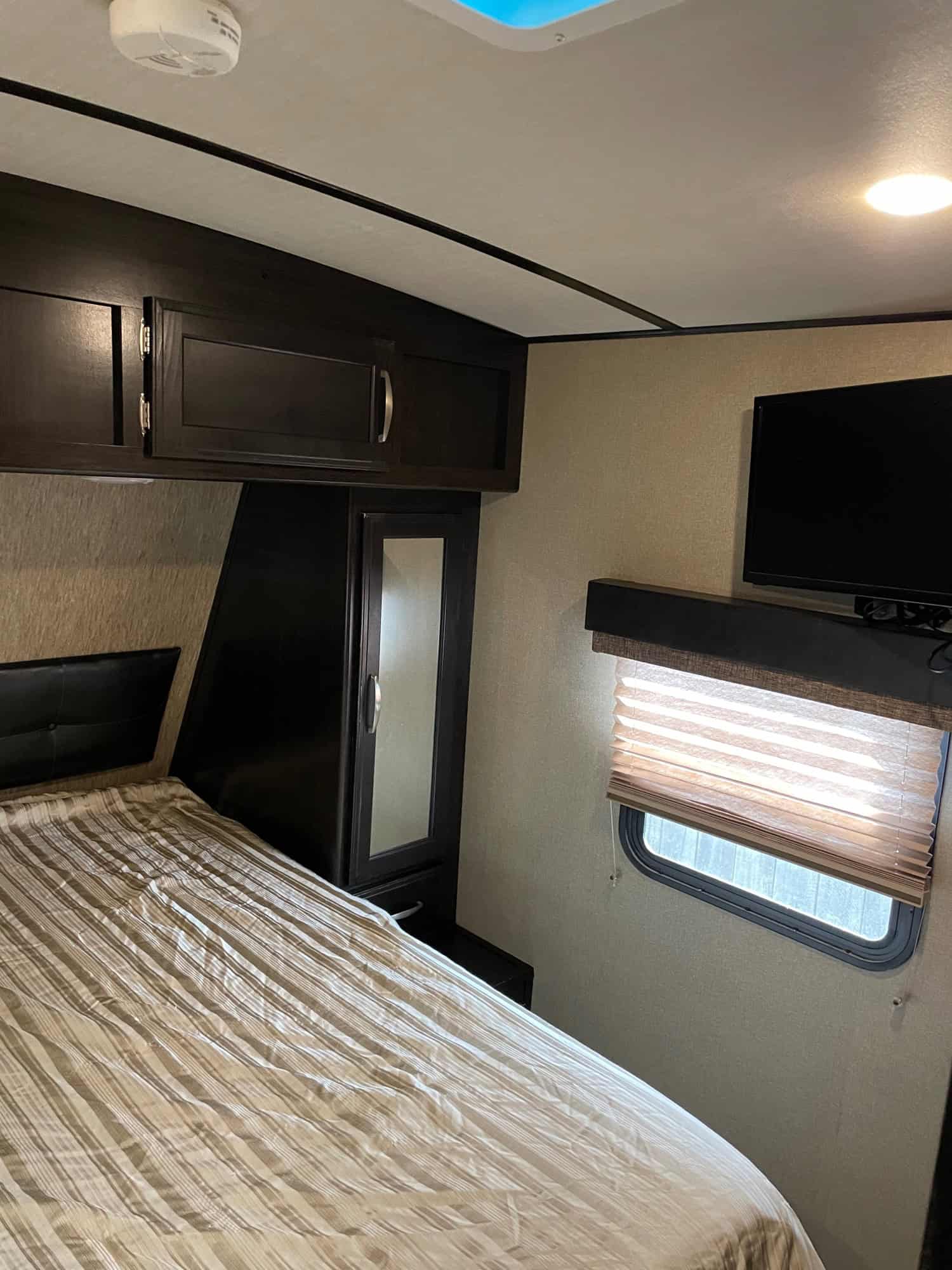 This is a very comfortable layout. It has a barn door that separates the bedroom from the rest of the living space. It has two mounted television sets. Electric awning and one slide out. There is some wear on the pleather couch and fan above the kitchen needs work. The suggested used sales price is $24,000. This unit is priced to sell!