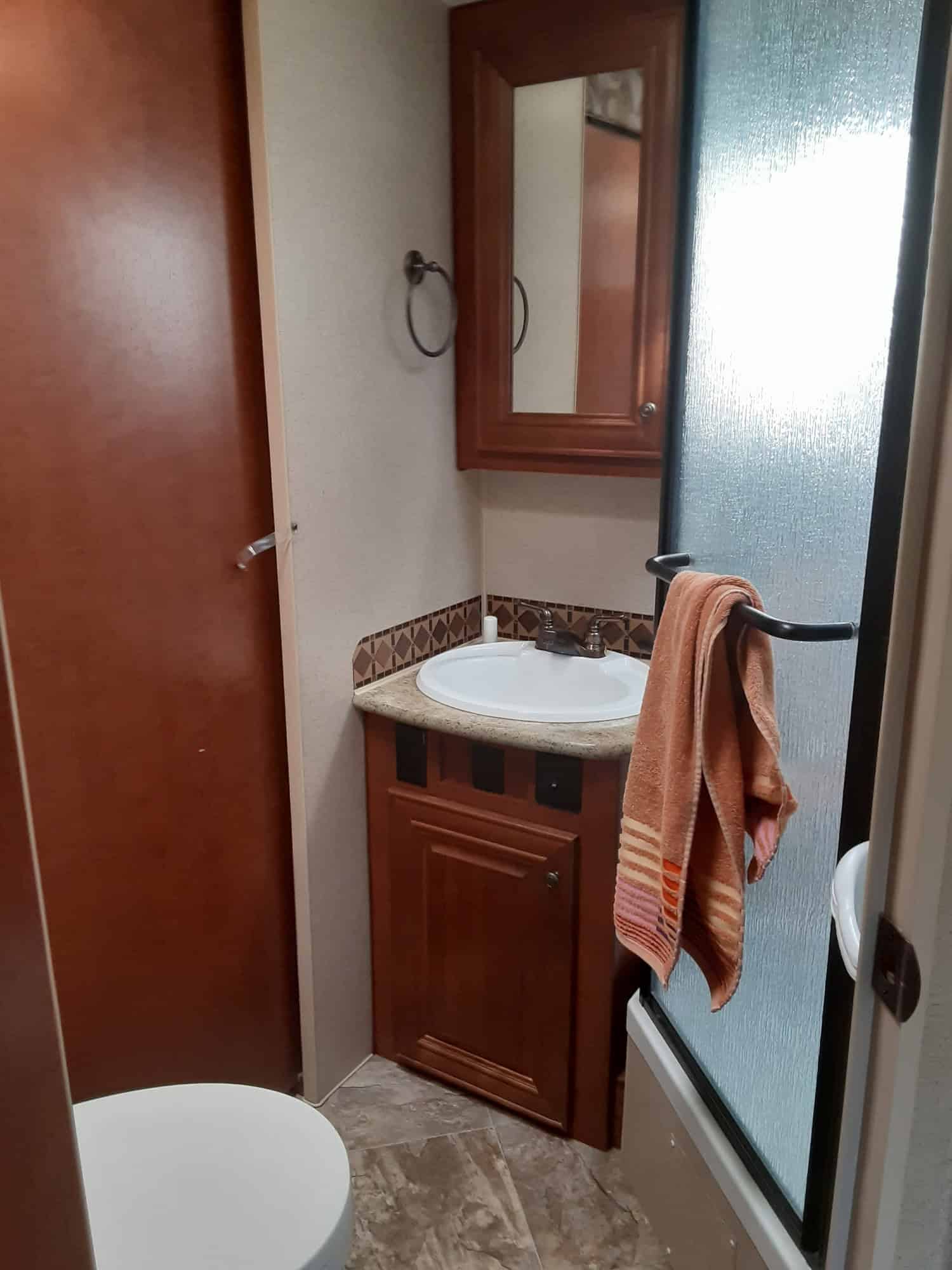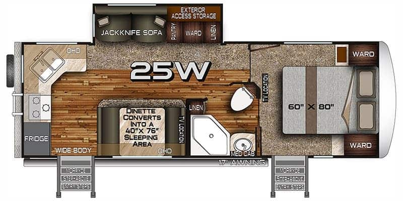 Rear kitchen, center living floor plan, 1 slide-out with roof topper, very handy outside storage in slide-out, large awning, real queen bed is 60×80. A door separates the bedroom area from the living space, and a wooden pocket door the bathroom from the bedroom area.
