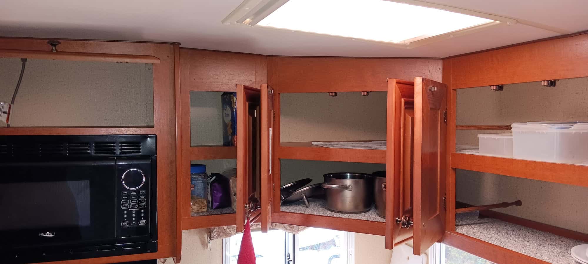 1800W power inverter with bypass and remode control panel in bedroom. (It powers all your outlets – except AC and MW (could be powered by inverter as MW has only 1350W consumption) – for hair dryer, coffee maker, electronics, if you are boondocking and will allow using shore power automatically if hookedup)