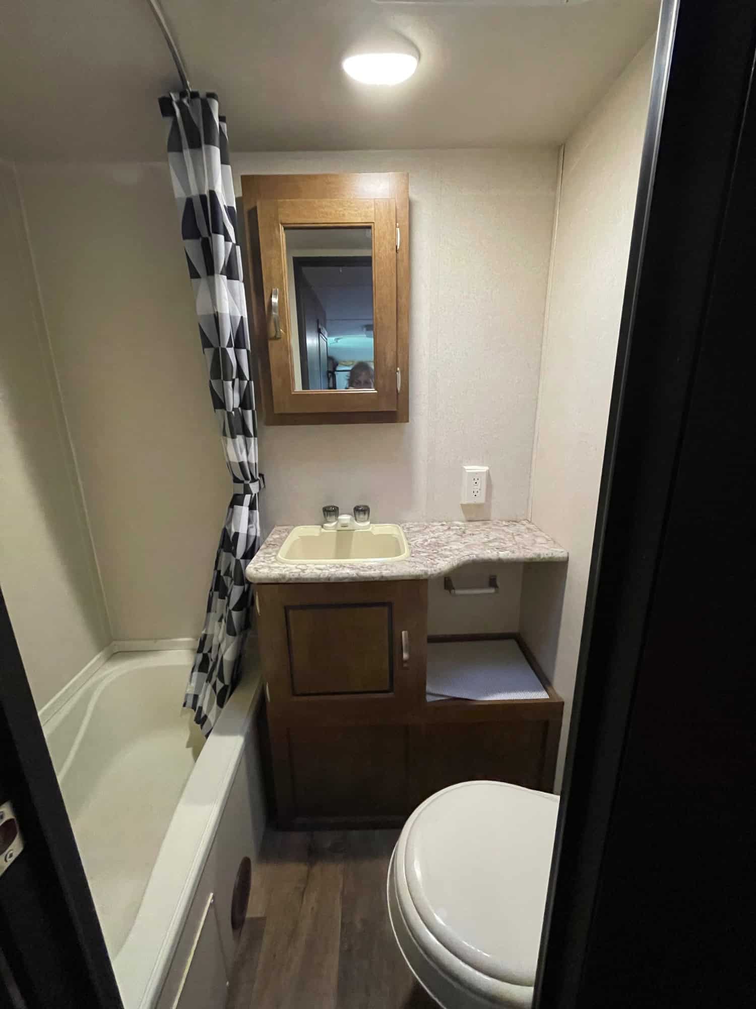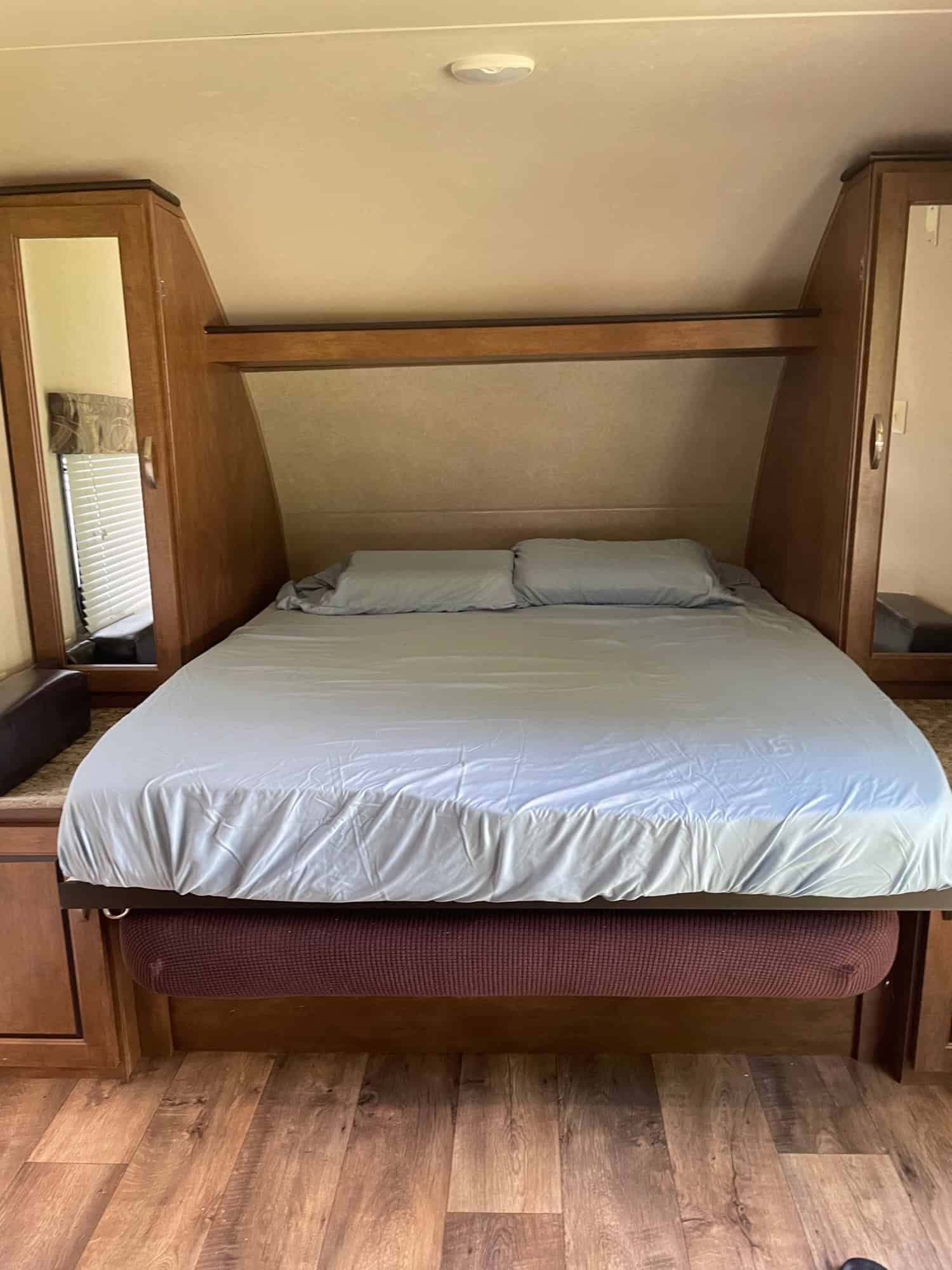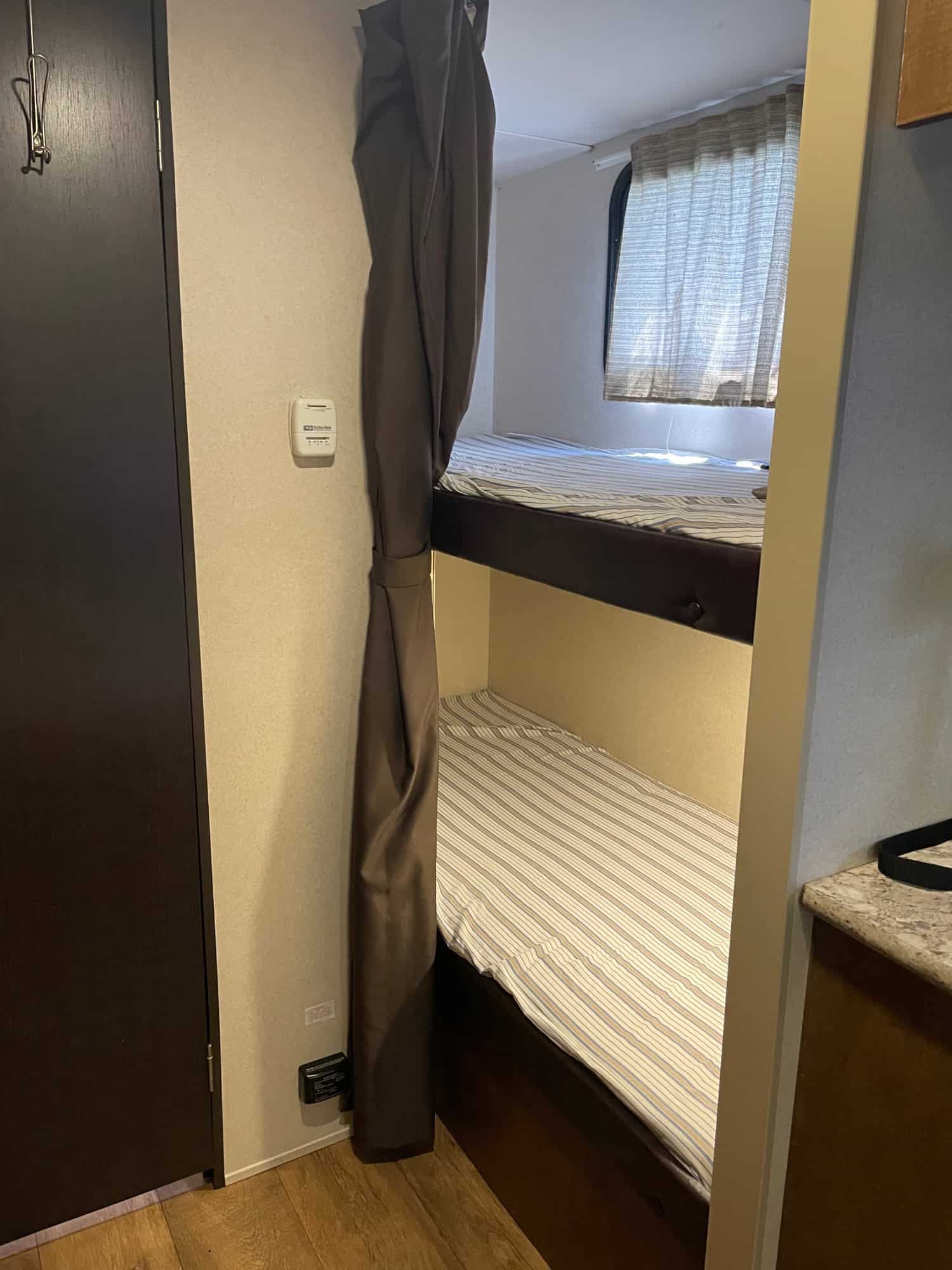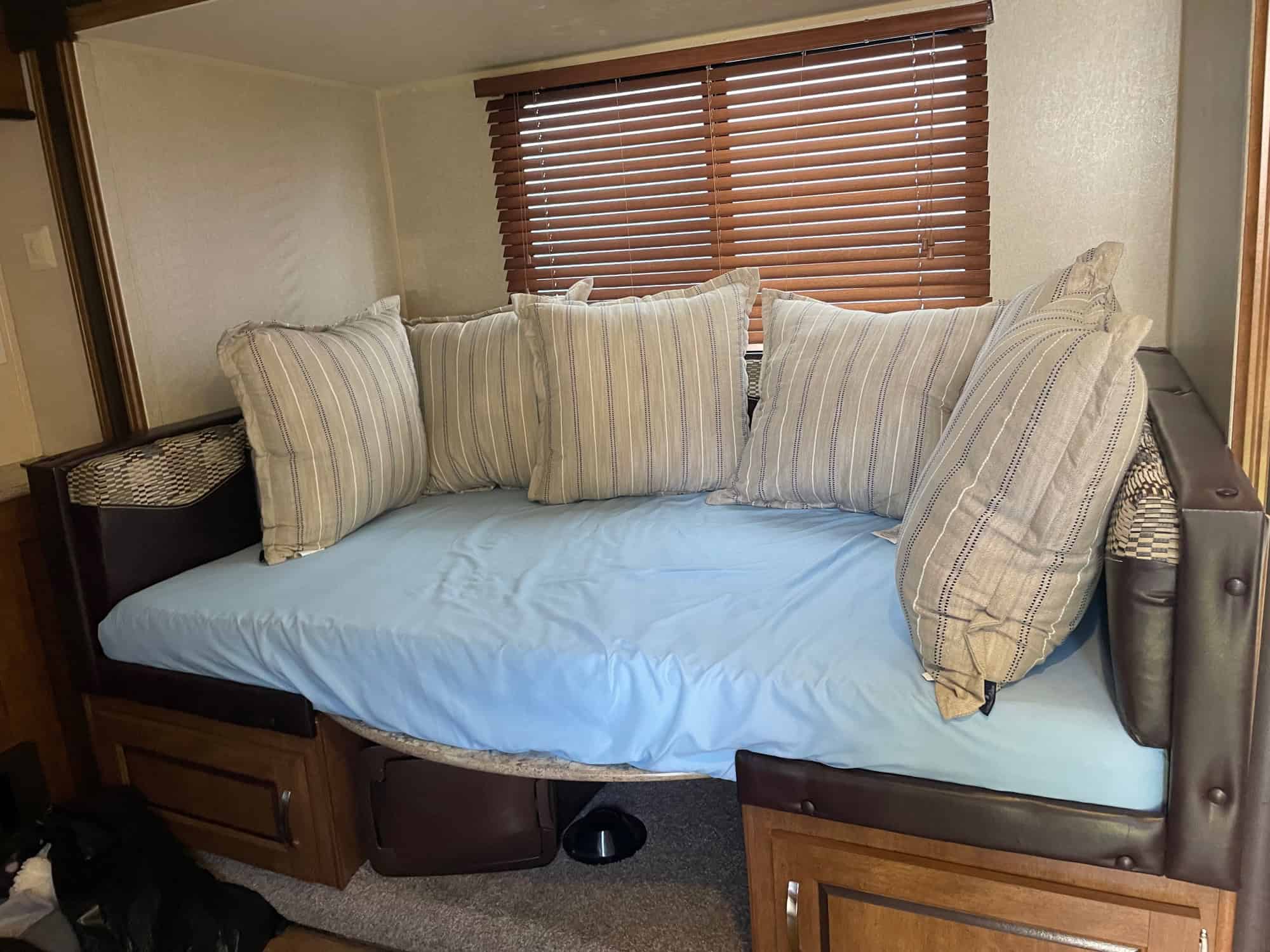 Fully equipped just need tow vehicle. All towing, sewer, water, and electric supplies included…NO LEAKS. Anti-sway hitch, 30 amp cable extension, 30 to 50 amp plug, 30 to household adapter, sewer hose extension, backwash sewer connector, extra water house hookup , water pressure regulator, unused water filter, x-chocks for new tires with wheel covers, levelers, surge protector,queen Murphy bed, bunks sleep at least 6’ person, slide out u-shaped dinette fully extended opposite the door, upgrade awning over slide out, roku tv included for entertainment area, double sink with fold up counter-top, a three burner range with overhead microwave oven, a refrigerator, pantry, overhead storage for dishes and things, crock pot, electric skillet, electric fry pan, other kitchen accessories, bathroom has tub/shower, toilet, and vanity with sink. wardrobes with hanging storage, 2 3-drawer dressers, and a 56″ sofa with two end tables during the daytime queen Murphy bed conversion. Can put that up fully made up as a bed. Many other extras. Including mattress to use as a daybed in the dinette area
