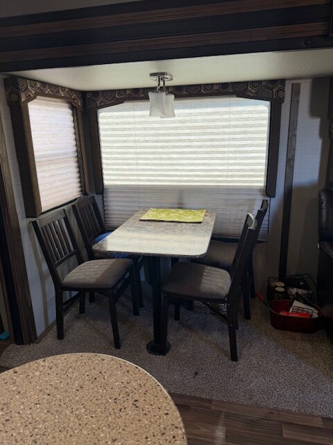 Inside, you'll find a well-appointed living space with a large sofa w/hide a bed, Love seat that is a double recliner, entertainment center, and dinette for enjoying meals or relaxing after a day of adventure. The kitchen features modern appliances, ample storage, and a large sink for easy meal prep and clean-up. The rear kitchen layout provides plenty of counter space and room to move around while cooking.