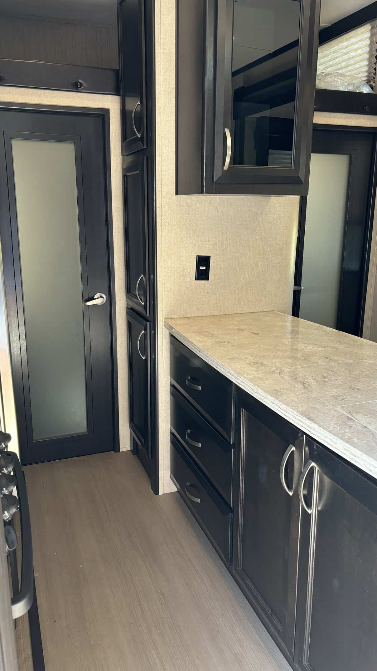 There are three awnings and three slides on this trailer. This trailer also has the built-in vacuum system. We have installed a Haloview camera mounted on the back of the trailer. The screen is not available, but it is available on Amazon. It has a Cummins – Onan generator and is located in the front compartment.