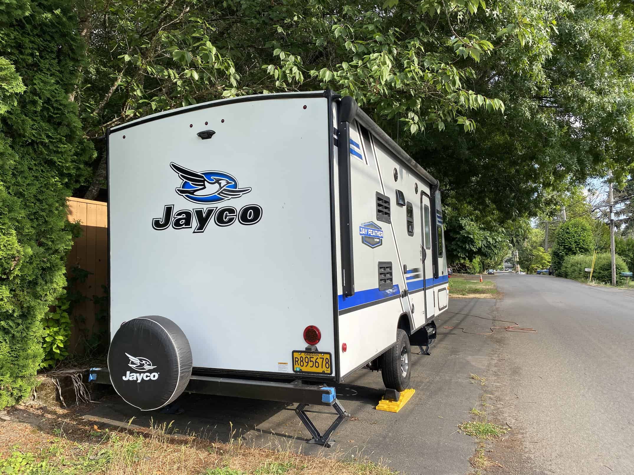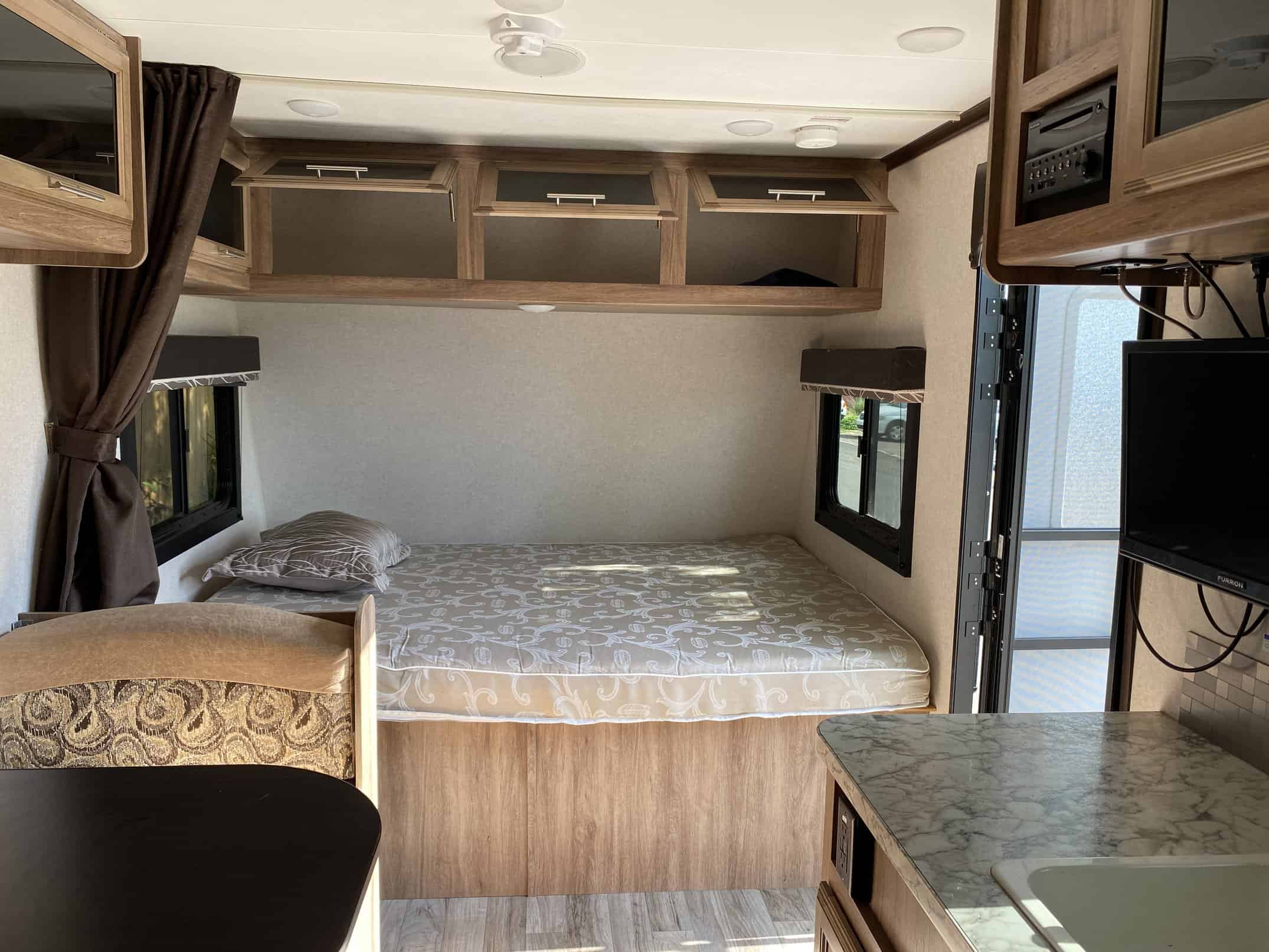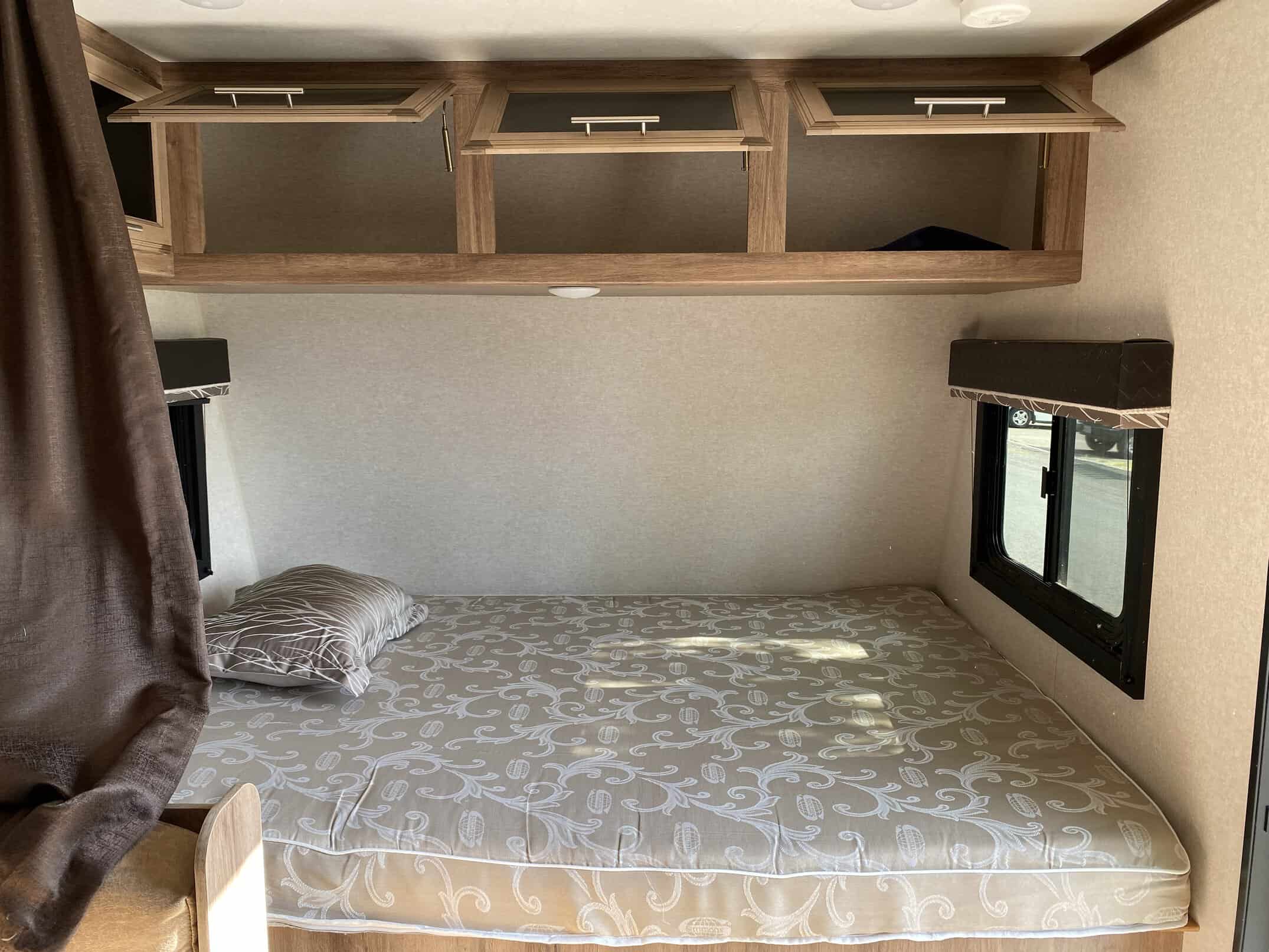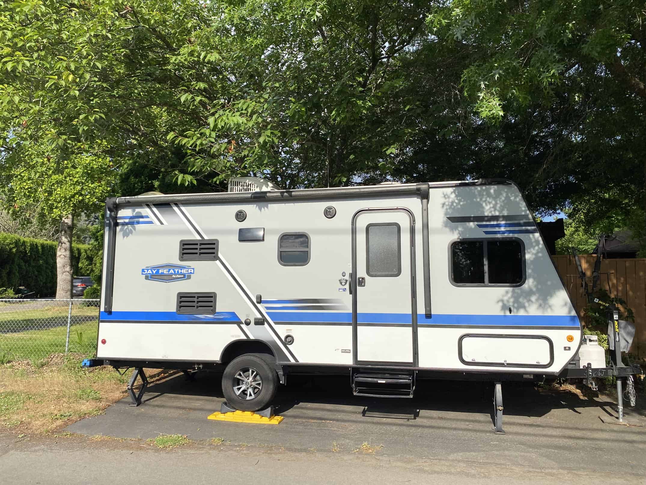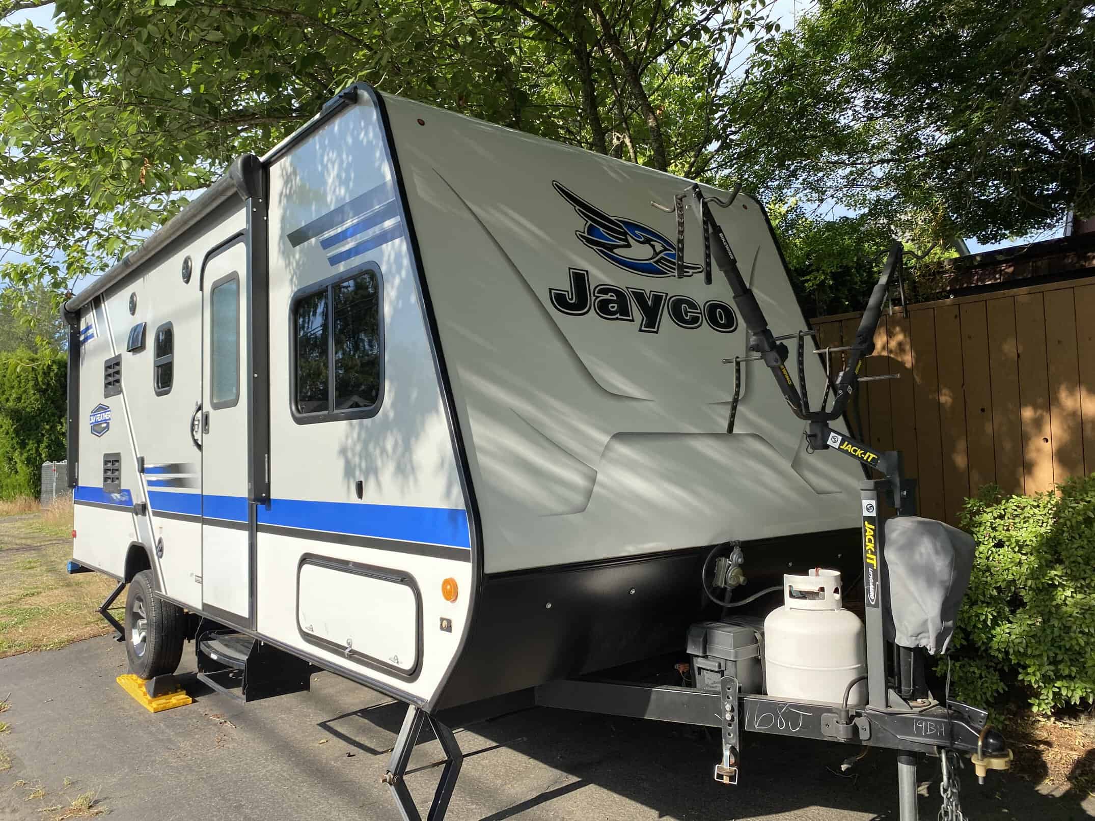 Like new Jayco Feather Travel Trailer 19Bh for sale. 2018 Jayco Jay Feather 7 19BH. We loved using this trailer 3-4 times a year since buying it new. Our kids are now too big and off to college soon so we are downgrading. This is an easy, smaller trailer to town at only 19 feet. Great entertainment system, DVD player, TV, Stereo with inside and out speakers. The front bike rack included. Jayco Jay Feather 7 travel trailer 19BH highlights: Front Queen Bed Rear Bunk Beds 13′ Awning Large Exterior Storage Compartments Solar ready Air Conditioning / Heat Jayco’s Description: Head out to your campground of choice with this Jay Feather 7 travel trailer 19BH by Jayco. Inside you will find a Jayco-exclusive queen Simmons mattress in the front, and in the rear there are Teddy Bear soft-touch bunk mats on the bunk beds. Easily prepare your meals in this kitchen while you are away from home. Here you will find a refrigerator, sink, microwave, and a two burner range. Outside there are large front storage compartments under the queen bed. Here you can store all of your exterior camping gear. The 13 awning provides plenty of shade during the day, and with the LED lights you can enjoy your evening out under the stars.