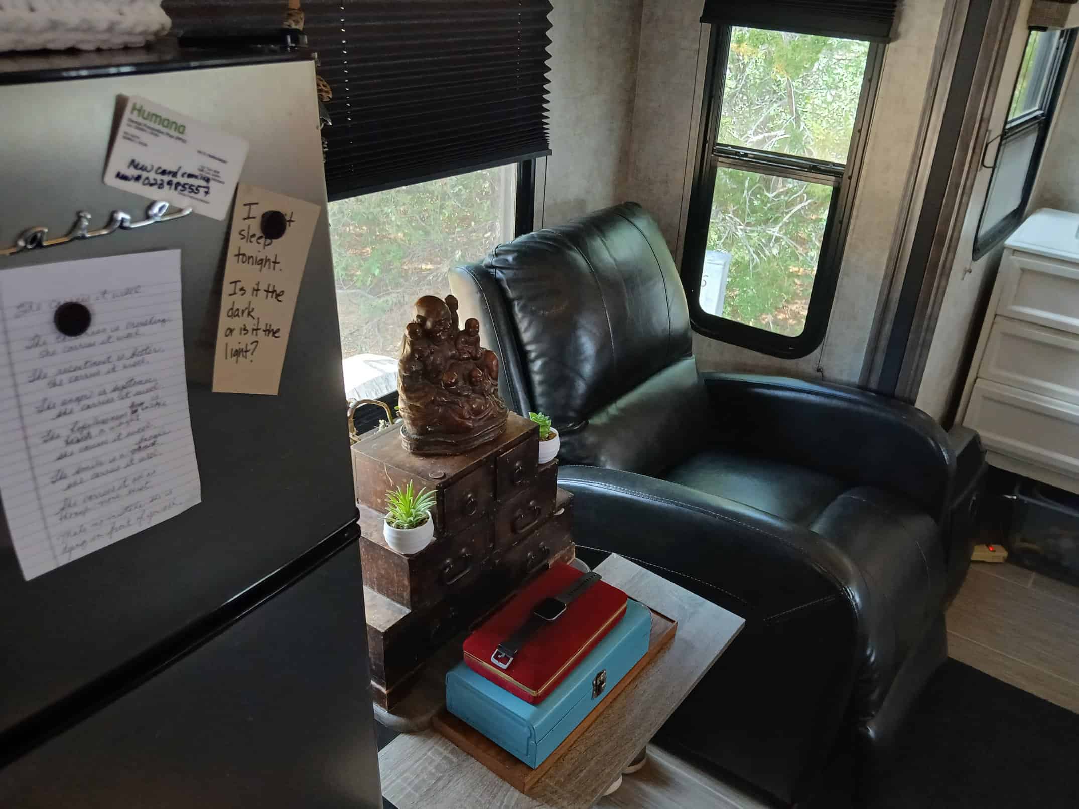 Removed one of the chairs because it was broken (the one left is not holding up well either, the leg extension won’t stay out).