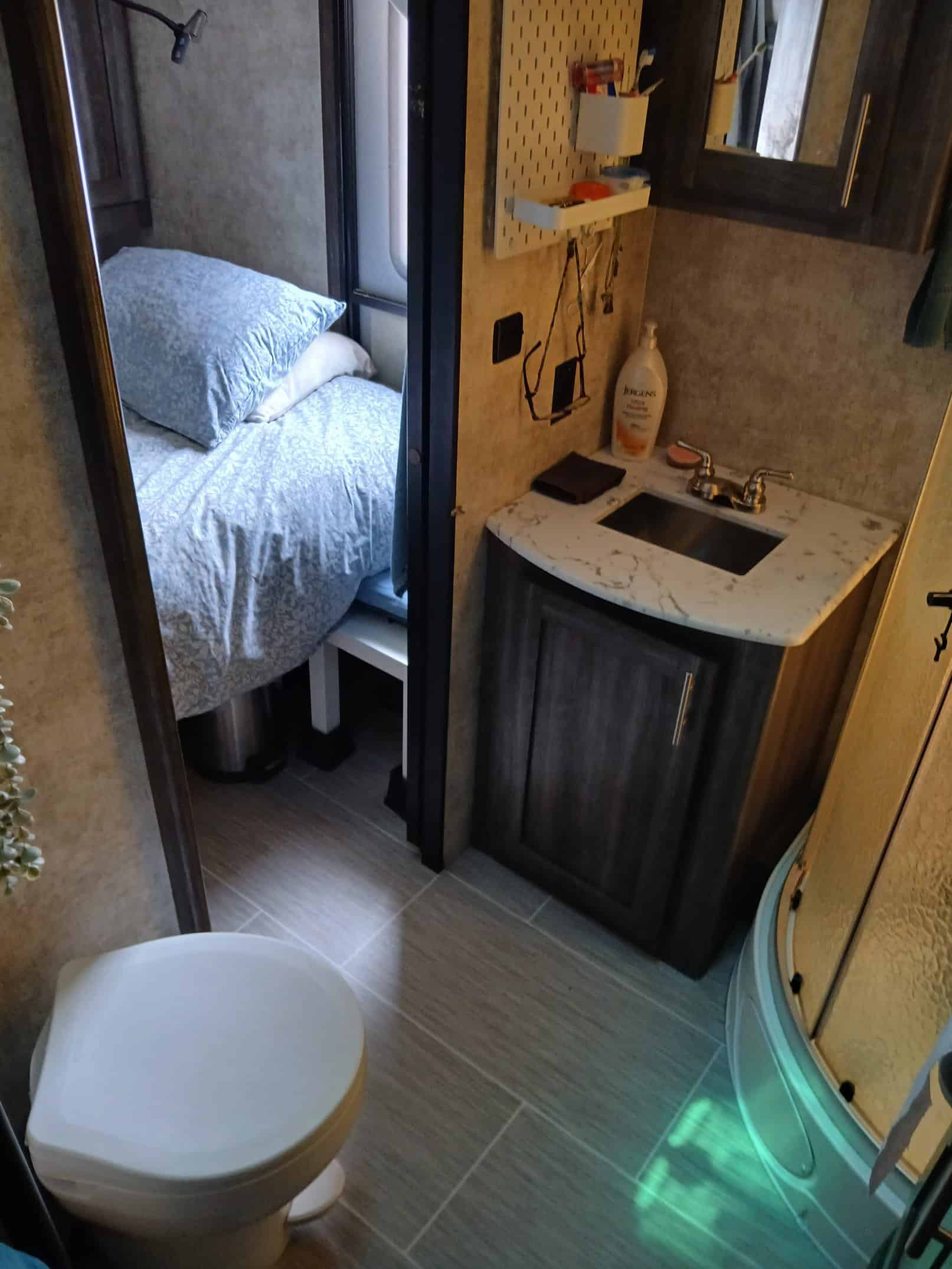 Installed a bar for clothes as there isn’t much clothing storage in the RV. You can also, remove this.