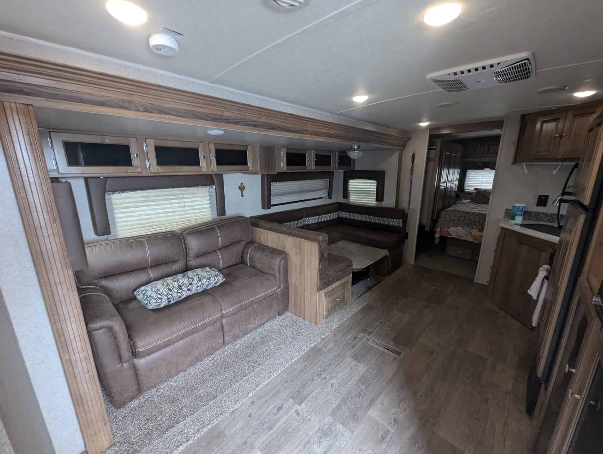 Sleeping accommodations in the Rockwood Ultra Lite 2706WS include a upgraded queen-sized bed in the bedroom, 2 bunk beds, as well as a convertible sofa and dinette in the living area. This trailer can sleep up to 10 people, making it perfect for families or groups of friends.