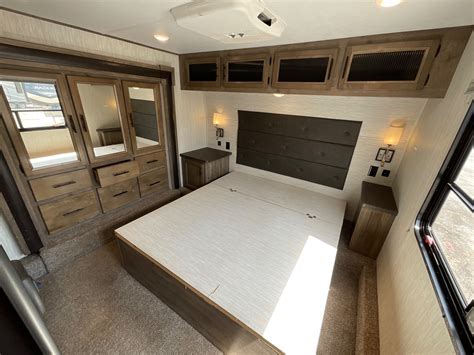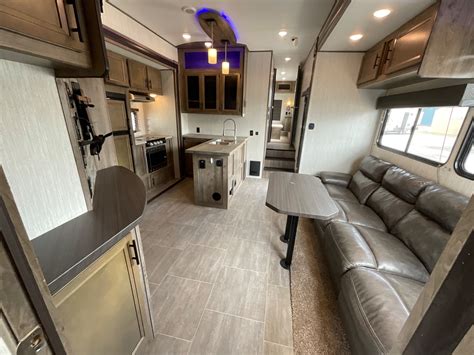 RV was bought new in 2020 and moved once. It has less than 200 miles with triple axles, 3 slide outs and 3 A/C units. 5500 watt Onan generator (5 hours), 40 gallon fuel station, 6 point auto leveling system with two electric awnings and full LED light package. The master bedroom has an RV king bed and en-suite bath with large shower. Salon / living area has an island kitchen with large fridge/freezer, microwave, fireplace, upgraded TV and reclining / heated sofa. 16 FOOT GARAGE is large enough to accommodate a sand rail or 4 person SxS plus any combination of ATVs or Motorcycles and includes it's own bathroom to convert into a guest quarters with double queen electric bunk beds, AC/Heating and additional bunk for storage or sleeping.