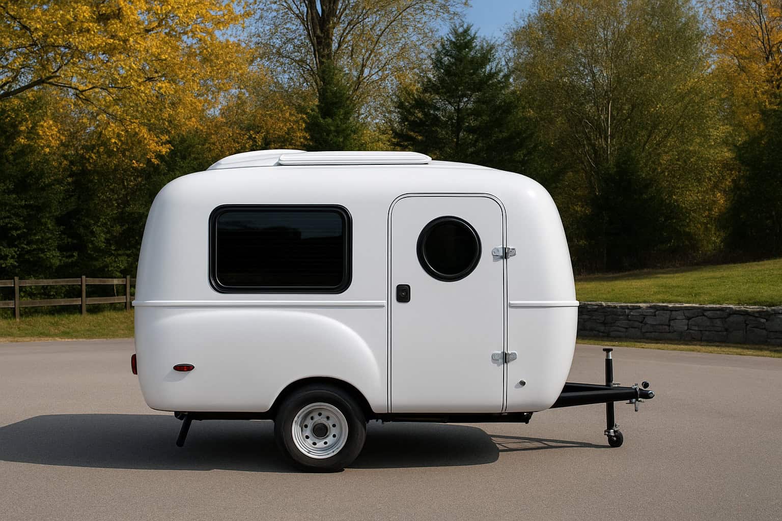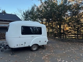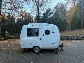 Fiberglass exterior shell makes it incredible light to move and tow- it doesn't require a massive SUV or truck, and photos show Mini Cooper's pulling it. Can be easily rolled around the driveway and campsite by a single person- which makes it a great setup for solo travelers, couples, or small families looking for something lightweight, stylish, and easy to tow.