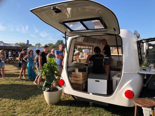 Our intention was to use this for our food business (and camper) at festivals/concerts, so have roadside and curbside concession windows and screens, wrap around fiberglass exterior bar, interior serving bar, interior serving table (makes a great work table too), and an upgraded 30A power inlet. It was never cooked in and we used a cooler for cold items, though it would likely support a small fridge/plug in cooler as well.