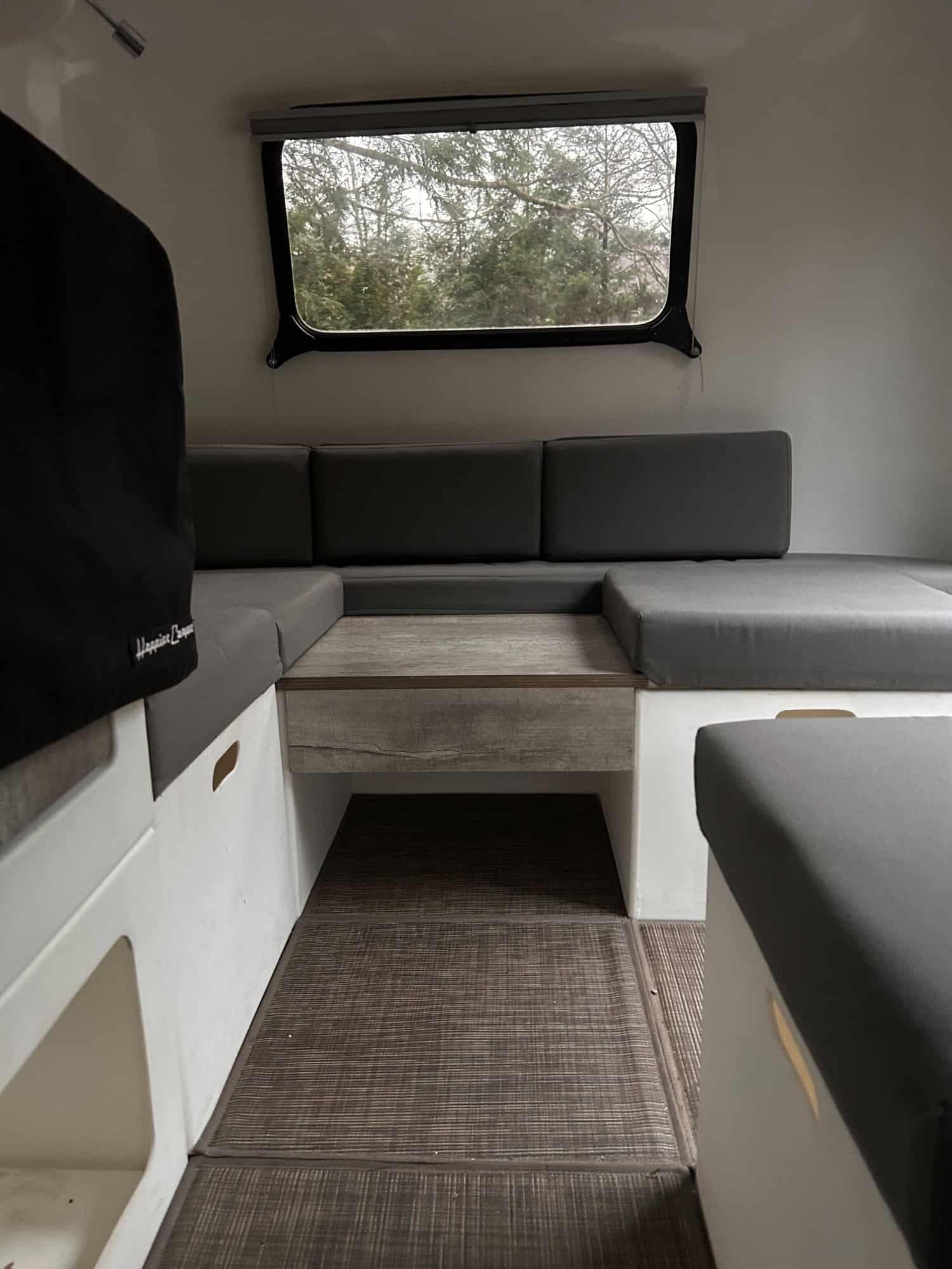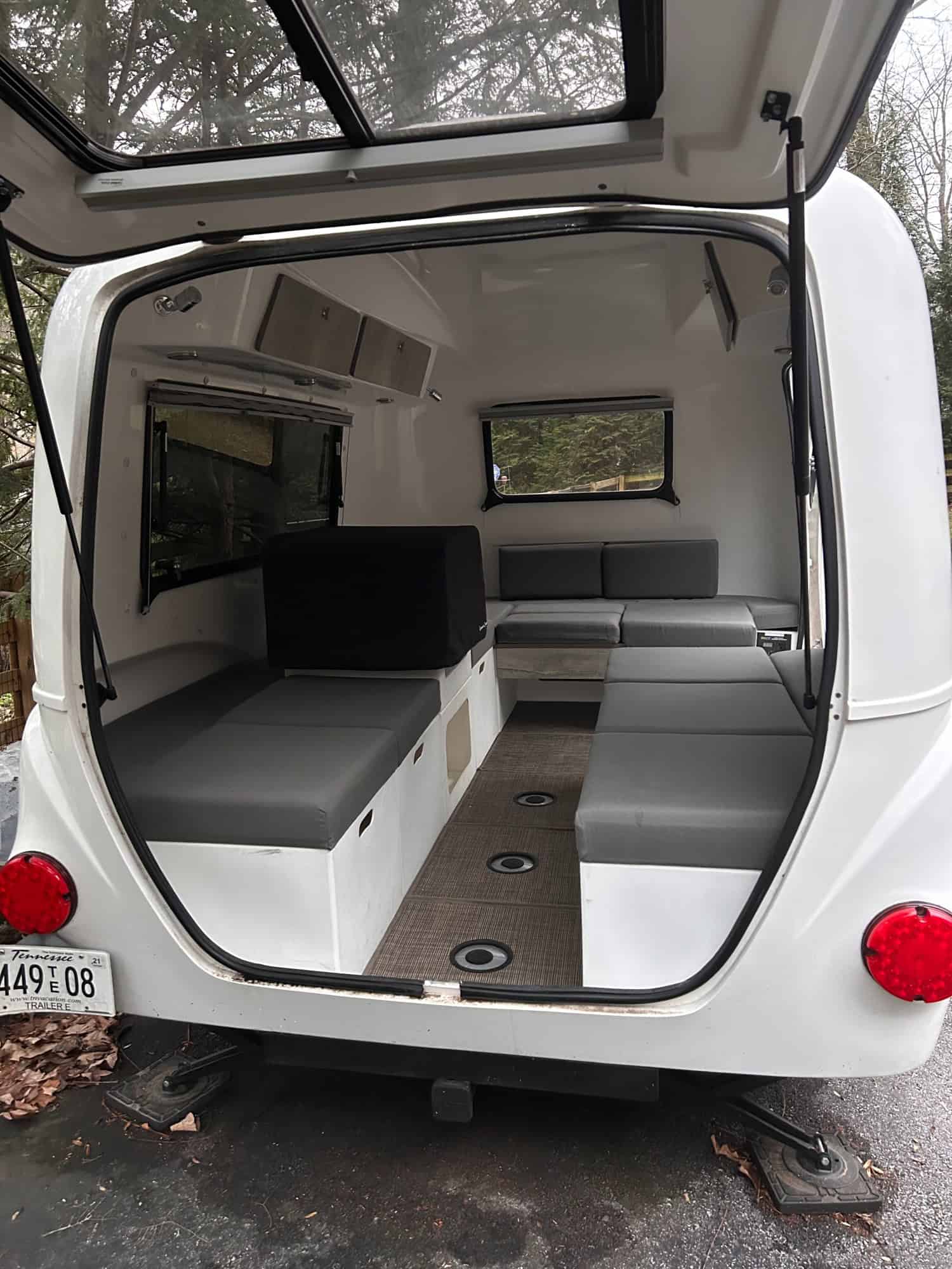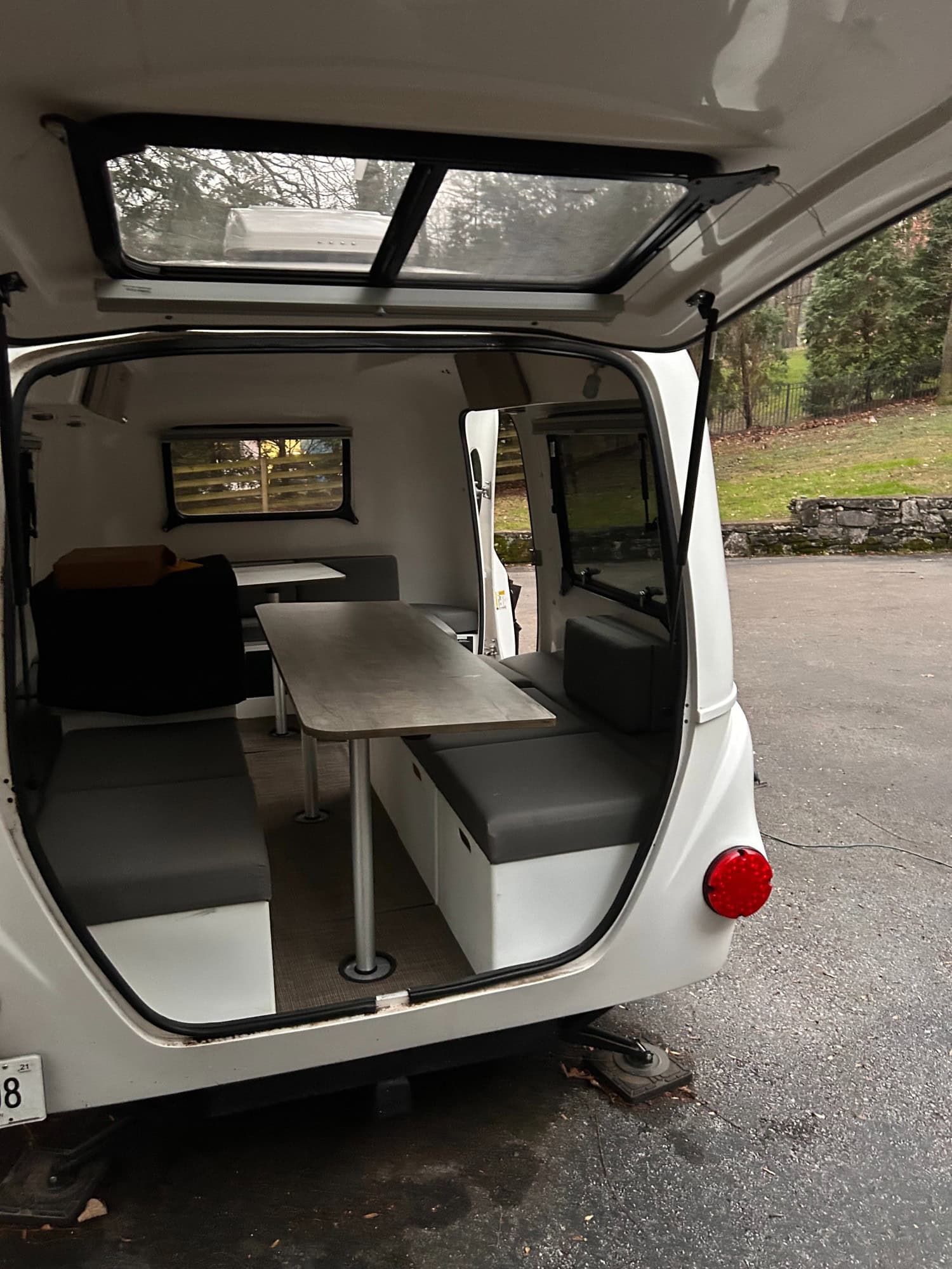 The Adaptiv cube system interior makes it easy to personalize your particular needs for each new adventure- whether you are using it for camping, a mobile office, a food truck, or a mountain bike hub. The possibilities are truly endless. The cubes can be removed to make an empty shell for moving, etc, and relocated outside around a campfire for impromptu seating. Our includes 8 Adaptiv cubes and cushions, small kitchenette sink cube pkg, dry-flush toilet (not in the photos), city water hookup, nesting table top pkg (w/ pole bracket for moving the party outside), countertop lid, rear hatch privacy screen, suspension awning, goose neck reading lights, front stabilizers, upgraded operable back window, and a 100watt solar panel/charger with 600 watt medical grade inverter (i.e. can accommodate a CPAP).