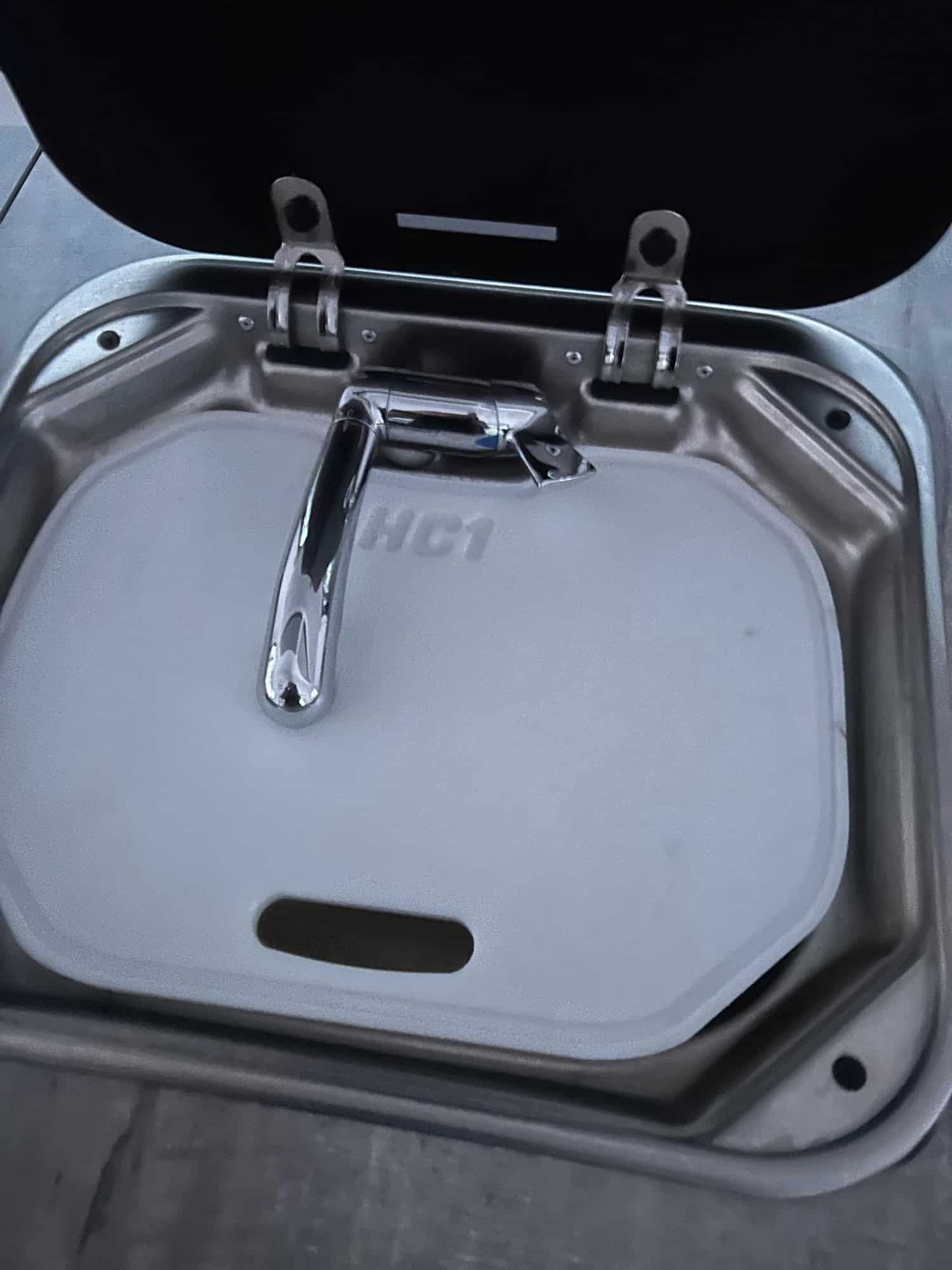 Also includes removable rubber interior mat, tire chucks, leveling blocks, hubcap moon caps, and Happier Camper cover for storage.
