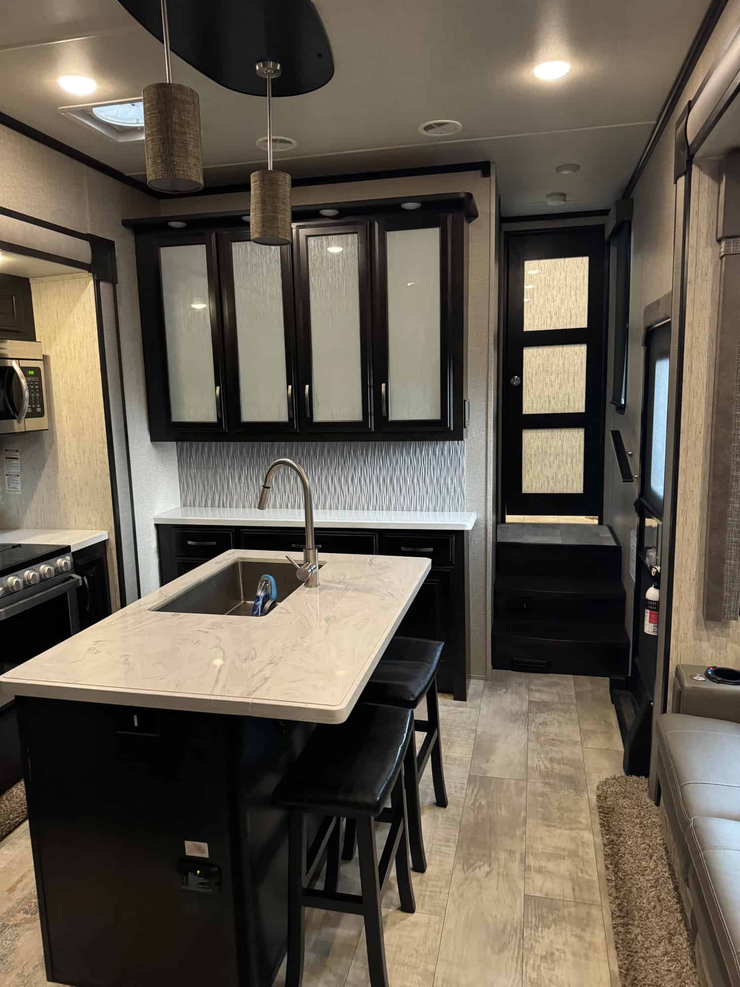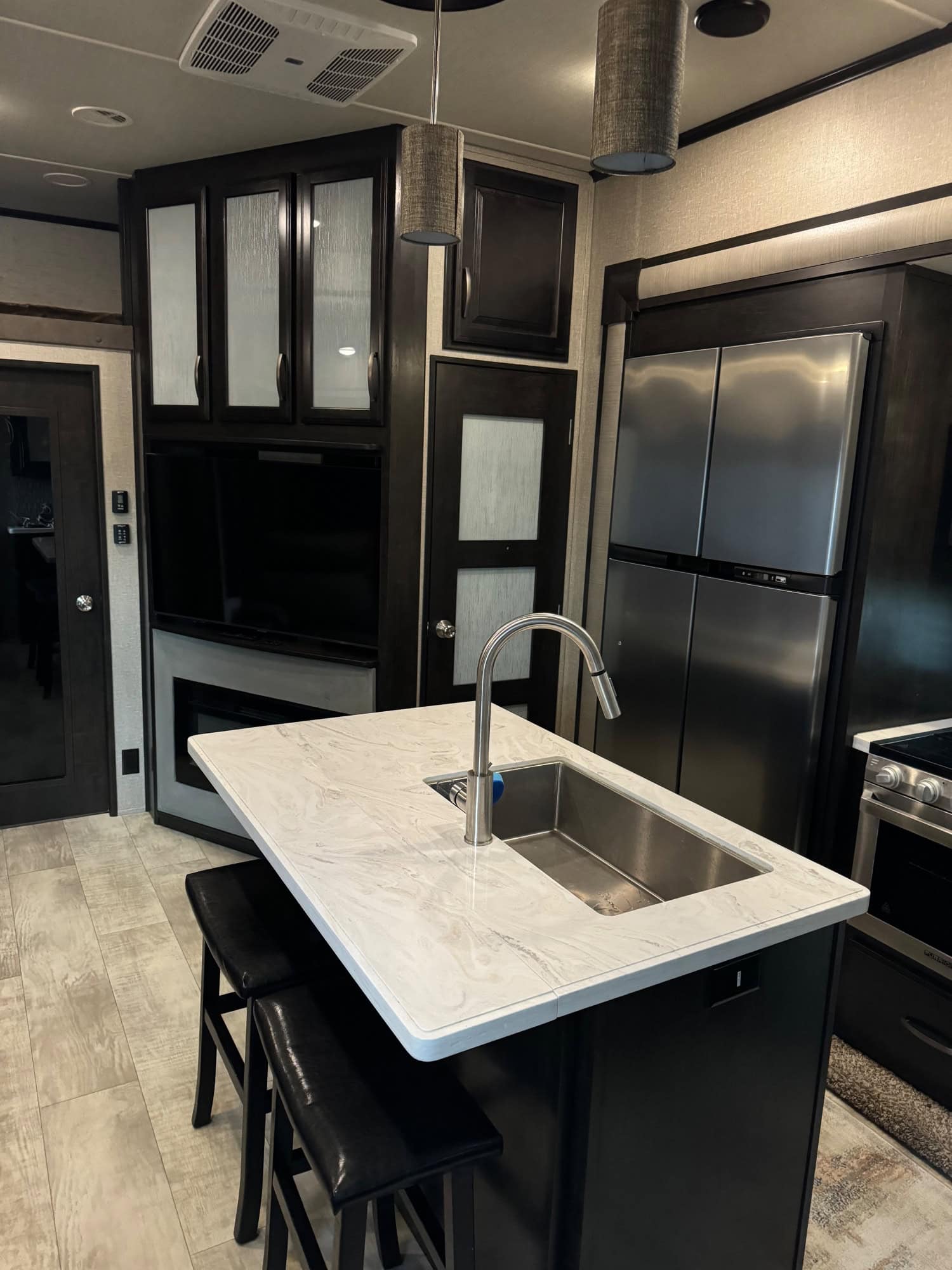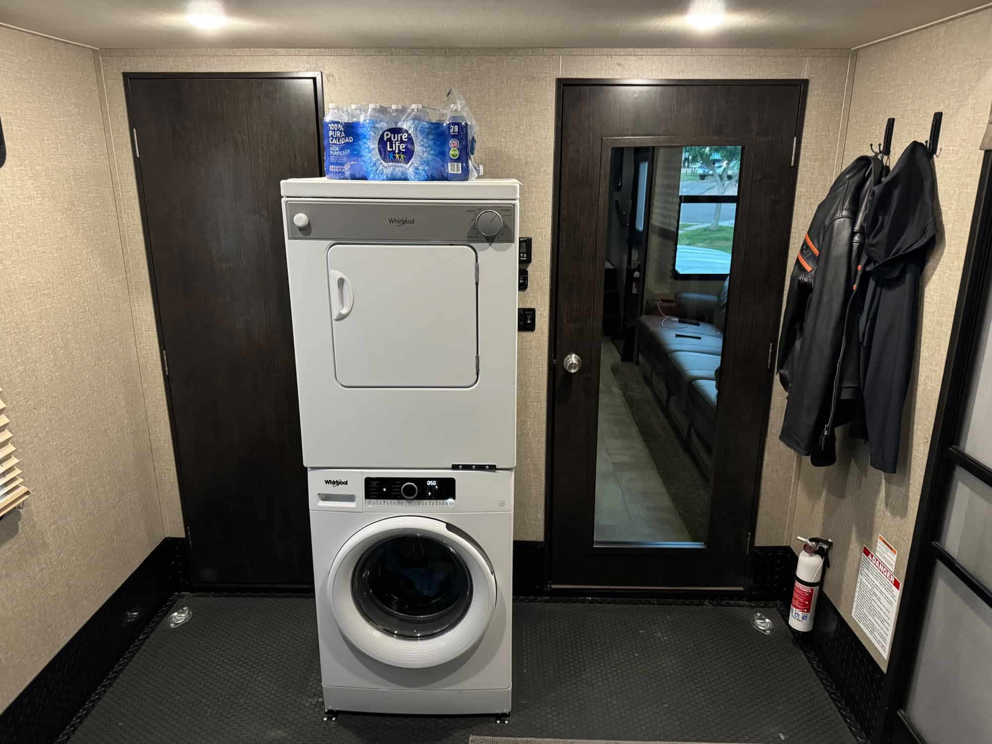 Additional amenities include an automatic leveling system, keyless entry on the rear door, two Samsung smart TVs, a spacious pantry, and a residential-style washer and dryer. Slide-out covers are installed, and the unit comes with most items needed for camping. Additional photos are available upon request.