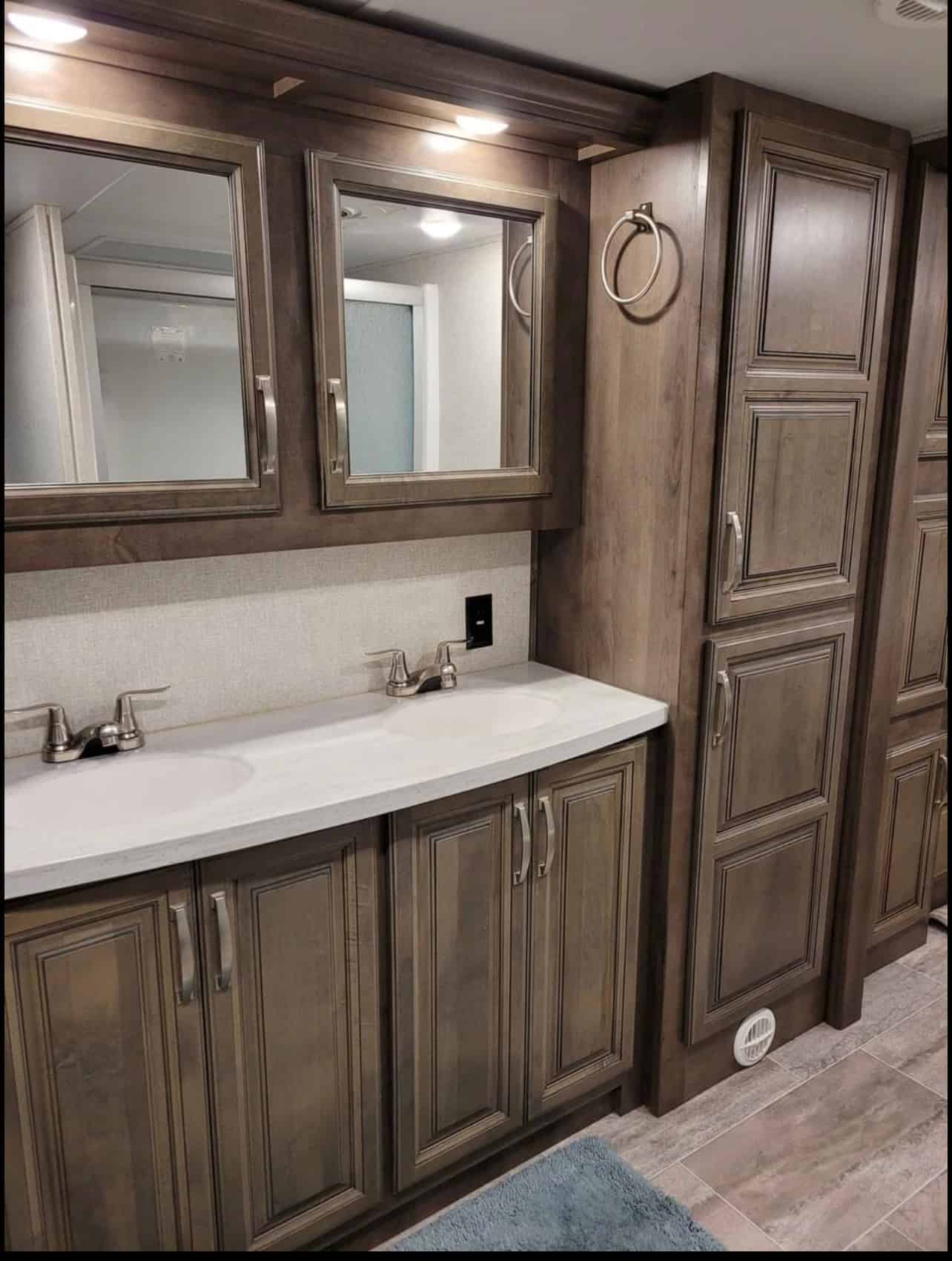 Solid surface counters, modern cabinetry, stylish lighting