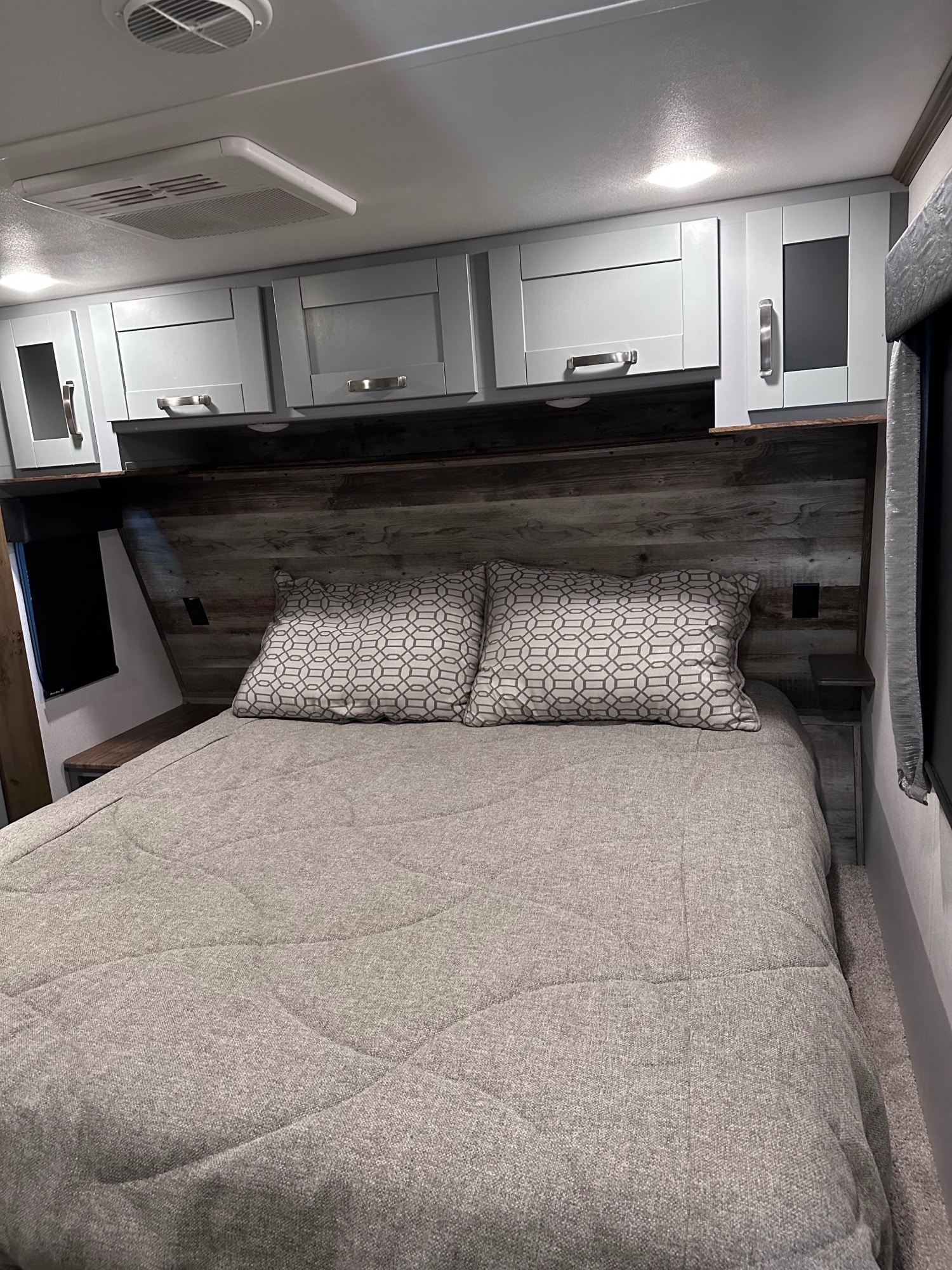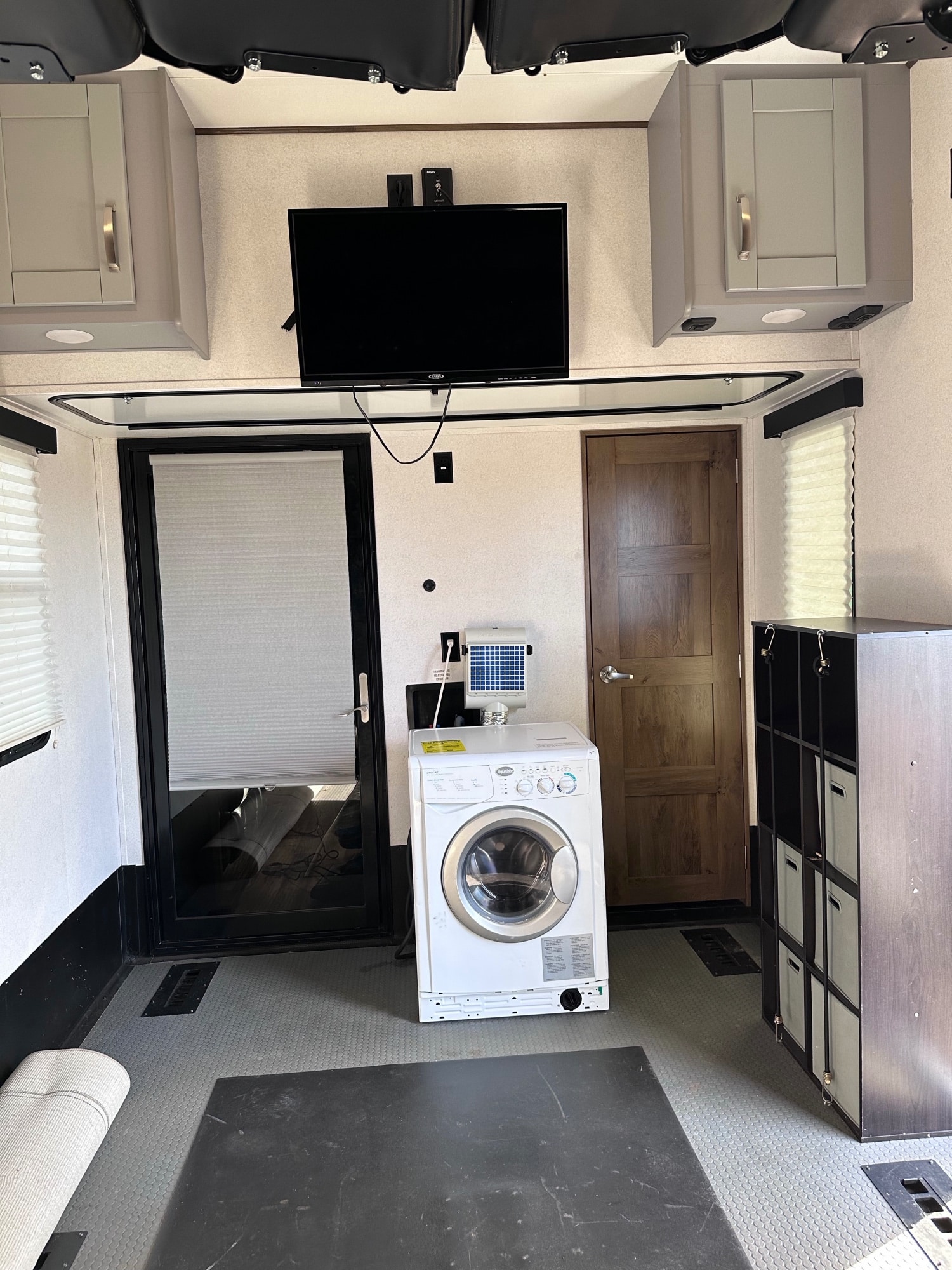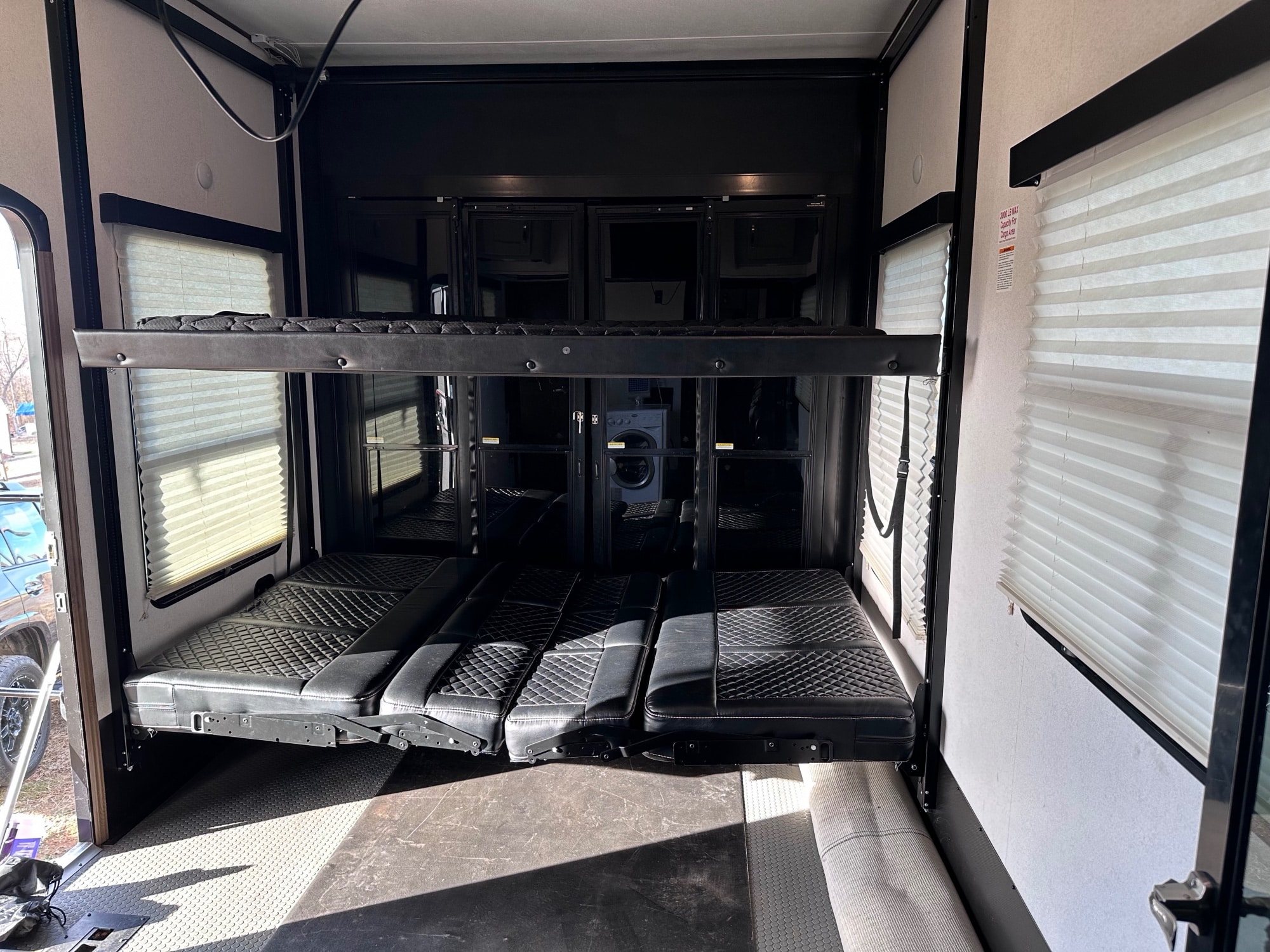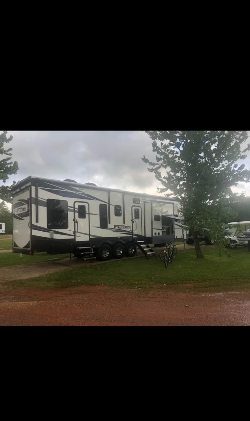 One owner toy hauler in great condition. Tons of storage, bath and a half, outdoor kitchen with TV, 3 slides, washer/dryer included, porch/deck with steps, all season doors in the garage, 3 awnings, loft overhead, heated/massaging couch, island with 4 stools, full size refrigerator/freezer, convention microwave, central vac system, 5500 generator, 3 AC units, winter prep package, king sized master bed with storage underneath, double queen beds in the garage, fireplace. Automatic leveling (6 position hydraulic), touch screen controls-can be controlled with app on phone. 13’ Garage