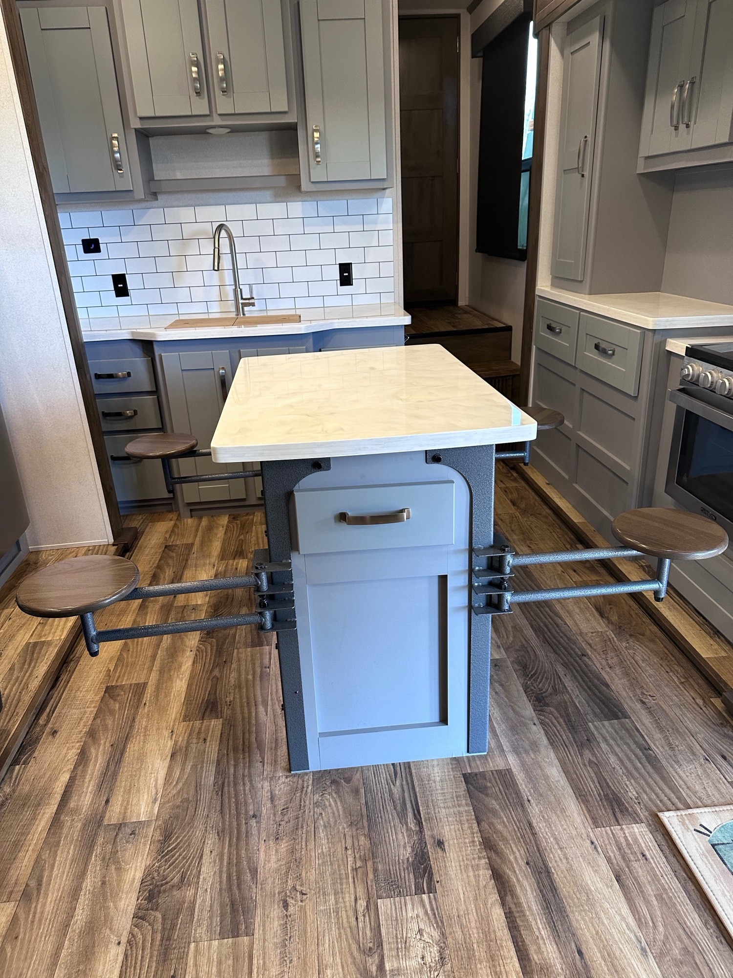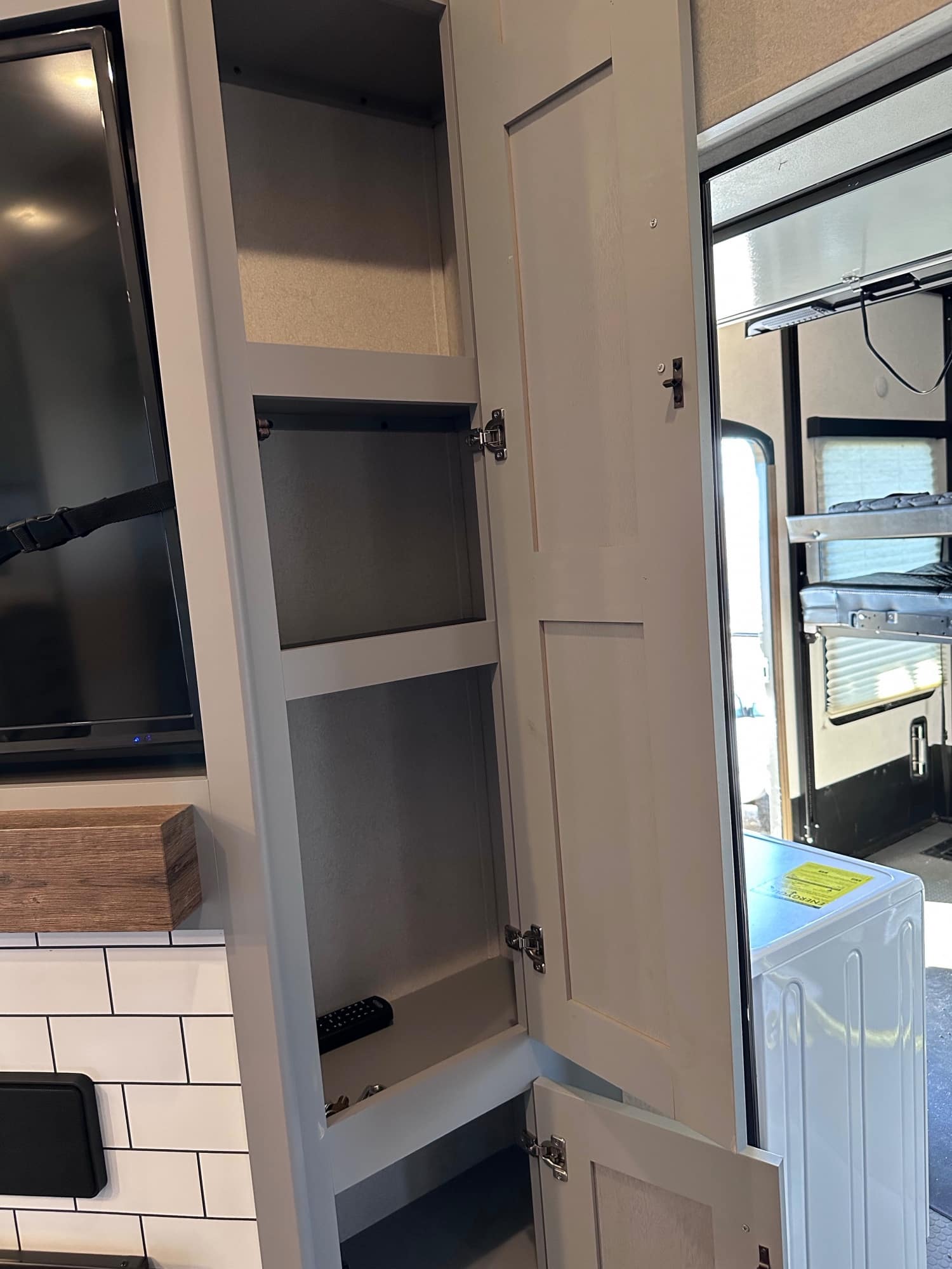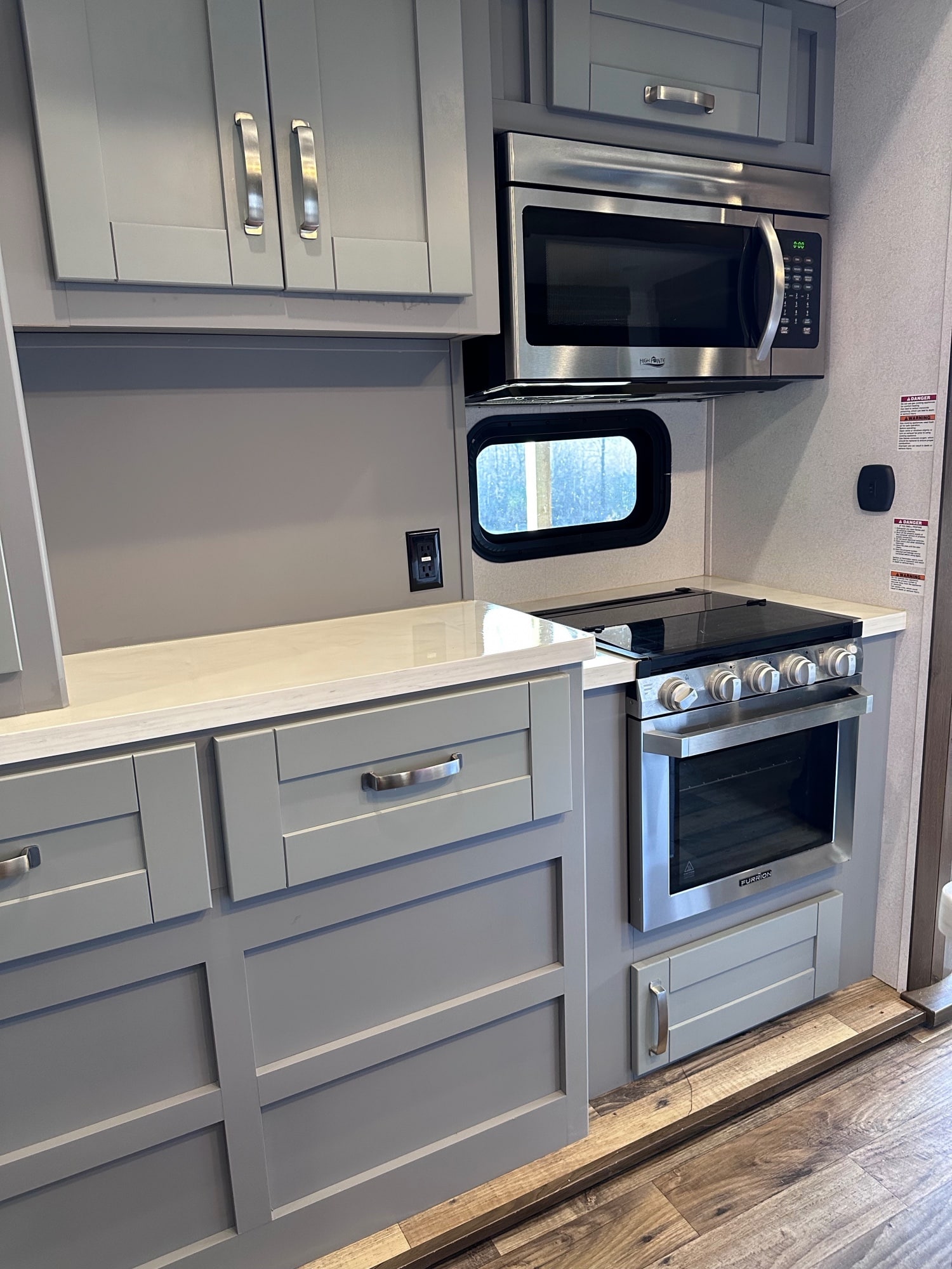 One owner toy hauler in great condition. Tons of storage, bath and a half, outdoor kitchen with TV, 3 slides, washer/dryer included, porch/deck with steps, all season doors in the garage, 3 awnings, loft overhead, heated/massaging couch, island with 4 stools, full size refrigerator/freezer, convention microwave, central vac system, 5500 generator, 3 AC units, winter prep package, king sized master bed with storage underneath, double queen beds in the garage, fireplace. Automatic leveling (6 position hydraulic), touch screen controls-can be controlled with app on phone. 13’ Garage