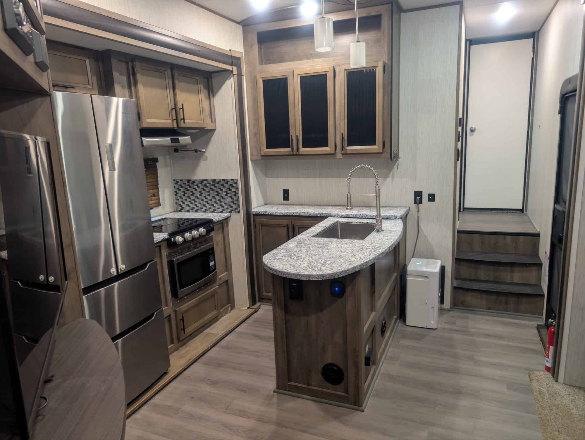 There is ample room to sleep 8 with a private, king sized master bed in the front, a king size drop-down bed and a twin sized loft bed in the cargo area with room for another bed beneath the drop-down bed. The cargo space is a generous 8×16 foot area that serves well for hauling ATVs or for living space.