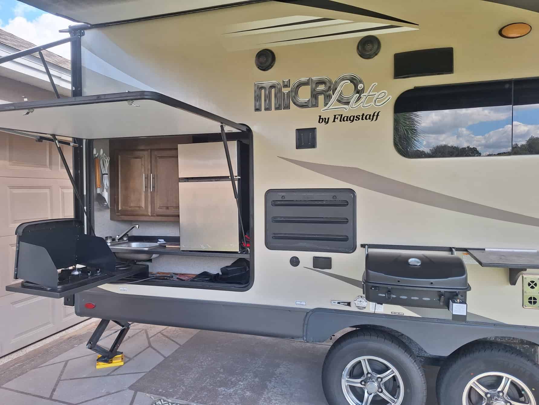 Front Murphy Bed with outside kitchen with extra stove, fridge/freezer, sink, and new wall mounted grill. Lots of storage spaces for a camper this size. Also comes with a 30 amp generator and a 100 watt solar panel to keep battery charged. Includes SOLO Fire pit, water hoses, 25′ extension power cord. Other extras include patio mat, dishes, utensils. Ready for the road. Tires new in ’23 (one new in July ’25 due to screw puncture – not a blowout) Includes 10,000 lb. Husky Centerline hitch system. See pix for more details.