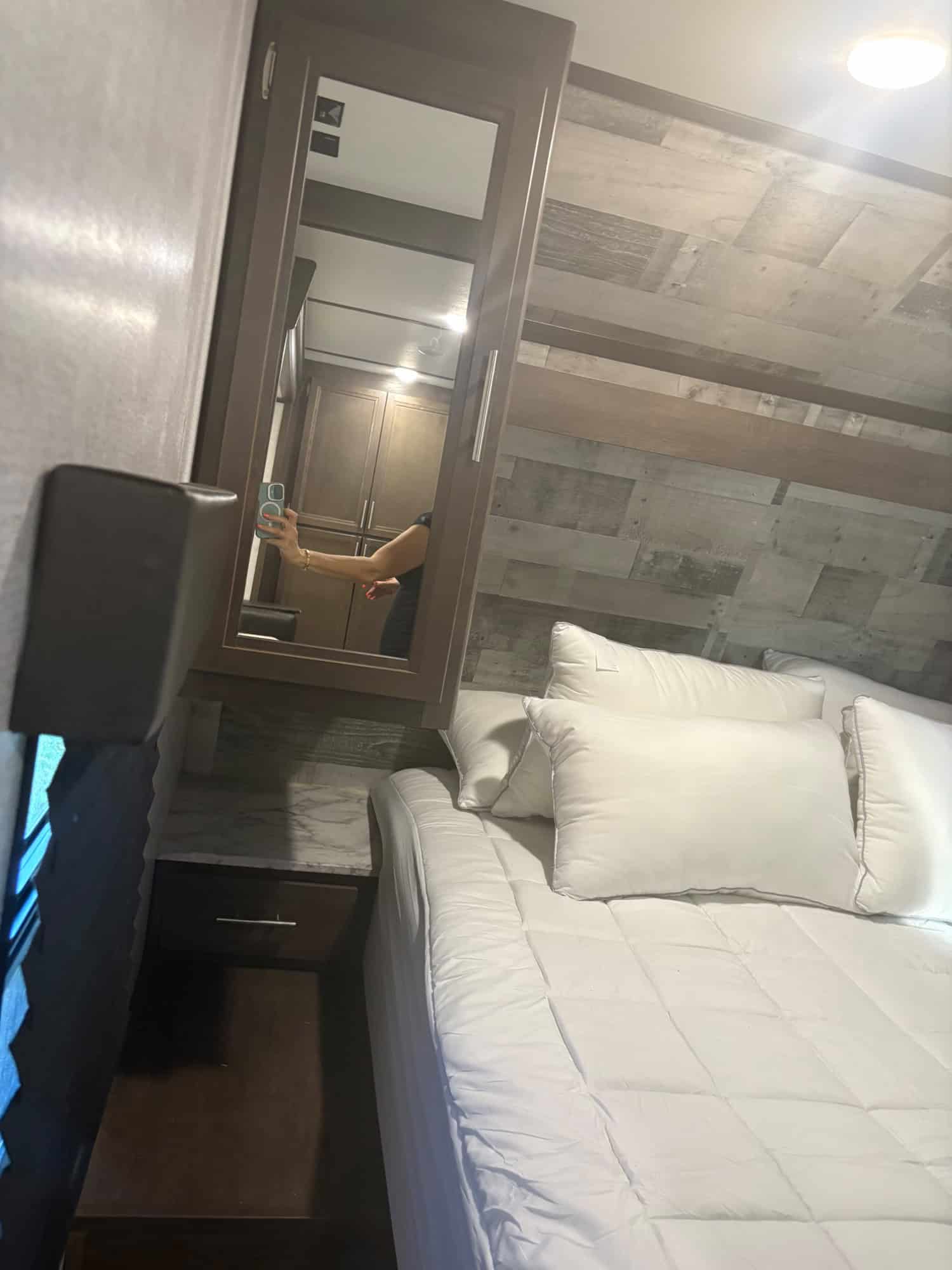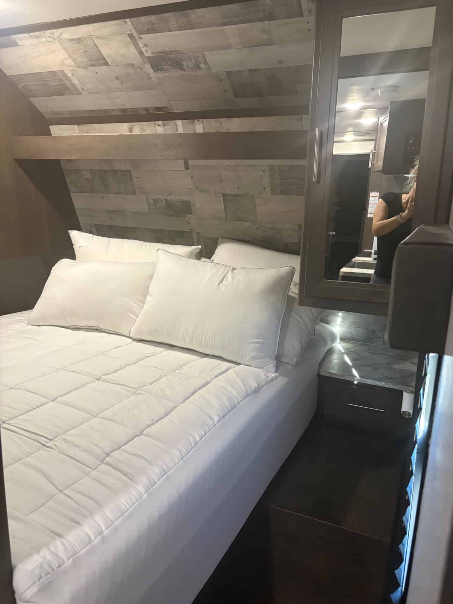 * Bed: Residential queen bed in the master, plus additional sleeping areas in the garage (e.g., U-shaped dinette, sofas)