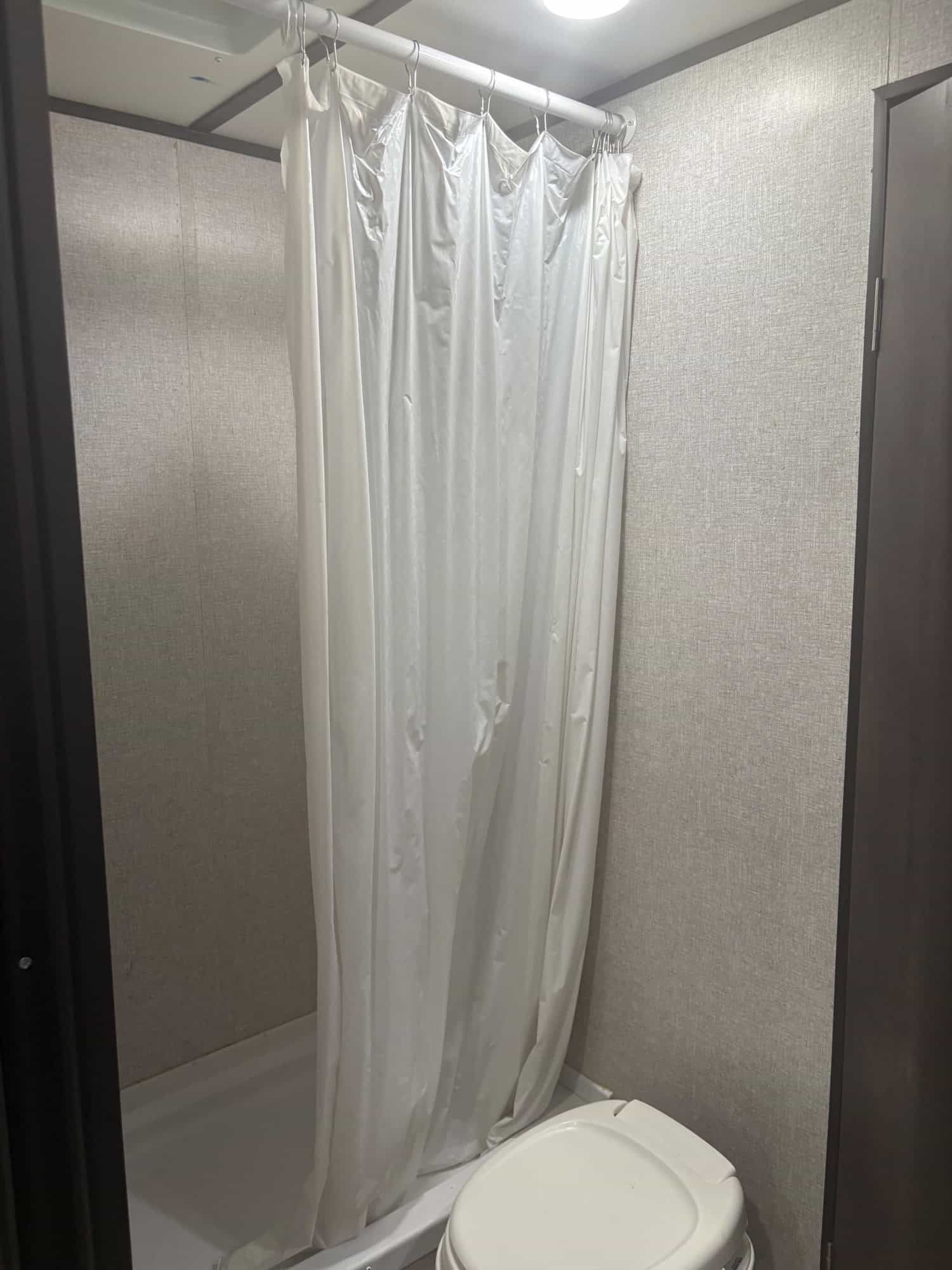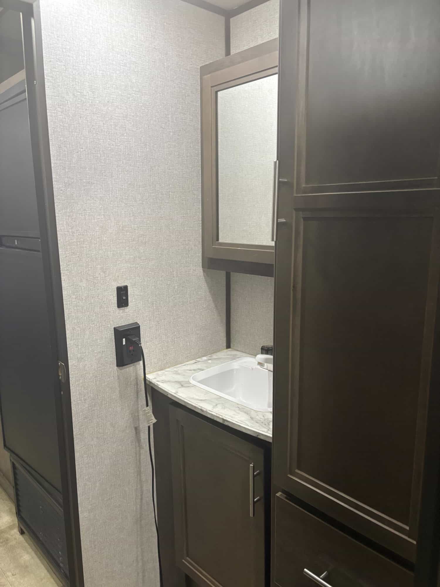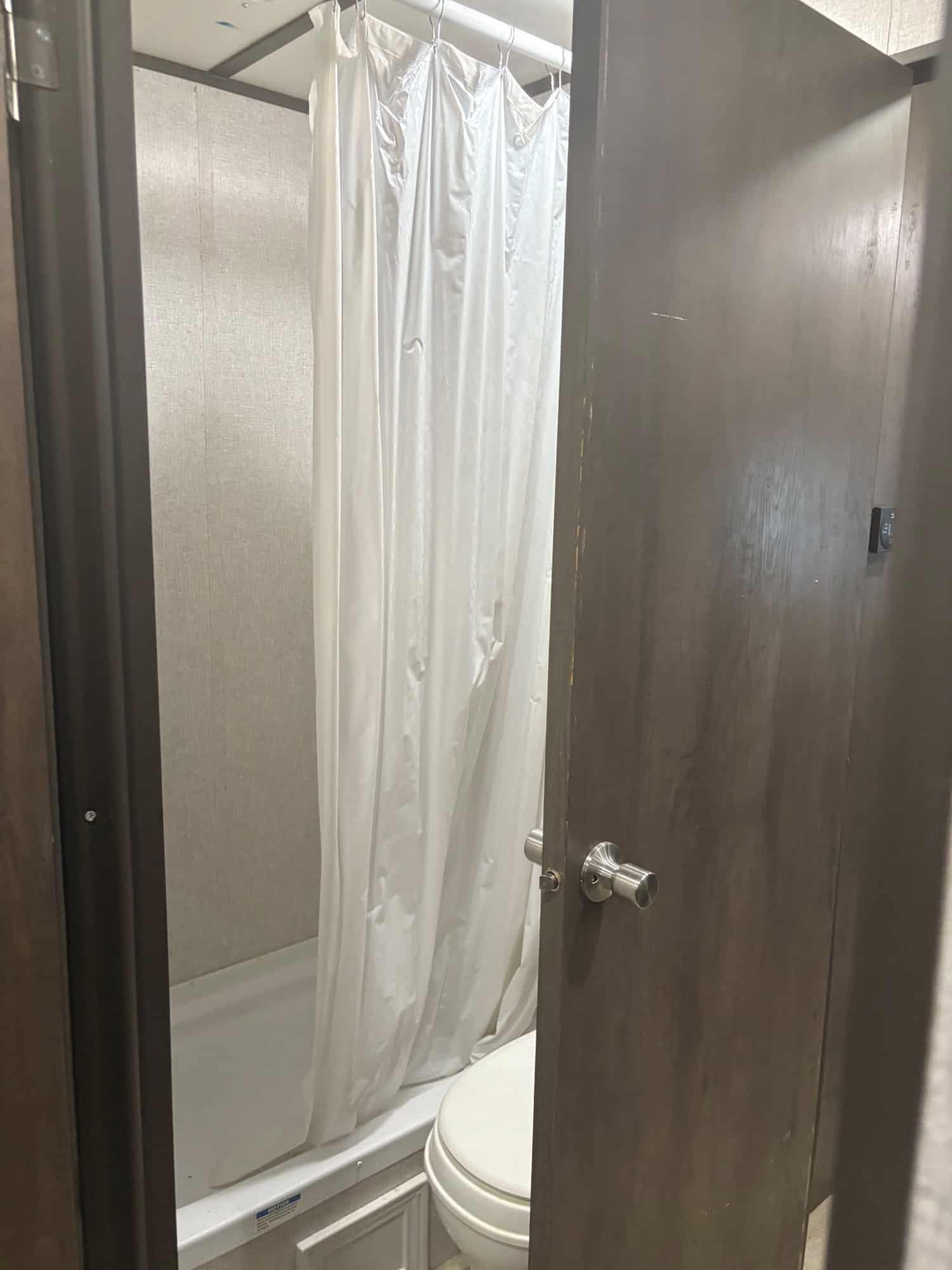 * Bathroom: Walkthrough washroom with shower, toilet, sink, and storage