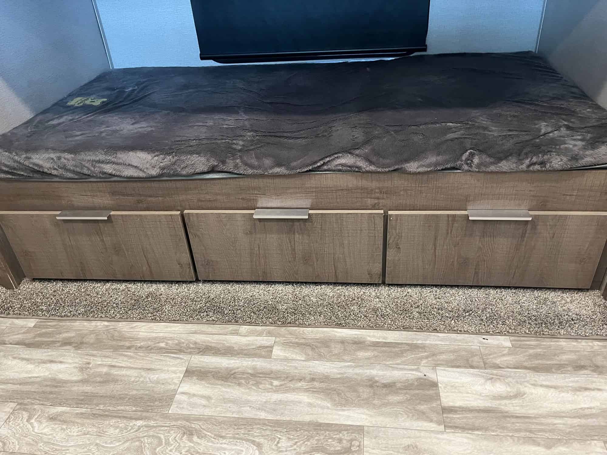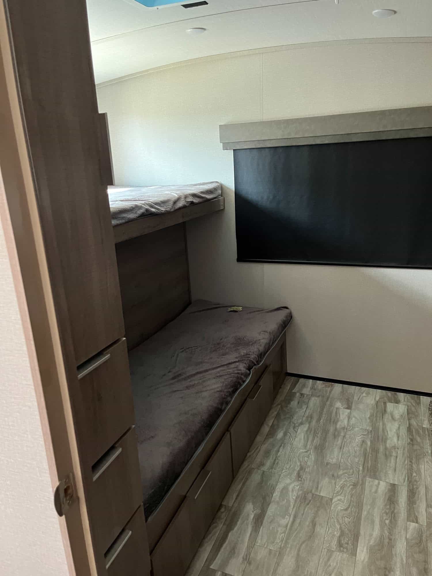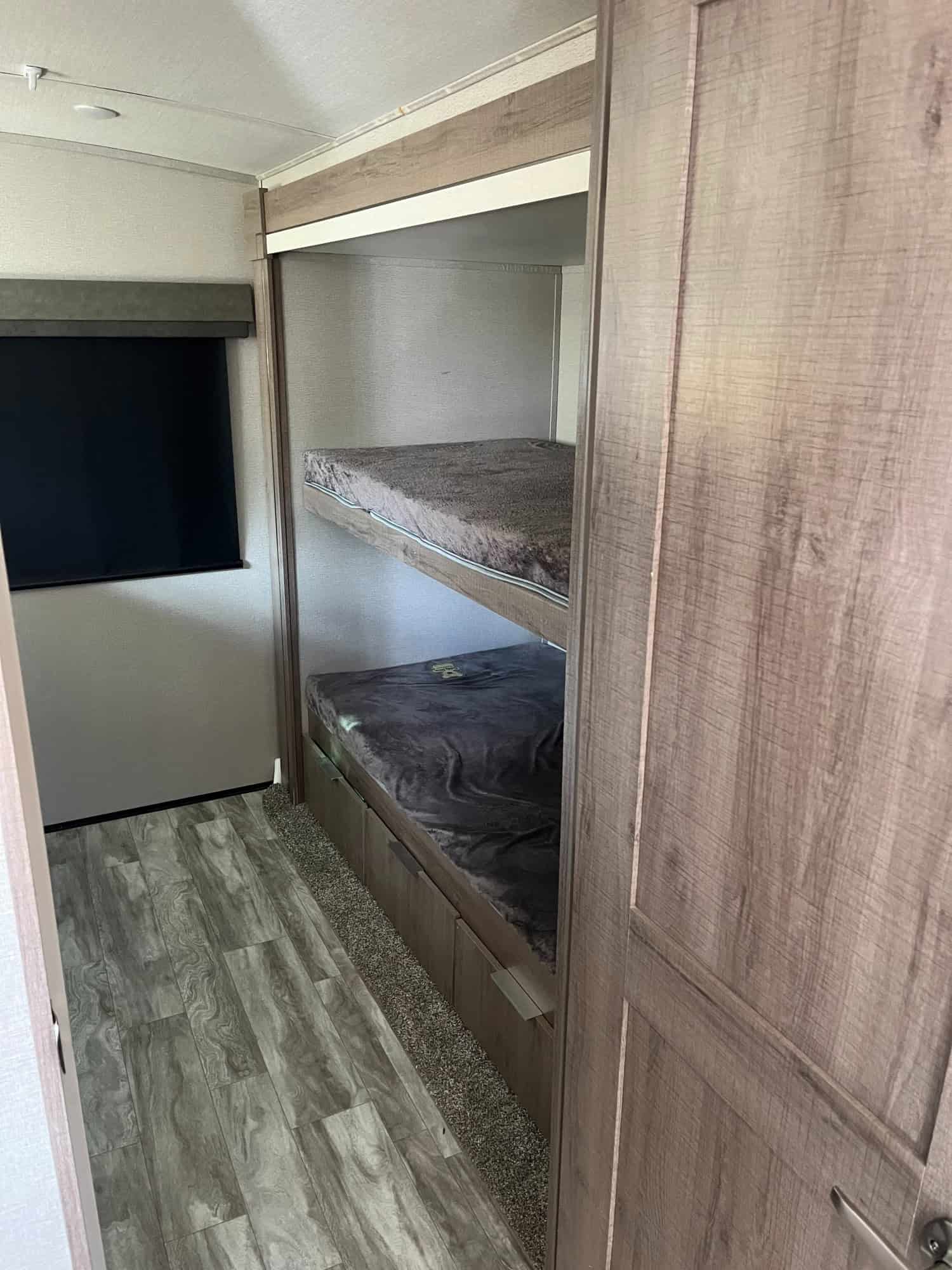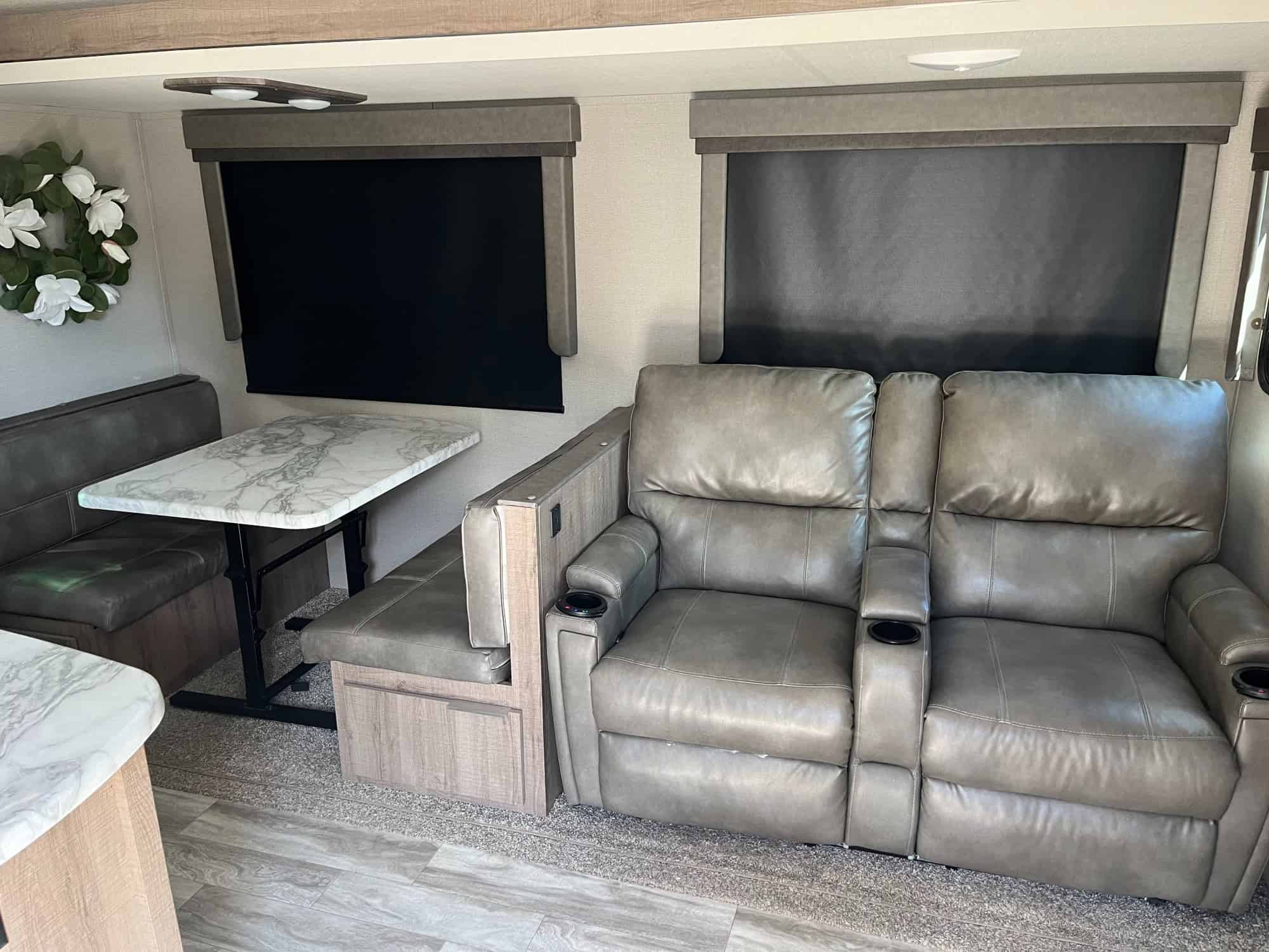 2020 Grand Design Imagine 3250BH – This well-designed, family-friendly travel trailer offers a comfortable layout that is perfect for weekend getaways or extended camping trips. With room to sleep up to 8 people, it features a private front queen bedroom, a bright central living area, and a large rear bunkhouse with four beds, making it ideal for families or guests. The dual-entry bathroom, accessible from both the main living area and the master bedroom, features a porcelain toilet, corner shower, sink, and medicine cabinet for convenience. The heart of the trailer is the open kitchen and living space, complete with a kitchen island, deep sink, large pantry with barn-style door, Furion stove, microwave, and an 8 cu. ft. refrigerator. The dinette converts into additional sleeping space, while the theater seating/recliners offer heat, USB ports, and cozy comfort. An electric fireplace and entertainment center add a welcoming touch. The private rear bunkhouse includes four bunks, storage, and TV prep, giving kids or guests their own space.