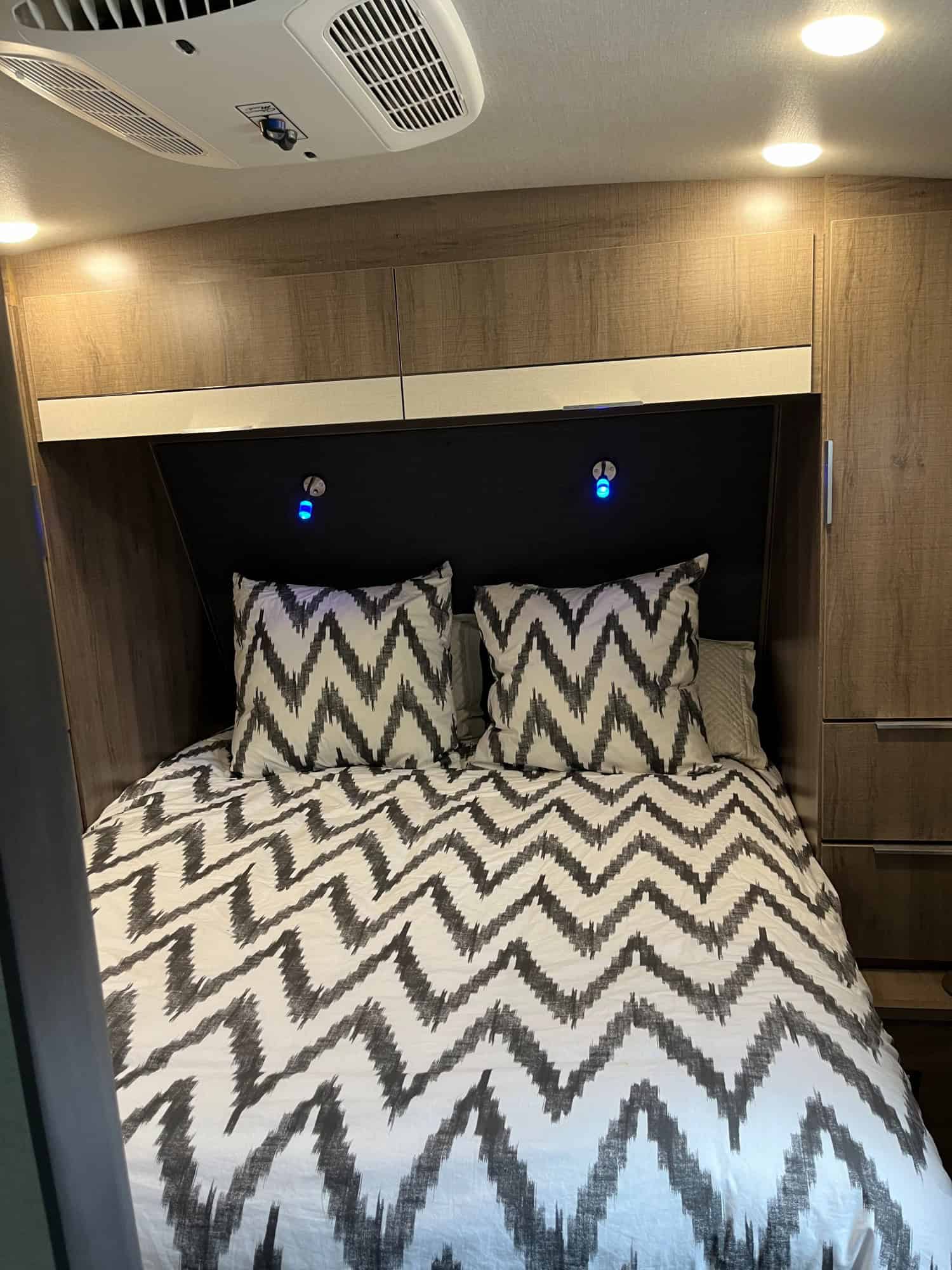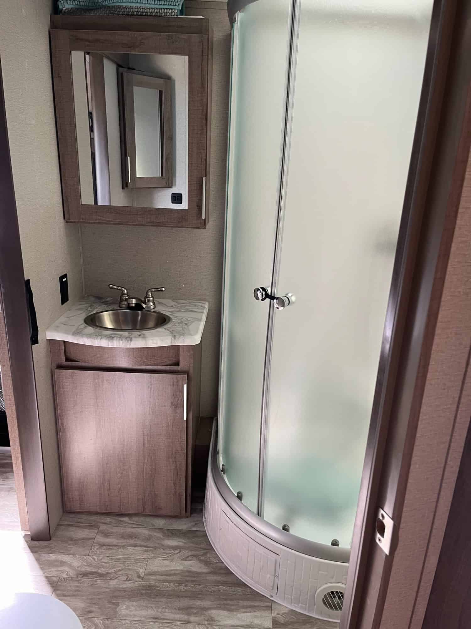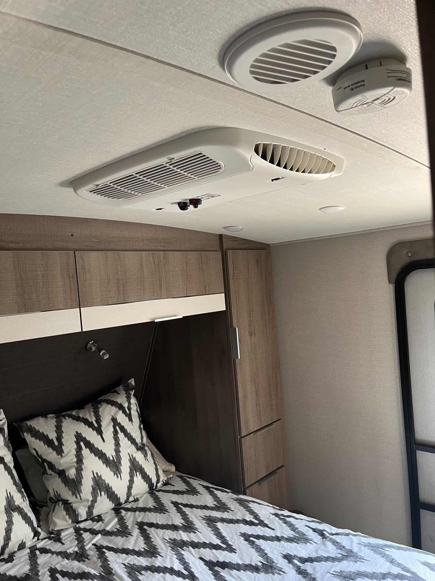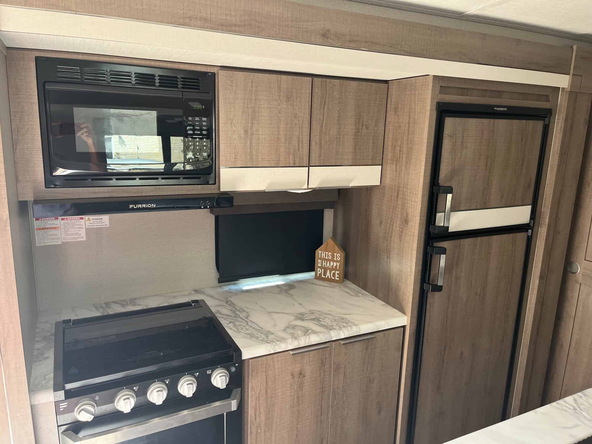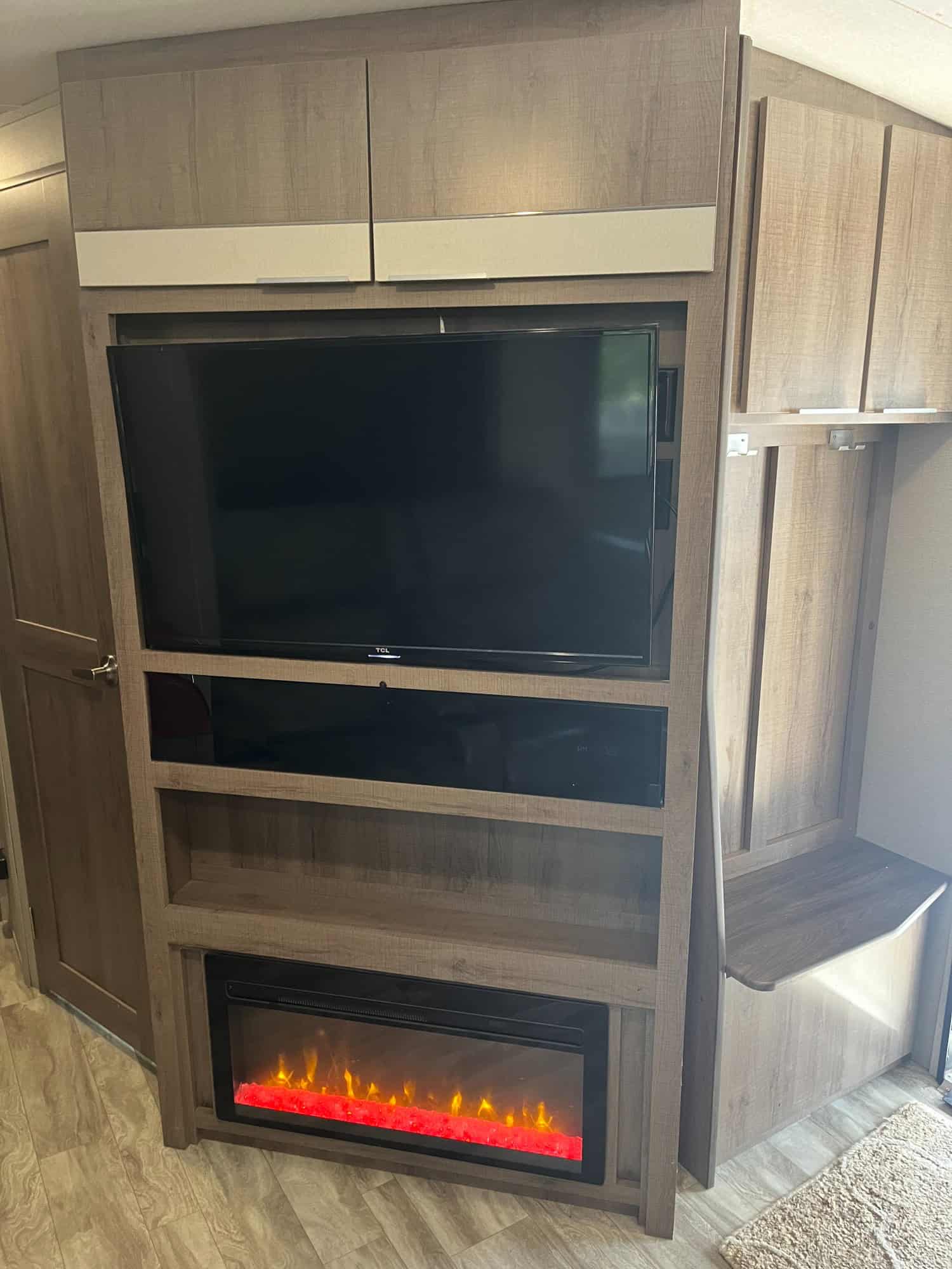 2020 Grand Design Imagine 3250BH – This well-designed, family-friendly travel trailer offers a comfortable layout that is perfect for weekend getaways or extended camping trips. With room to sleep up to 8 people, it features a private front queen bedroom, a bright central living area, and a large rear bunkhouse with four beds, making it ideal for families or guests. The dual-entry bathroom, accessible from both the main living area and the master bedroom, features a porcelain toilet, corner shower, sink, and medicine cabinet for convenience. The heart of the trailer is the open kitchen and living space, complete with a kitchen island, deep sink, large pantry with barn-style door, Furion stove, microwave, and an 8 cu. ft. refrigerator. The dinette converts into additional sleeping space, while the theater seating/recliners offer heat, USB ports, and cozy comfort. An electric fireplace and entertainment center add a welcoming touch. The private rear bunkhouse includes four bunks, storage, and TV prep, giving kids or guests their own space.