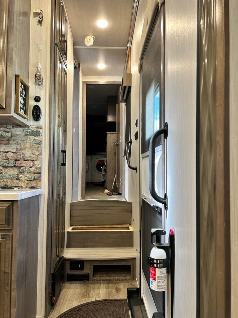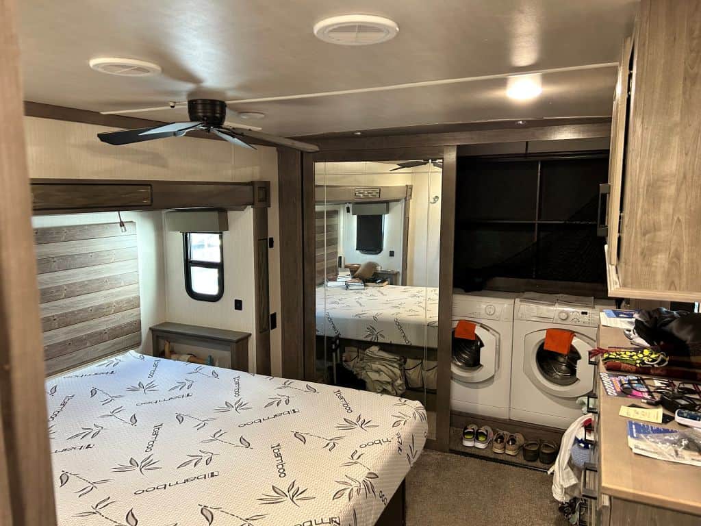 Going up the steps to the front of the RV you’ll find that storage has been added under the steps and the connection for the vacuum cleaner is also there. In the large bathroom there’s a double sink, porcelain toilet, spacious 48” shower, and linen closet. Next door you’ll find the bedroom with a queen bed and bedside tables, nine drawer dresser with added overhead cabinet, large closet with shelves and hanging space, overhead fan, and a Splendide washer and dryer. USB ports are throughout the RV.
