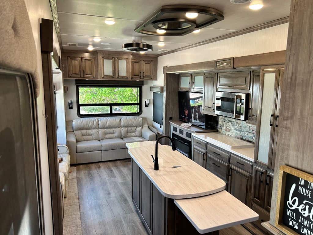 Enter the 41’ unit via the upgraded MORryde steps with banister and extended door handle. The kitchen is the heart of every home and this one is no exception. It features a full size stainless steel residential refrigerator/freezer, large three burner cooktop, microwave/convection oven, an island with extensions on each end, and abundant pantry and storage space. The space is well lit and features a new 20”low-profile Lediary light with six speed fan. The adjoining living space showcases an entertainment center with 55” smart TV, electric fireplace with thermostat, and radio/CD player. There’s also a sofa with sofa bed, power theatre recliners, desk/table, and storage cabinets.
