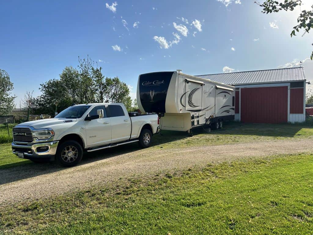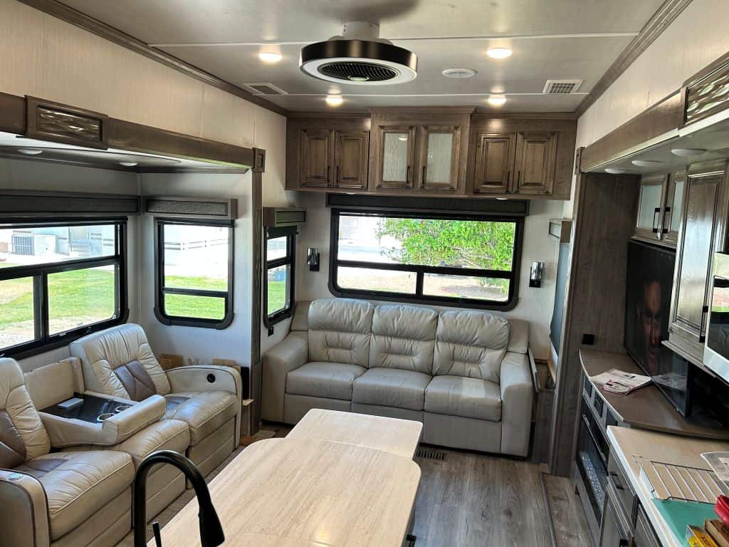Outside you can enjoy the 32” TV and shade from two awnings while relaxing in the fresh air. There’s plenty of storage space under the living space and slide toppers over each slide. Other specifics include a Truma tankless on-demand water heater, water softener, water filter, two grey tanks and one black tank each with a heater, two air conditioners, Lippert six point hydraulic leveling system, outdoor shower, Lippert Trail Air air ride hitch coupler with capture plate, 200 watt solar panel with solar prep, Dexter Nev-R-Adjust brakes and Dexter E-Z Flex suspension. The RV has been well cared for with regular annual maintenance, improvements, and upgrades by Amish Family RV (Orvan).