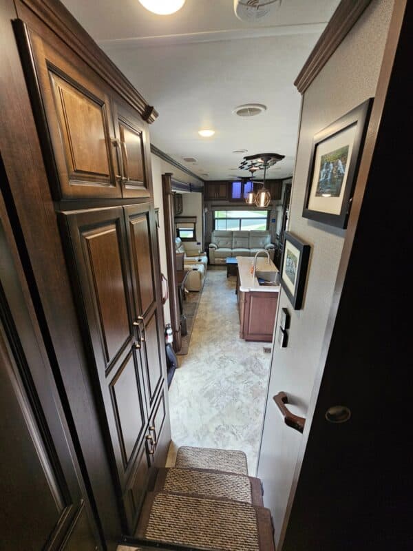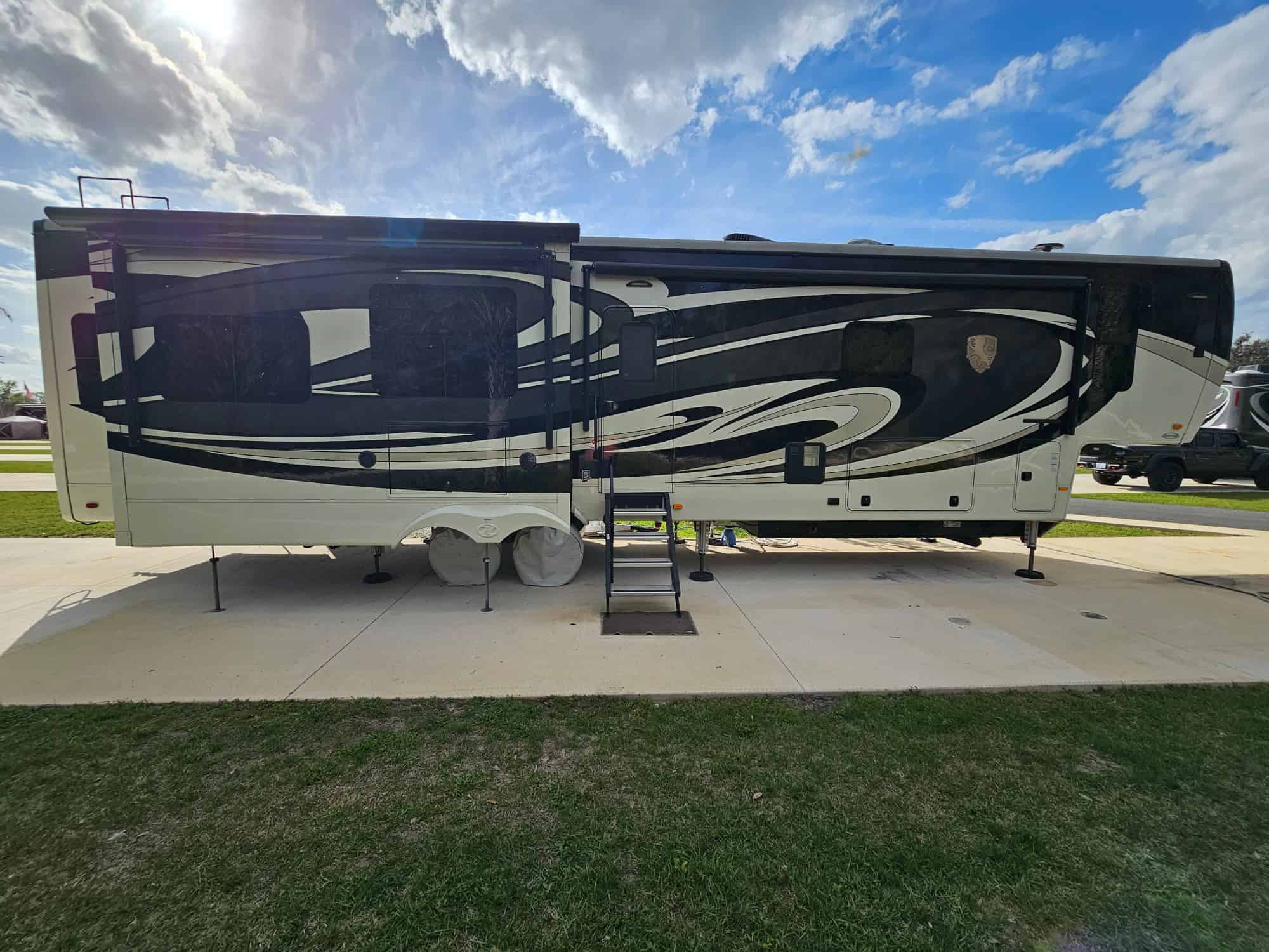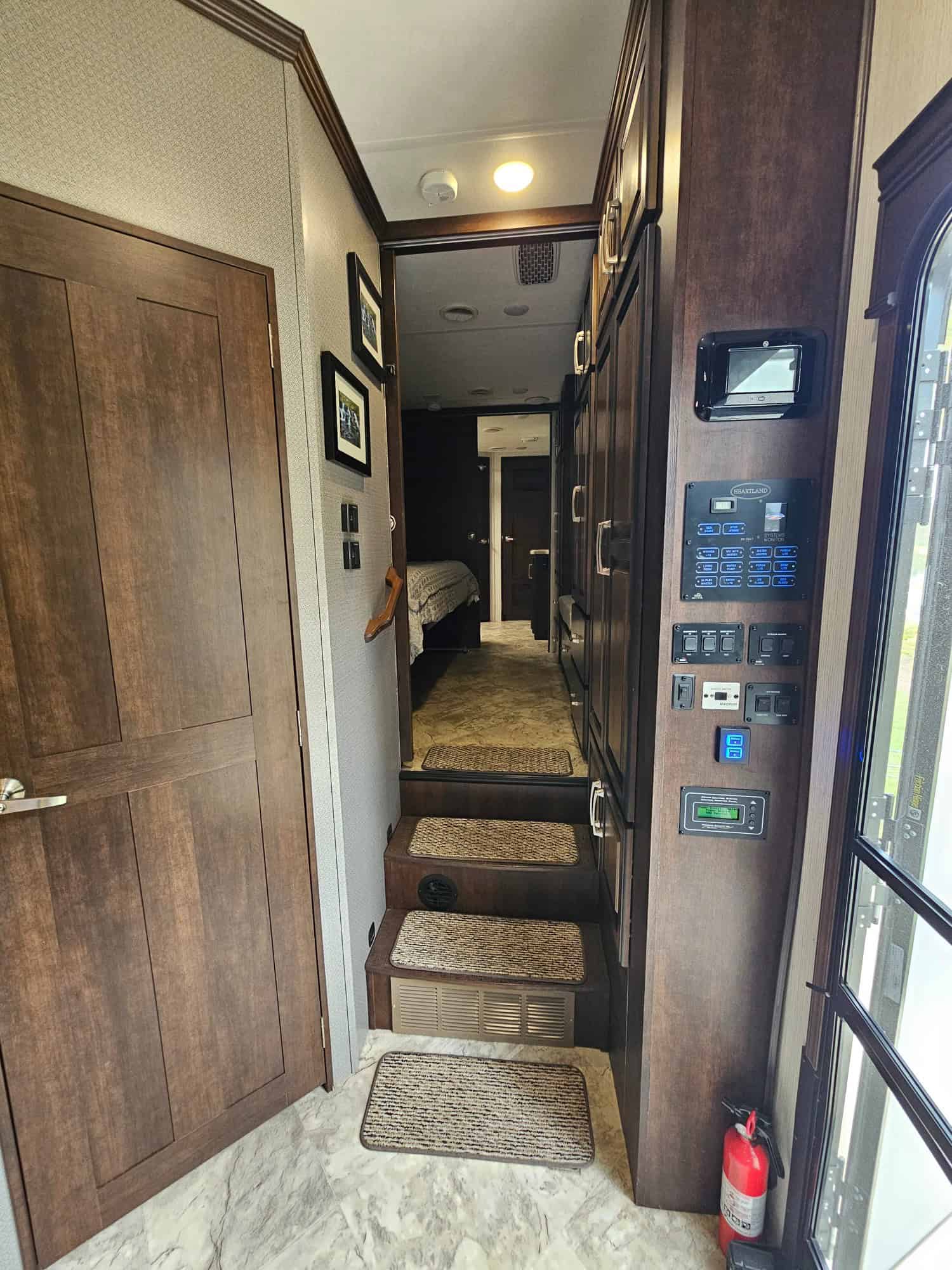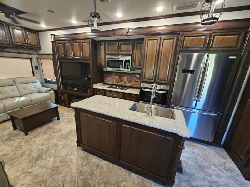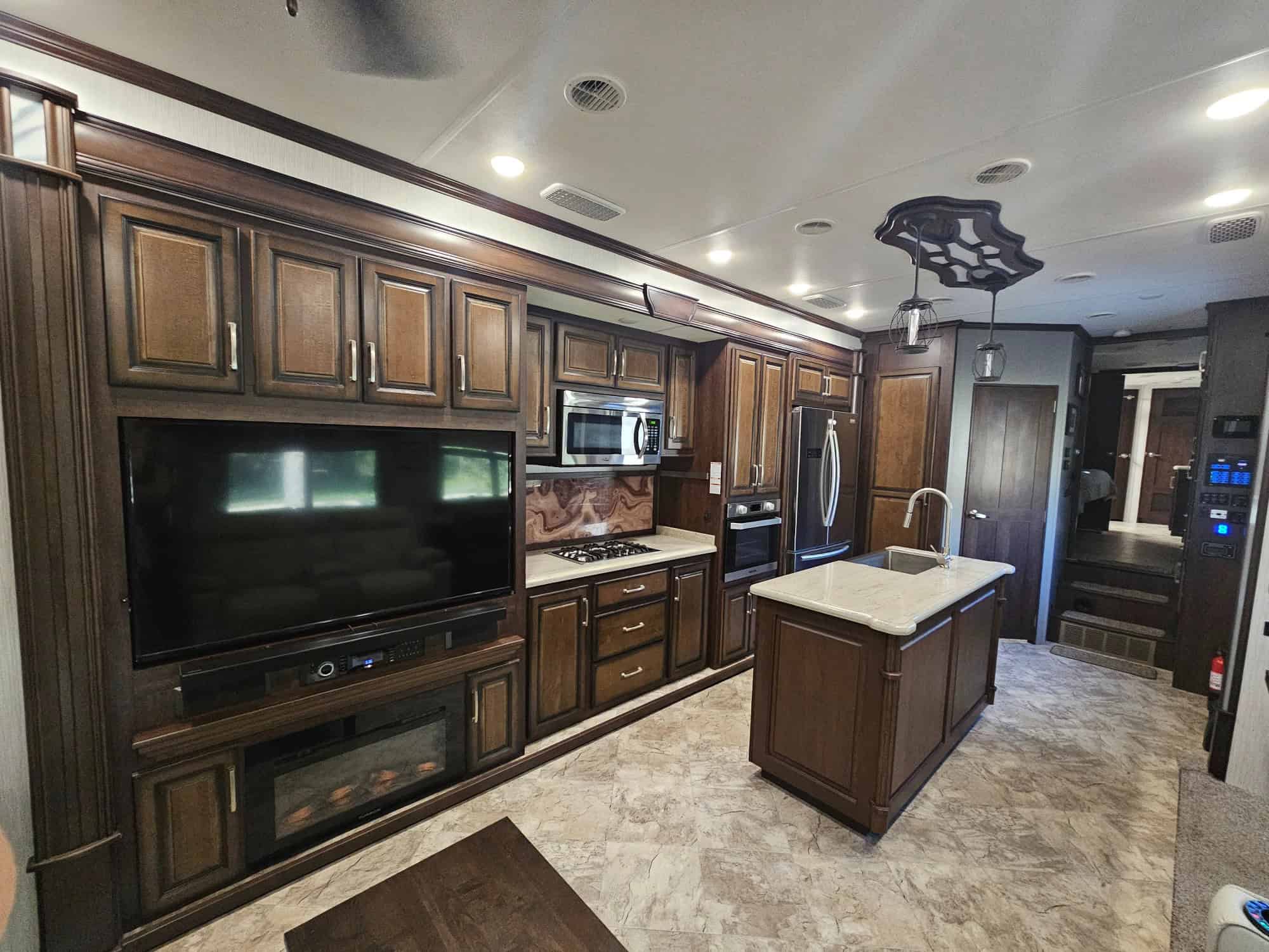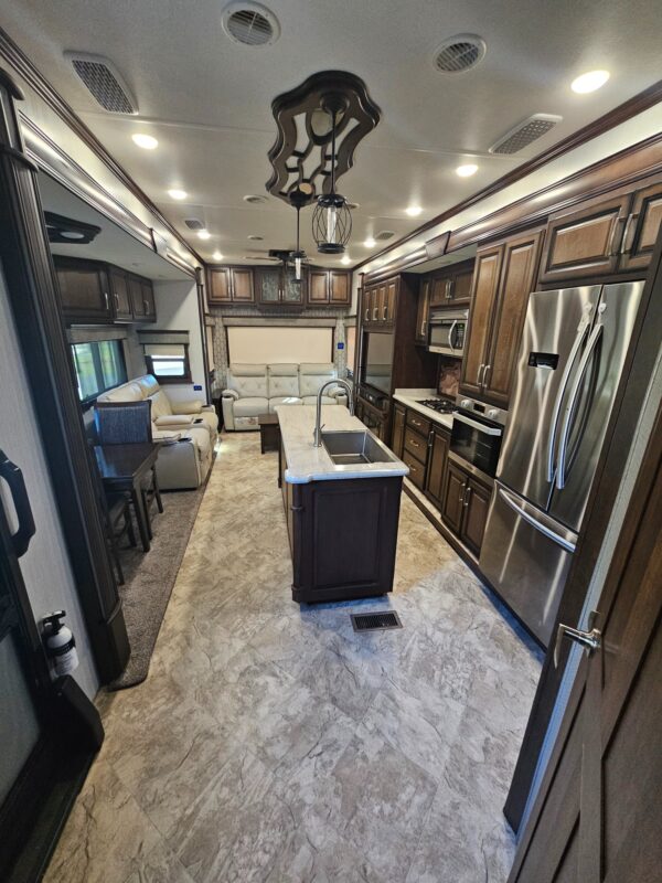 Heartland Landmark 365 fifth wheel Newport highlights from: Opposing Slides with Awnings,55″ TV with Soundbar in Living Room, TV in Primary Suite, Outdoor TV, Full Bathroom with walk-in shower, Primary Suite, Walk-In Closet, Laundry Closet with washer-dryer. Half Bath, Large Island with farmhouse sink, The large opposing slides are what create an open and inviting space in the back of this unit so that you can gather with friends on the sofa with end tables while you watch something on the TV with soundbar. Plus, if you are in the kitchen creating a delicious meal on the three-burner gas cooktop or washing dishes in the farmhouse sink or with the convenience of the Fisher-Paykel dishwasher, you can still be a part of the fun. You can use the table with chairs to eat dinner or play a game, with a pull-out extension for more table space. What fun it will be to experience the exclusive list of features found in the Landmark 365 fifth wheels from Heartland RV! You will have smooth rides to every campsite with the 8,000 LB Dexter axles, the 17.5″ tires, and the Mor/Ryde suspension system, and the high-gloss full body paint and frameless dual-pane windows, Yeti extreme cold winter package. DirecTv Rooftop Satellite System. The interior is full of fantastic and helpful features, like a ceiling fan, a First Alert safe, and USB outlets. Plus, you will always want to make time to sit back and relax on the power theater seating with heat and massage. Well maintained! One owner. $65,000 OBO.