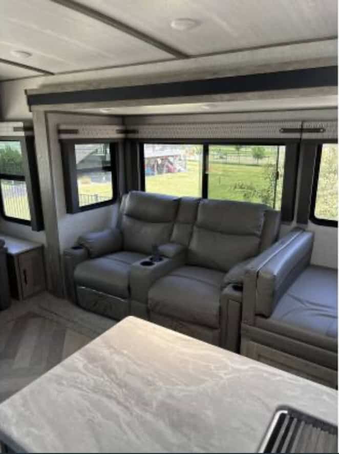 Inside, you will find a spacious living area with plush seating, a well-equipped kitchen, and a cozy sleeping area. The large windows throughout the trailer let in plenty of natural light and offer stunning views of the great outdoors. The kitchen comes equipped with modern appliances, ample storage space, and a large countertop for easy meal preparation.