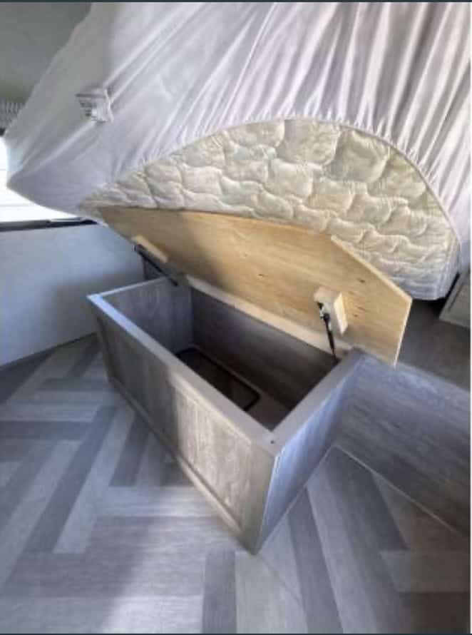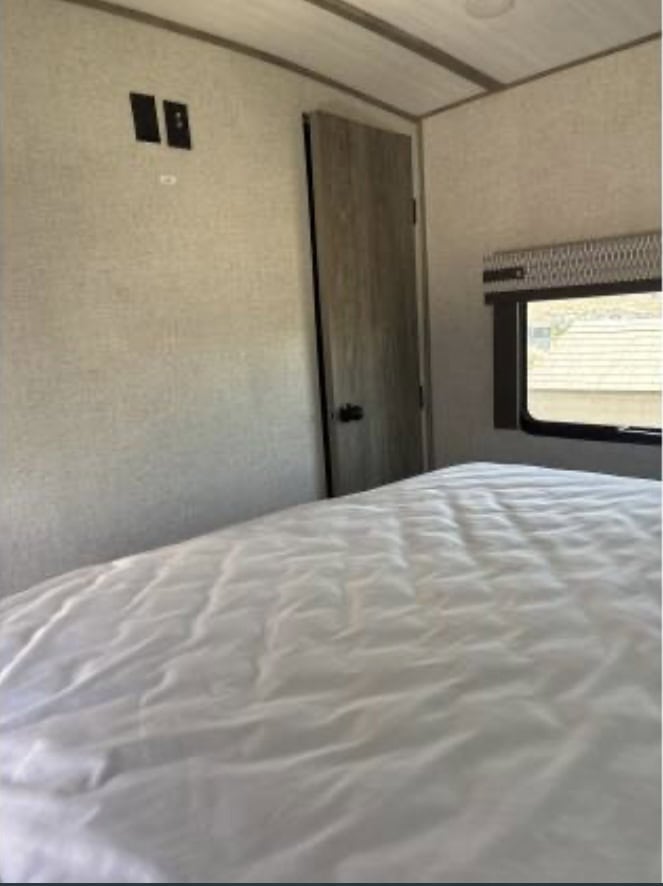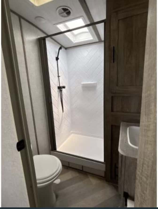 The bedroom features a comfortable queen-sized bed, nightstands, and plenty of storage space for all of your belongings. The bathroom is well-appointed with a shower, toilet, and sink, ensuring that you have all the comforts of home while on the road.