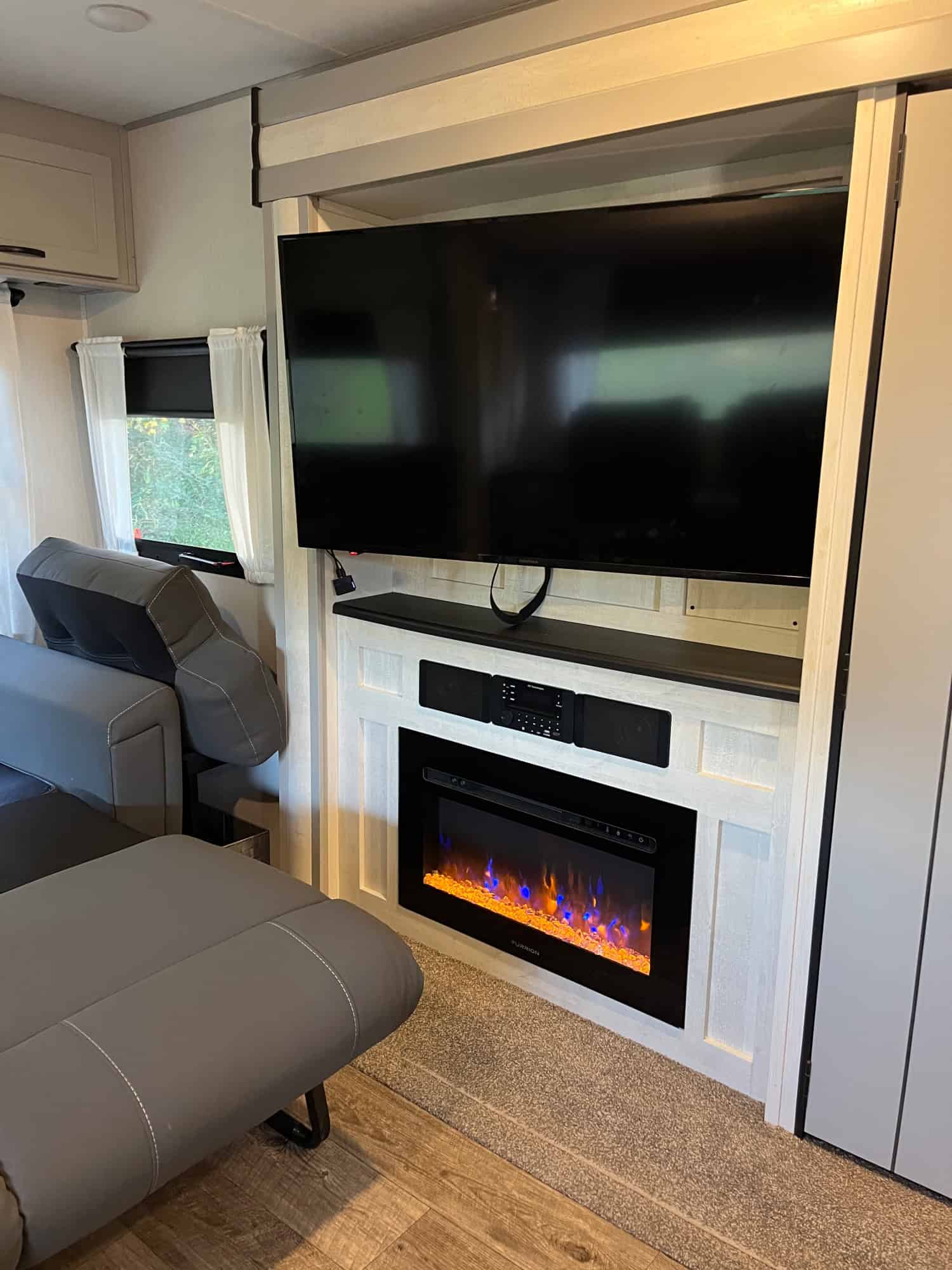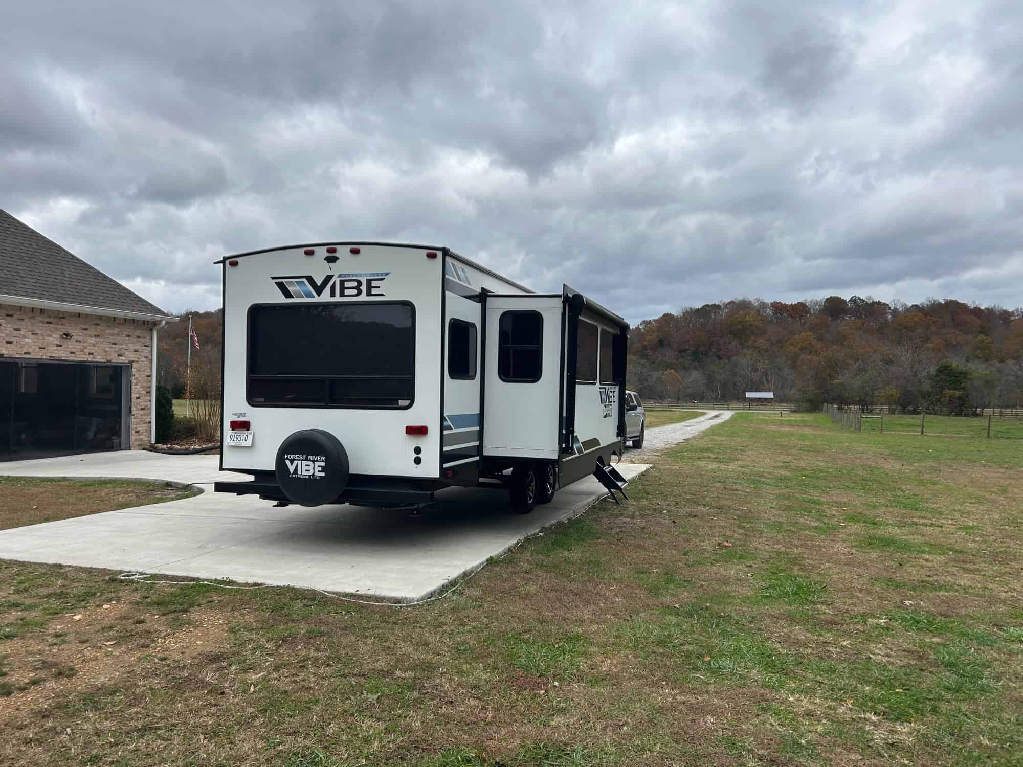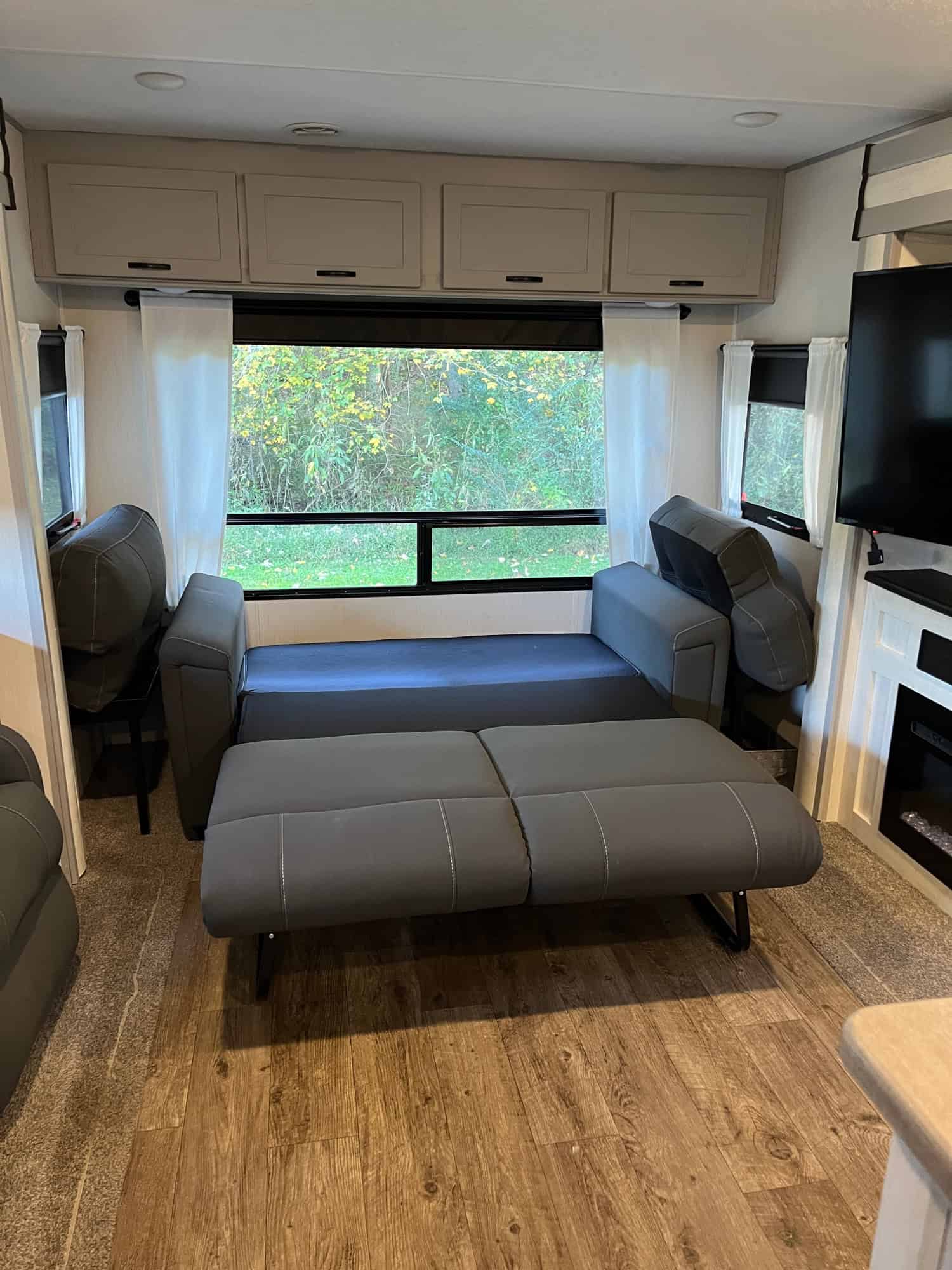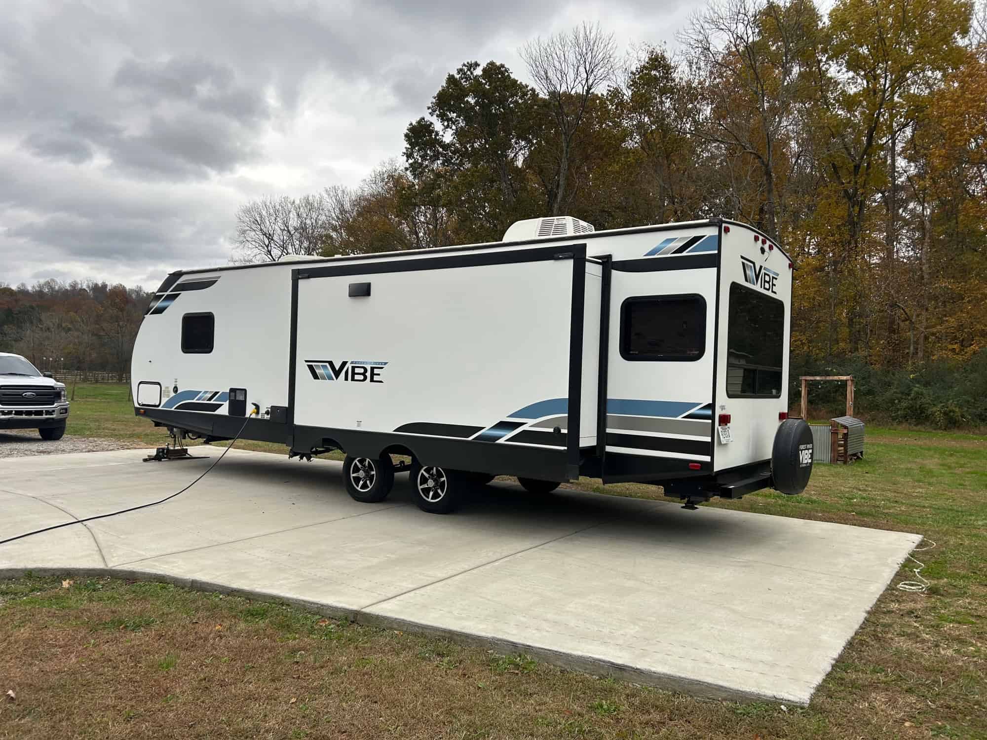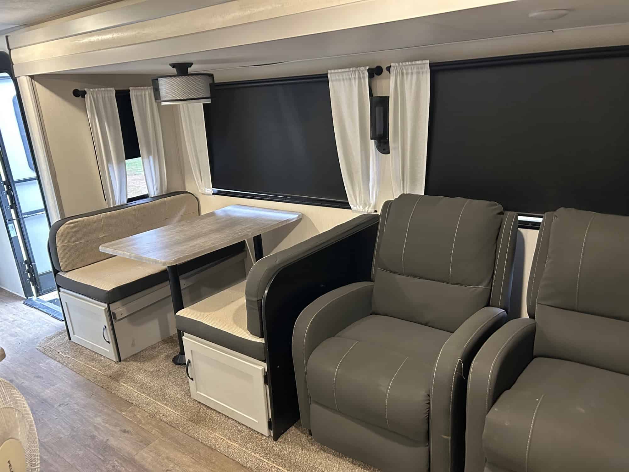 34 foot long – sleeps 6 – trifold sofa in living room that folds down to bed (not jack knife) – kitchen table makes bed – 3 inch foam for all beds – queen in bedroom – two awnings – storage underneath – weight distribution hitch – electric or gas water heater – solar battery system – fireplace – darkening pull-down shades – kept under pole barn entire time – very nice camper, just don’t have time to use it! DICKSON, TN