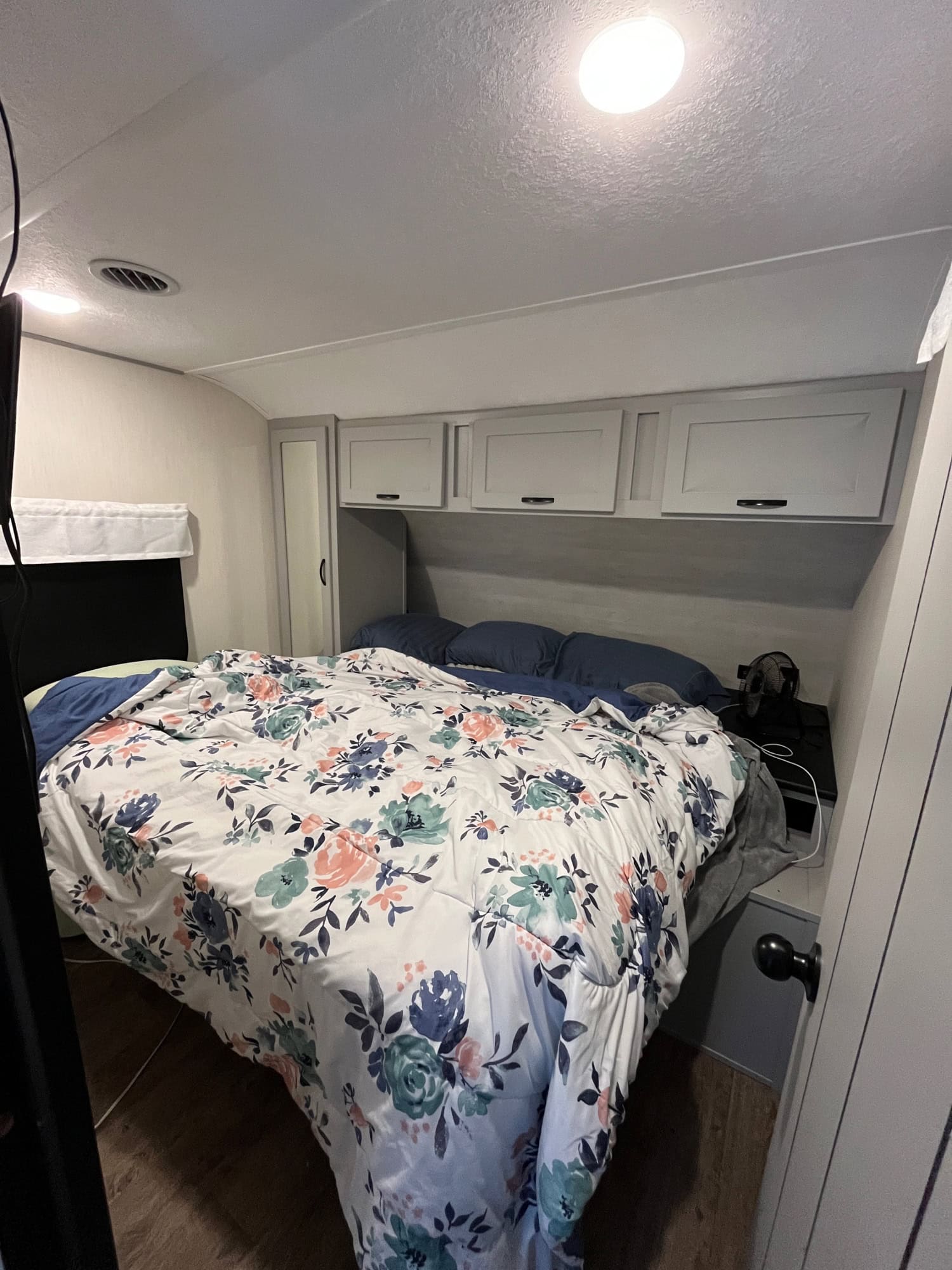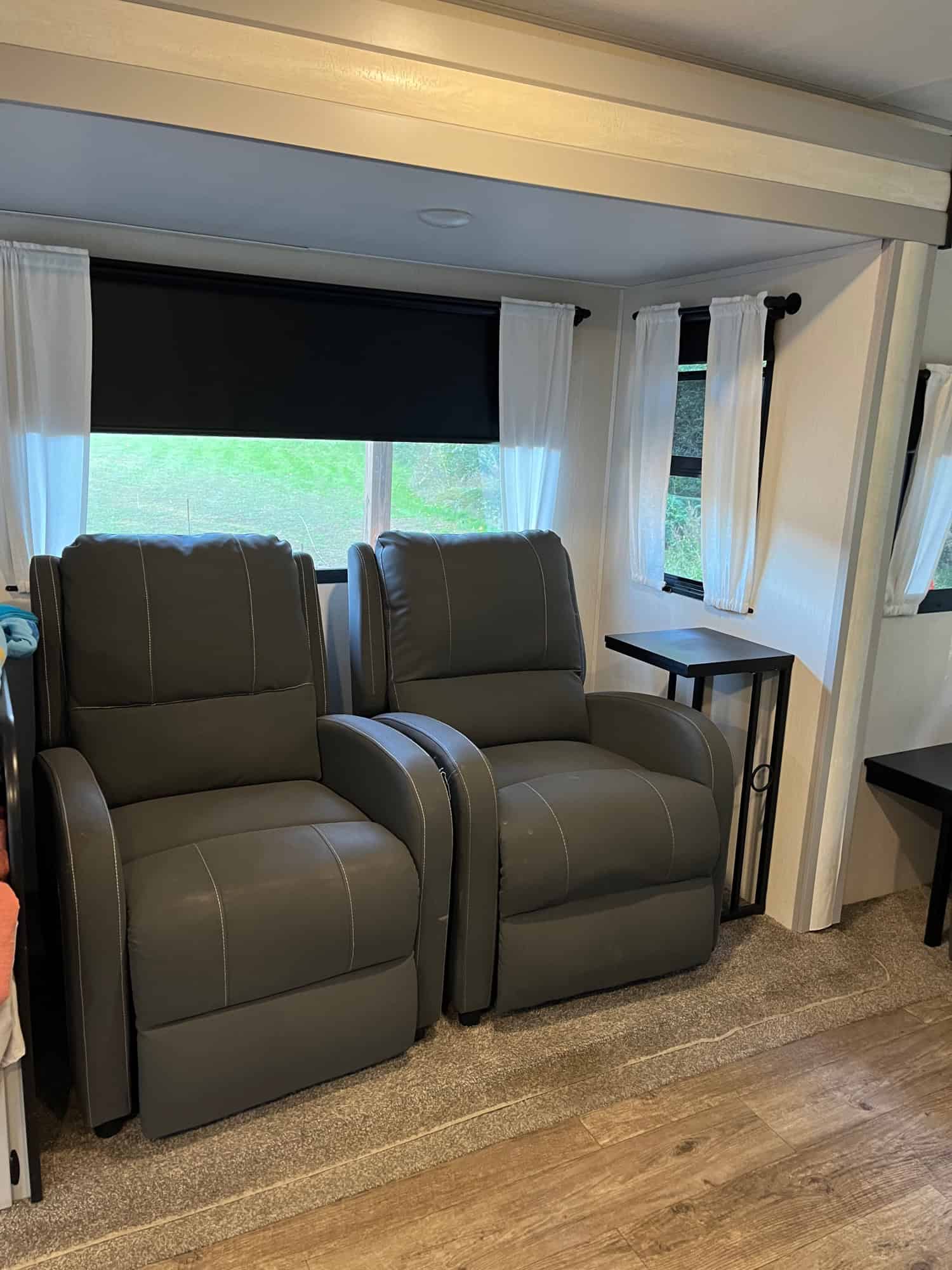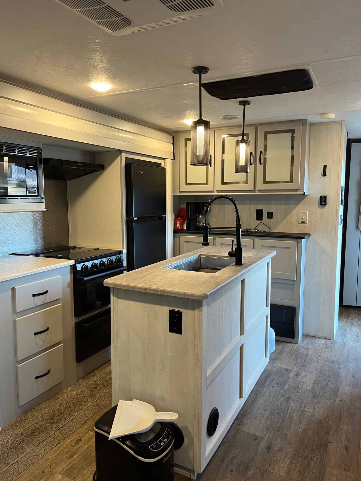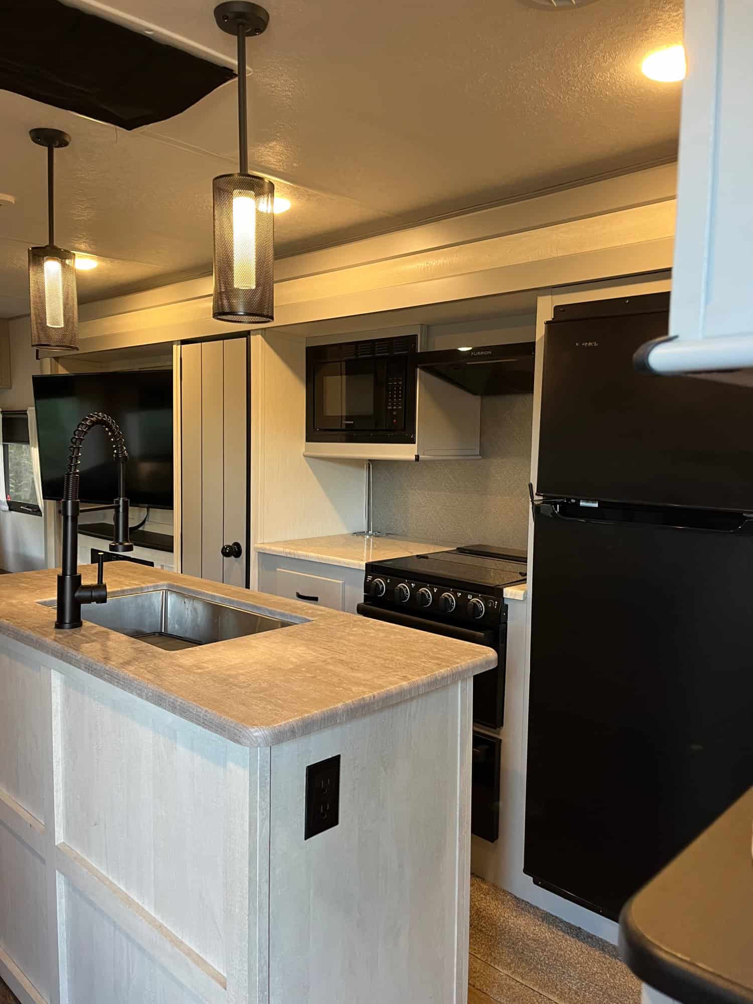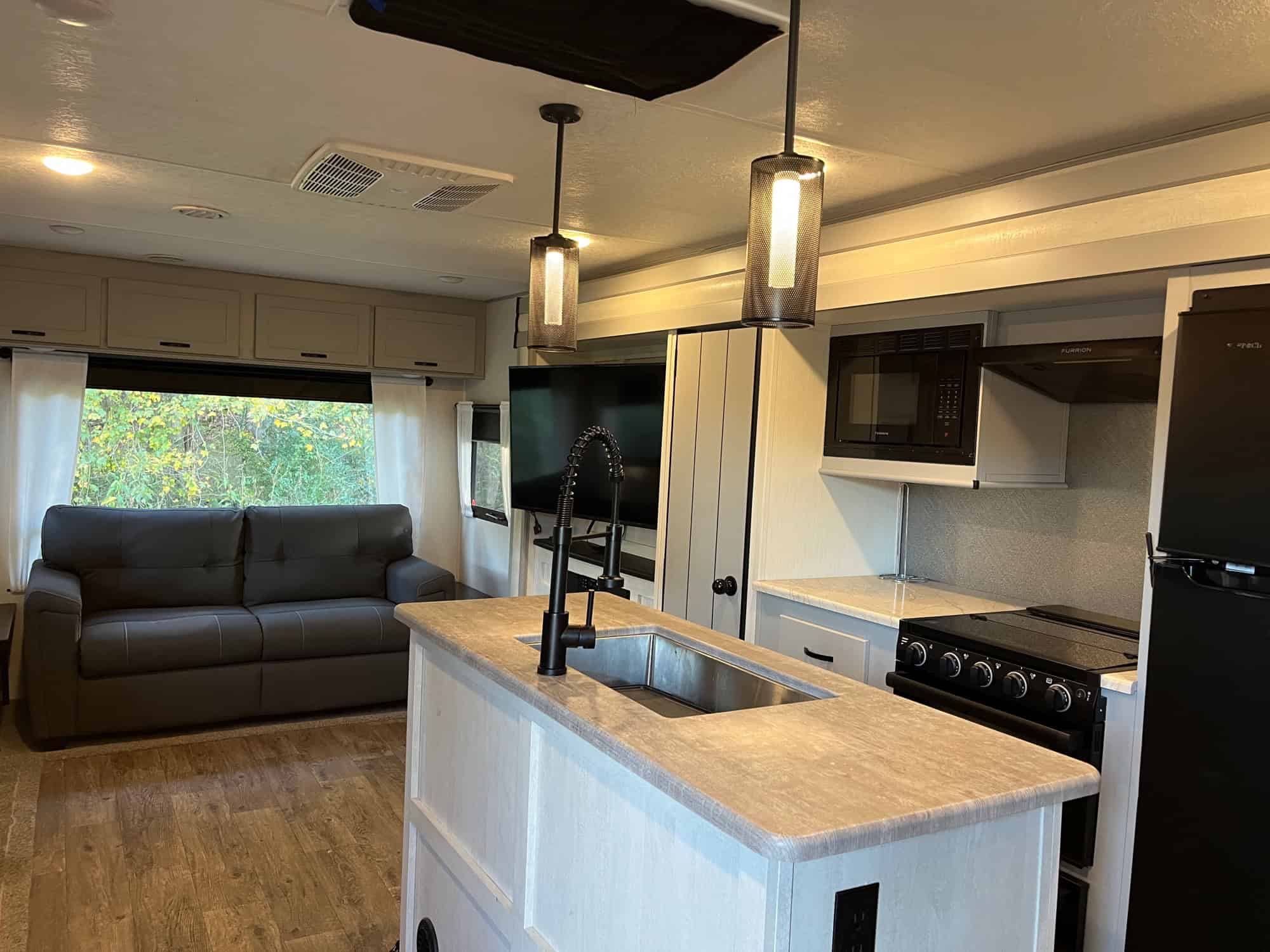 34 foot long – sleeps 6 – trifold sofa in living room that folds down to bed (not jack knife) – kitchen table makes bed – 3 inch foam for all beds – queen in bedroom – two awnings – storage underneath – weight distribution hitch – electric or gas water heater – solar battery system – fireplace – darkening pull-down shades – kept under pole barn entire time – very nice camper, just don’t have time to use it! DICKSON, TN