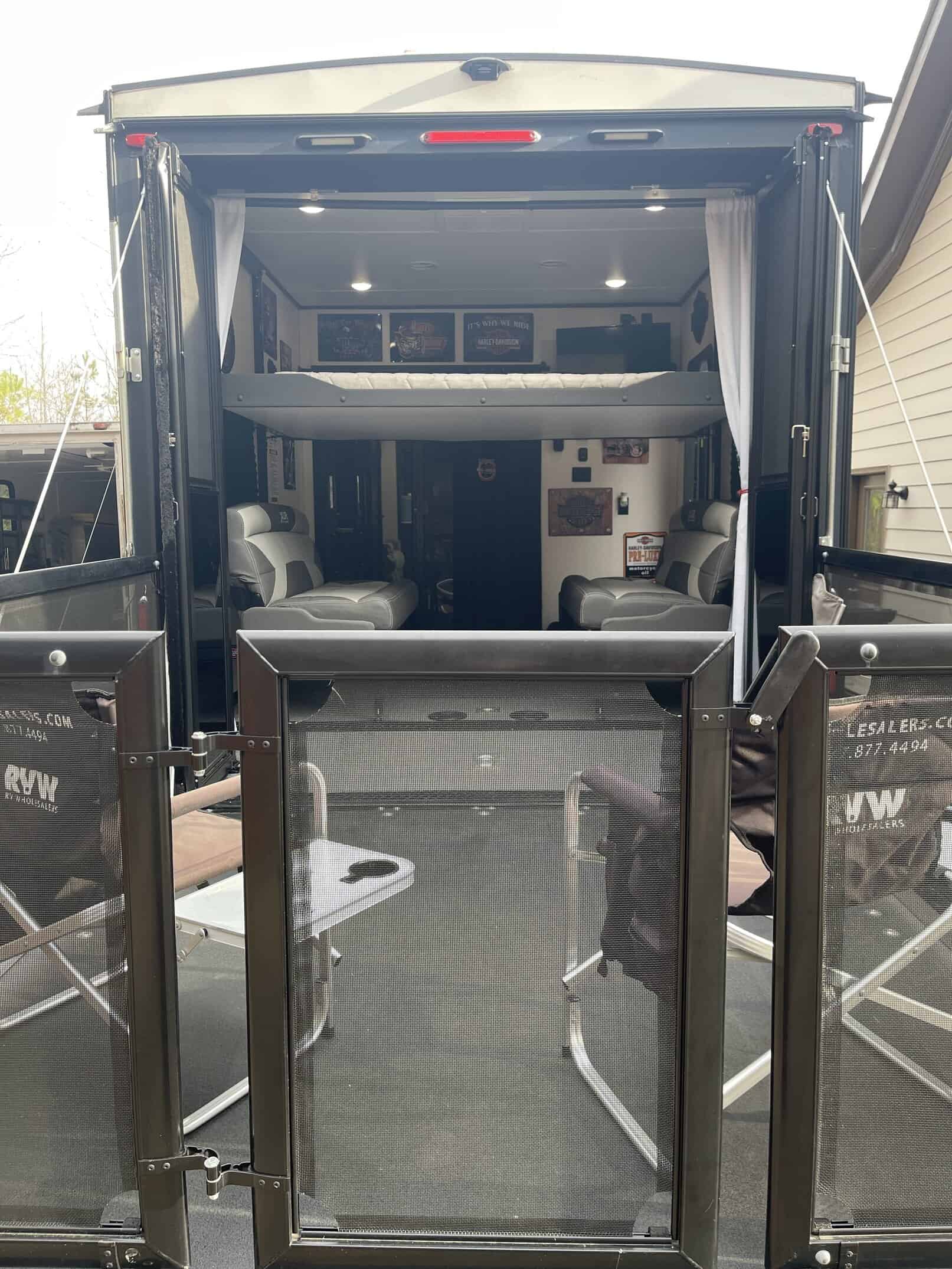 5.5 Generator, 3-Season Rear Patio Door, 2nd Air Conditioner in garage, VIP Party Deck, 12V Heated Holding Tanks, Electric Stabilizer Jacks, Awning Toppers.
