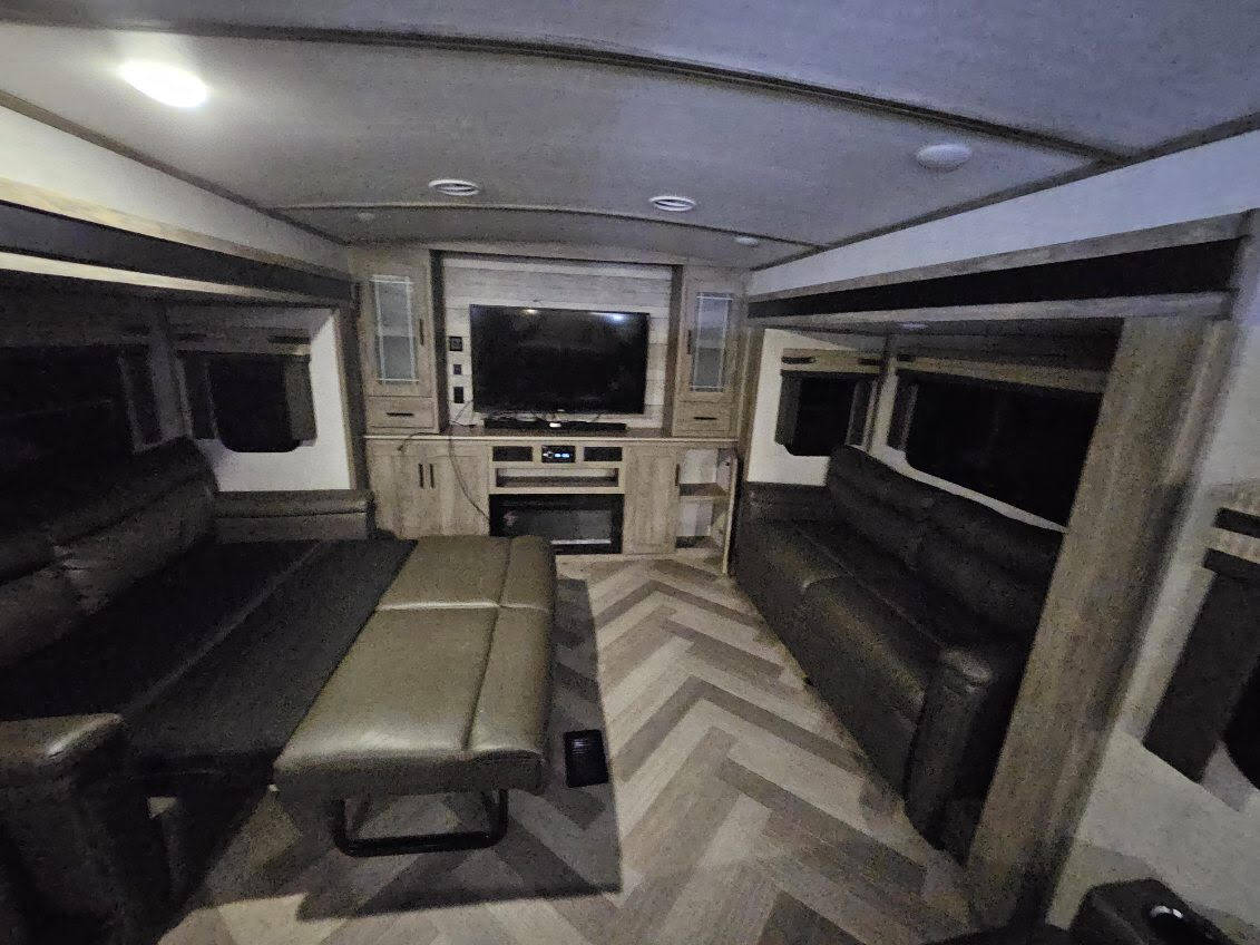 Inside, you will find a well-appointed living area with plush seating, a large flat-screen TV, and a cozy fireplace for those chilly nights. The kitchen is especially nice with stainless steel appliances, convenient island with extra space, and ample storage space for all your cooking essentials. This sleek and updated kitchen also features, a recessed glass stove top, glass microwave, and a stainless steel single-bowl undermount sink with a roll-up sink cover. But, the best kitchen feature is the 4-door Conventional Size Refrigerator! Just up stairs is the bathroom, which features a spacious shower with a skylight, modern fixtures, and plenty of room to move around comfortably. Plus, plenty of storage and clever places for hanging towels.