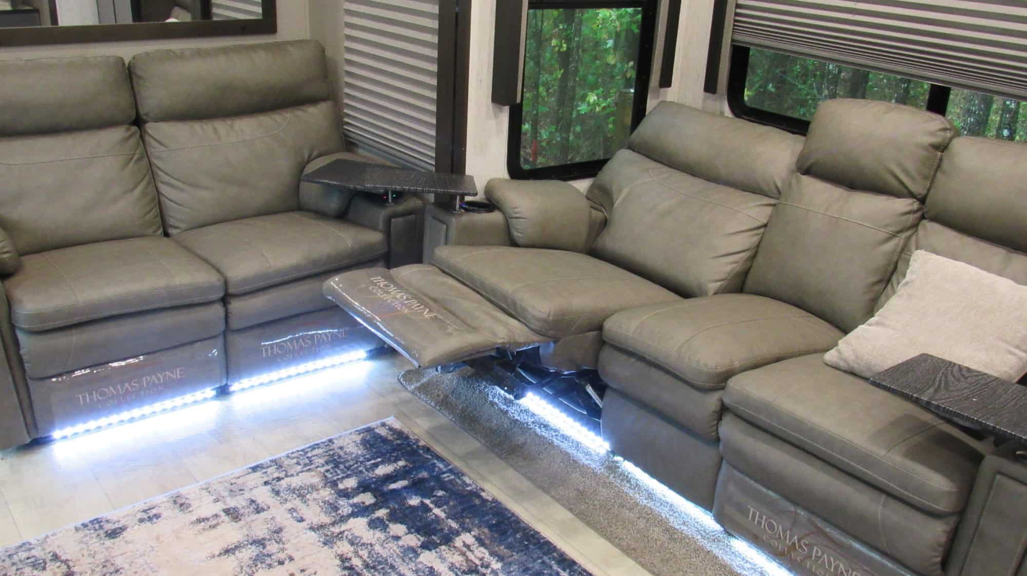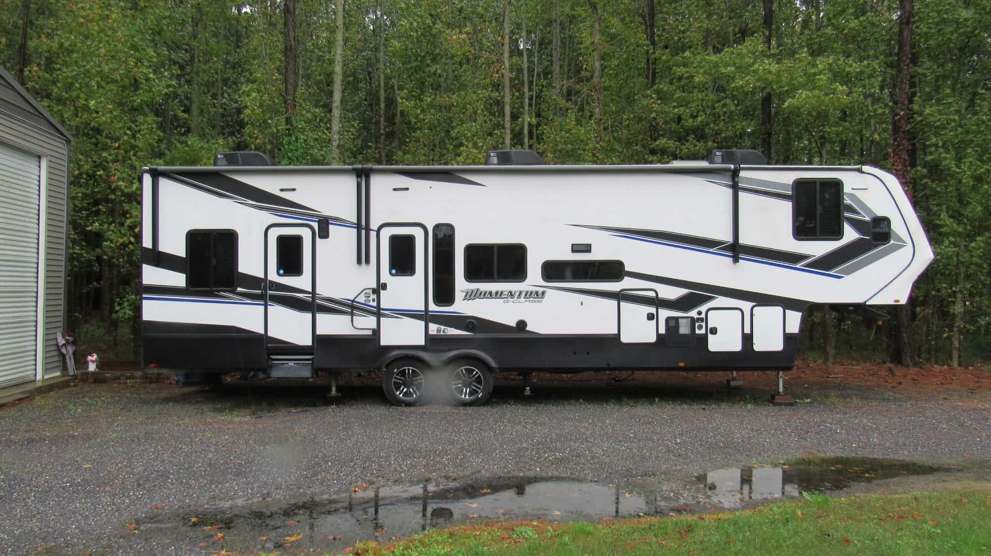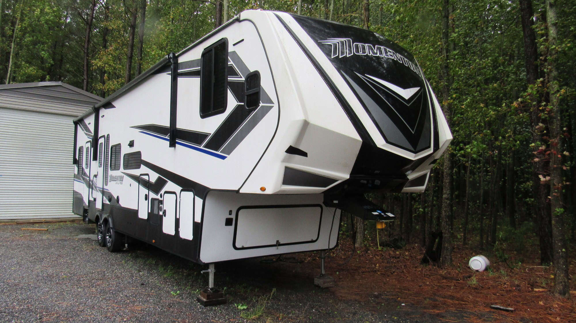 The Grand Design 353G Toy Hauler is designed with 3 separate interior areas. From the master bedroom up front with a king size bed and generous closets to the living central space with two sofas and tons of kitchen cabinets, and a rear area that is a 11 foot garage with ramp. That can be used as a separate sleeping area with the inclusion of double queen size bunks that can be brought down from the ceiling. Each of these three areas have their own air conditioning units w/individual thermostats. This unit has two slide outs, three awnings (two off the passenger side and one off the rear (shading the rear ramp that in its level position is used as a patio). The unit has a bath and a half, and w/d hookups. This 5th wheel is in near new condition and pulls like a a dream with my one ton single rear axle pick up. Option upgrades added above base unit include King Size master bed , TV in master bedroom, a third air conditioning unit (allowing separate air in each of the 3 areas of the rv, each with it’s own thermo control, 1/2 bathroom in the rear garage area, Washer Dryer hook up, 5500 watt Generator, 2 additional power awnings making a total of three, Additional TV in the garage area , making a total of three. Also, a really convenience on this unit is an Auto Leveling feature. But my favorite option is the rear sliding glass doors off the rear onto the patio, with built in screens. Have a transferable extended warrenty that runs thru April of 2029