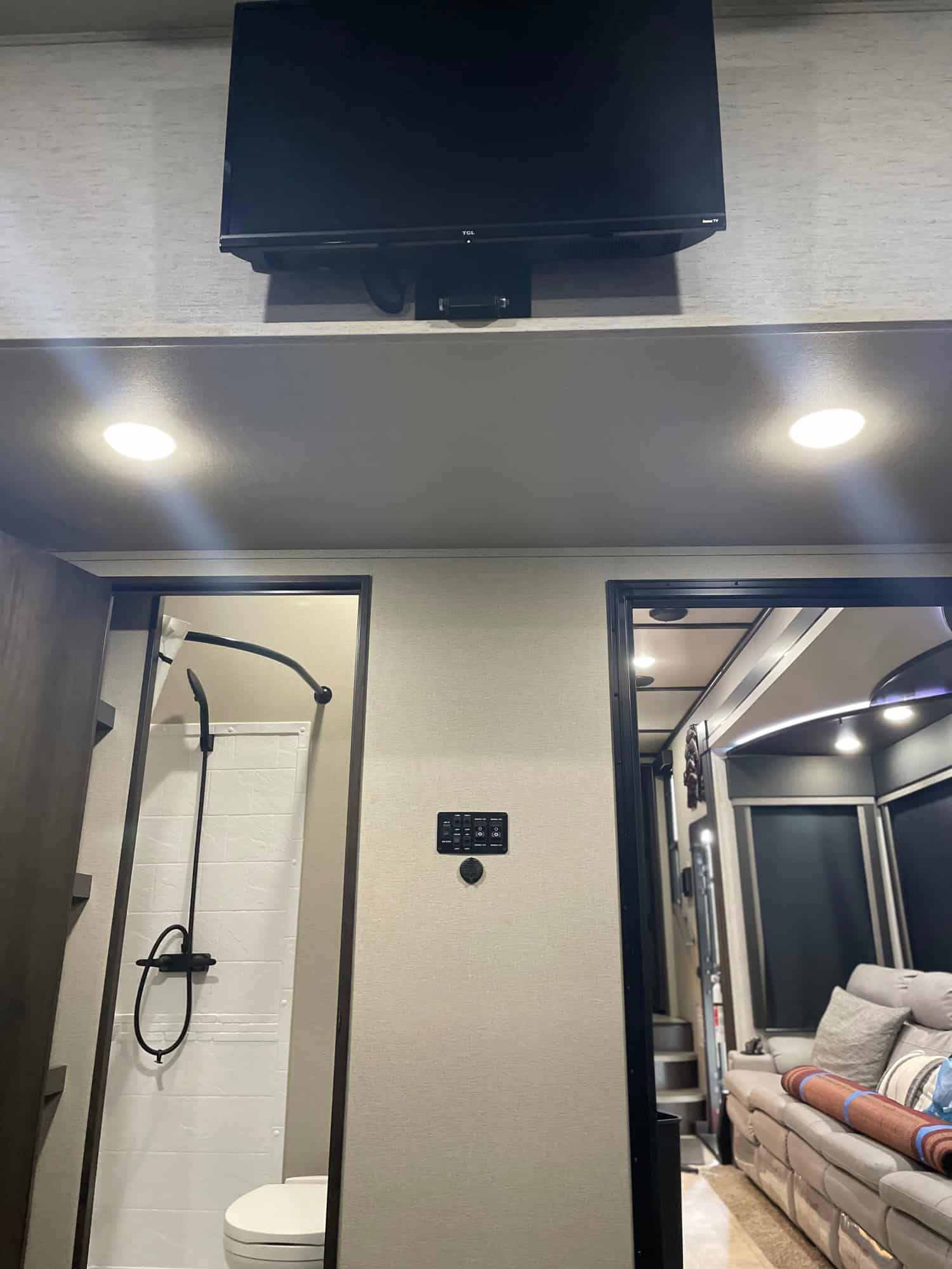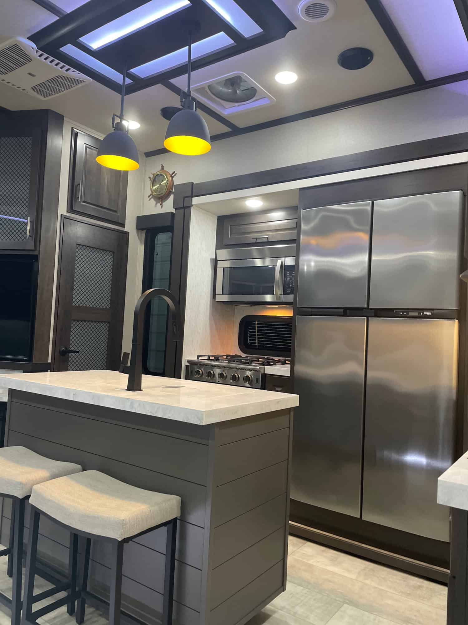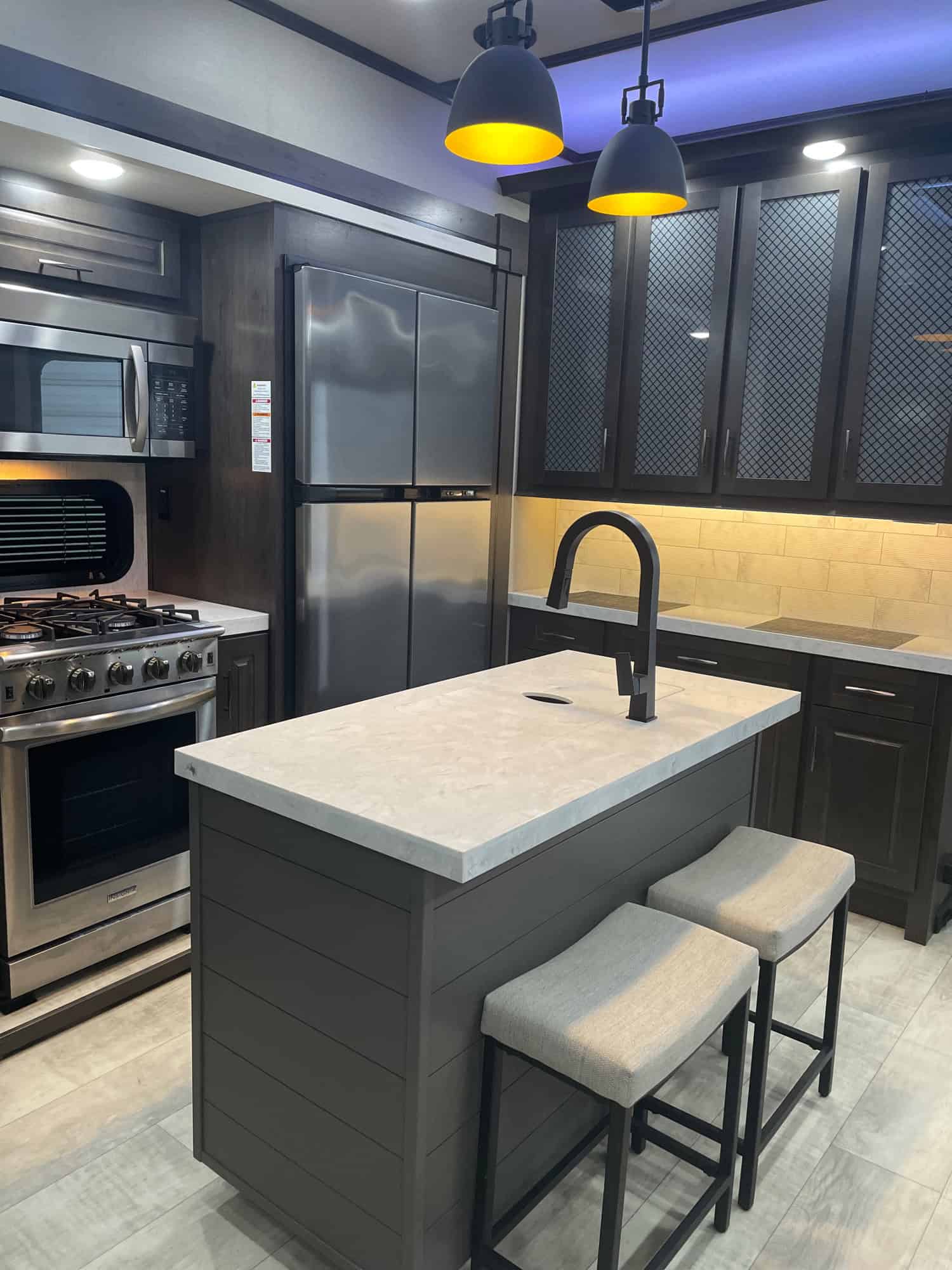 Amenities: Hydraulic Landing Gear,Self Leveling, Mor Ryde Pin Box, 3000Cre Suspension, 3 Slide-outs, 3 Ducted Air Conditioners, Residential Size Refrigerator, 2 Automatic Main Awning, Rear Floating Patio Awning, Window Awning, 4 TVs, Outside Shower, Fireplace, Central Vacuum, Microwave, 4 Burner Range, Fueling Station, Solar, Satellite, 2 Propane Tanks, and Washer/Dryer Hookups.