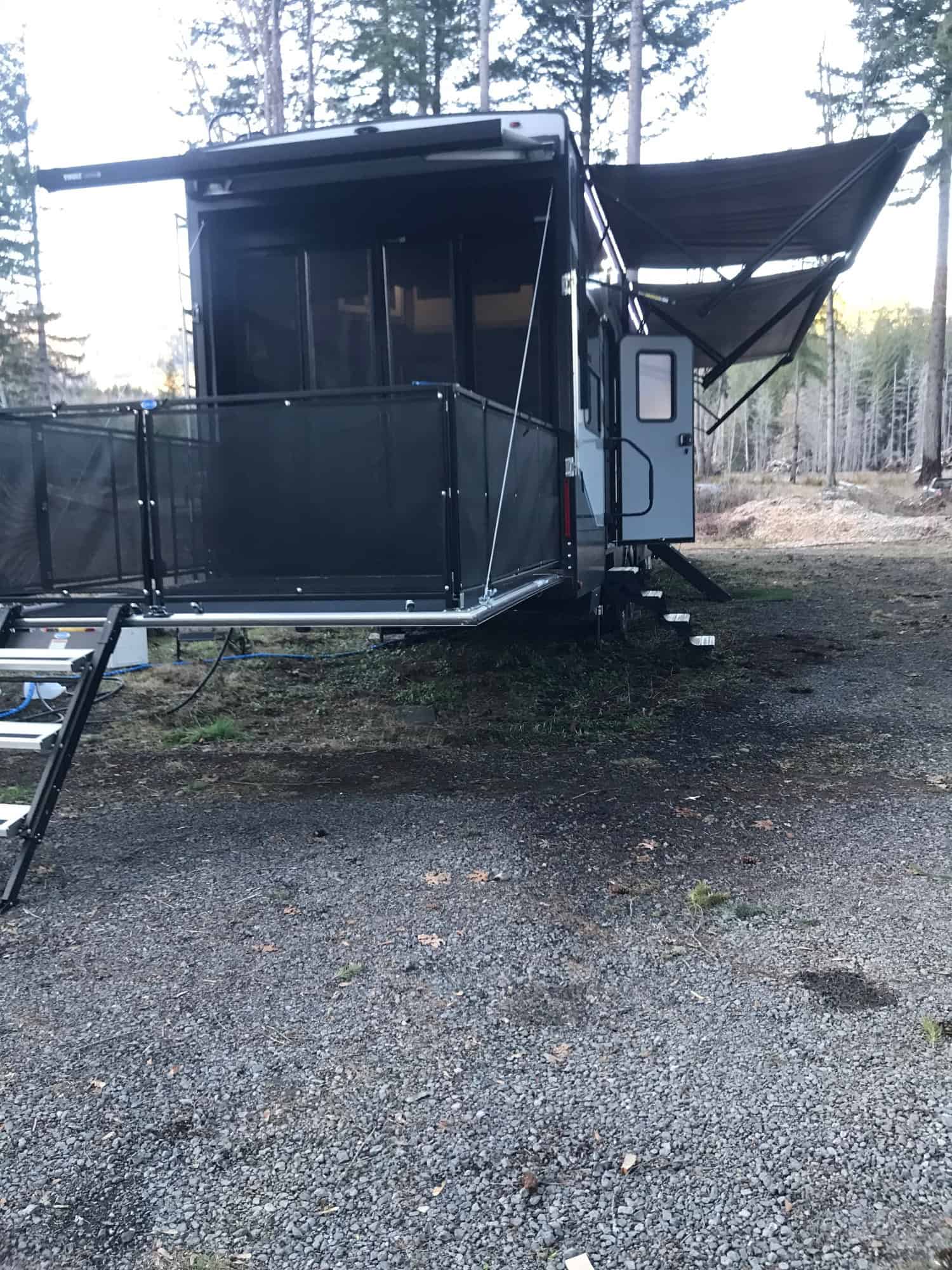 44’ long, 2 slides, dual axels, 3 AC units, huge 13’ garage, ramp becomes a patio w/ fence for pets.