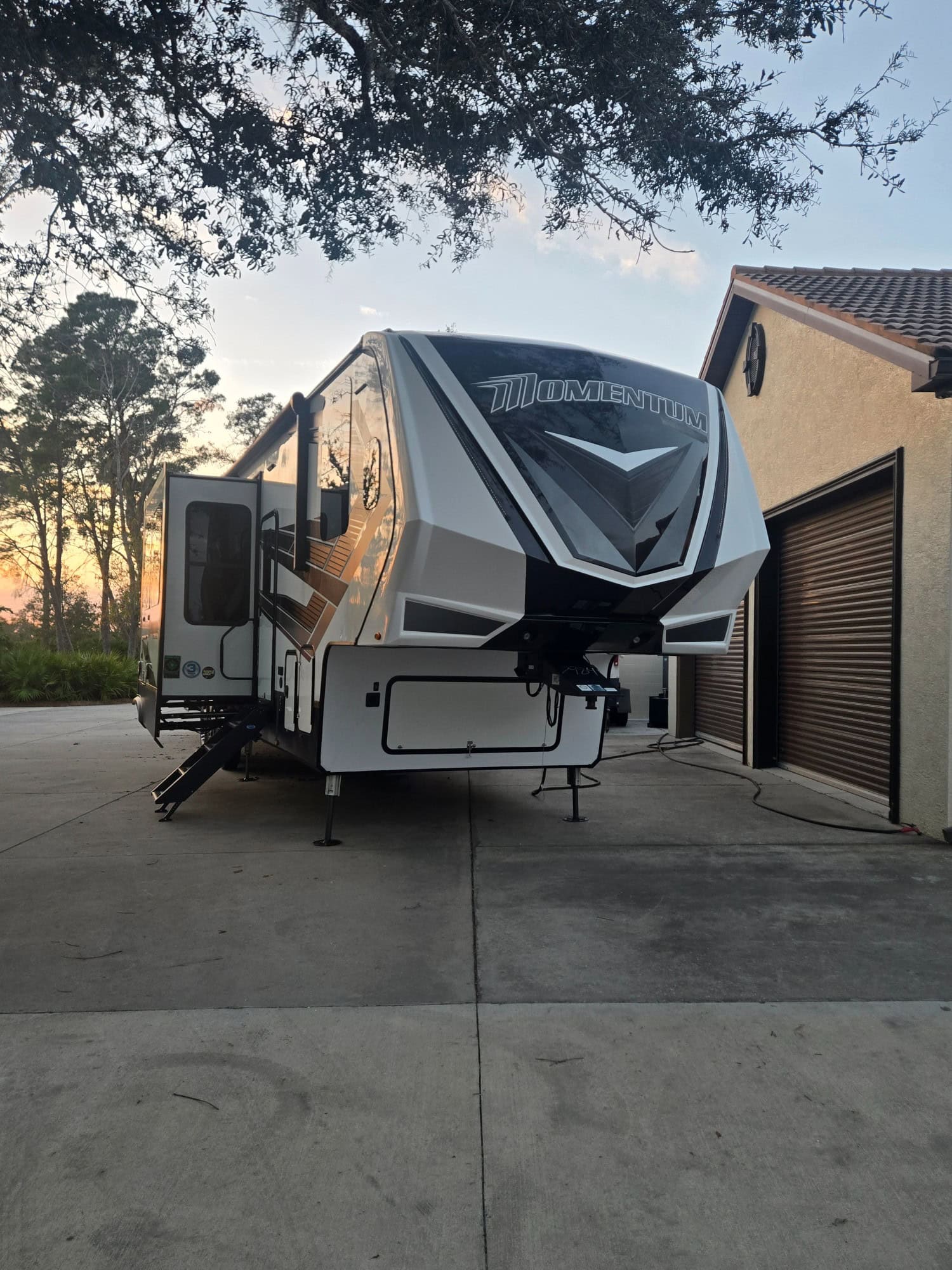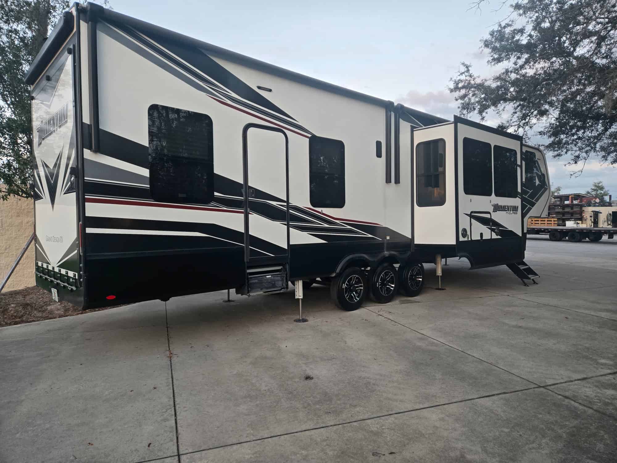 One owner. fully loaded with half bath in garage, washer dryer hook up, comes with a puck system fifth wheel for truck bed. new tires. Tire monitor system, fusion cam system and in car back up cam. 2 new awesome Sony TV's the best of the best as of last year this time. Super clean unit, not used much and only hauled 2500+/- Miles I don't think there will be a less used unit on the market! Can Deliver with a fee. The Grand Design Momentum M-Class 398M is a fifth-wheel toy hauler RV featuring an 18-foot garage, dual-entry, a loft area, and a residential-style kitchen. It is designed for carrying powersports toys, with a rear patio, fuel station, and high-capacity ramp door, and includes amenities like a fireplace, a four-seat sofa, and a residential refrigerator. It has a length of approximately 43 feet 11 inches and a maximum weight of 20,000 pounds.