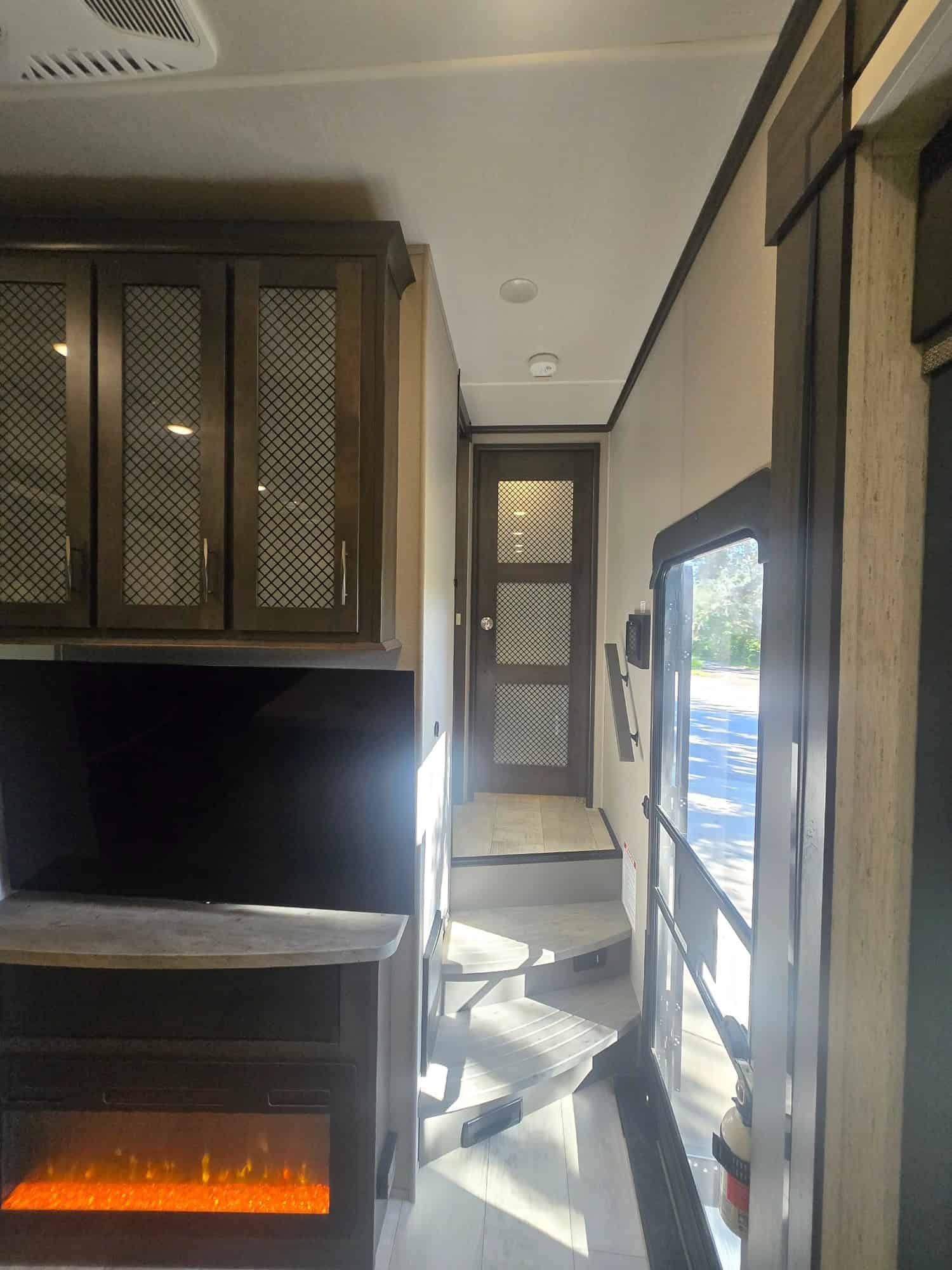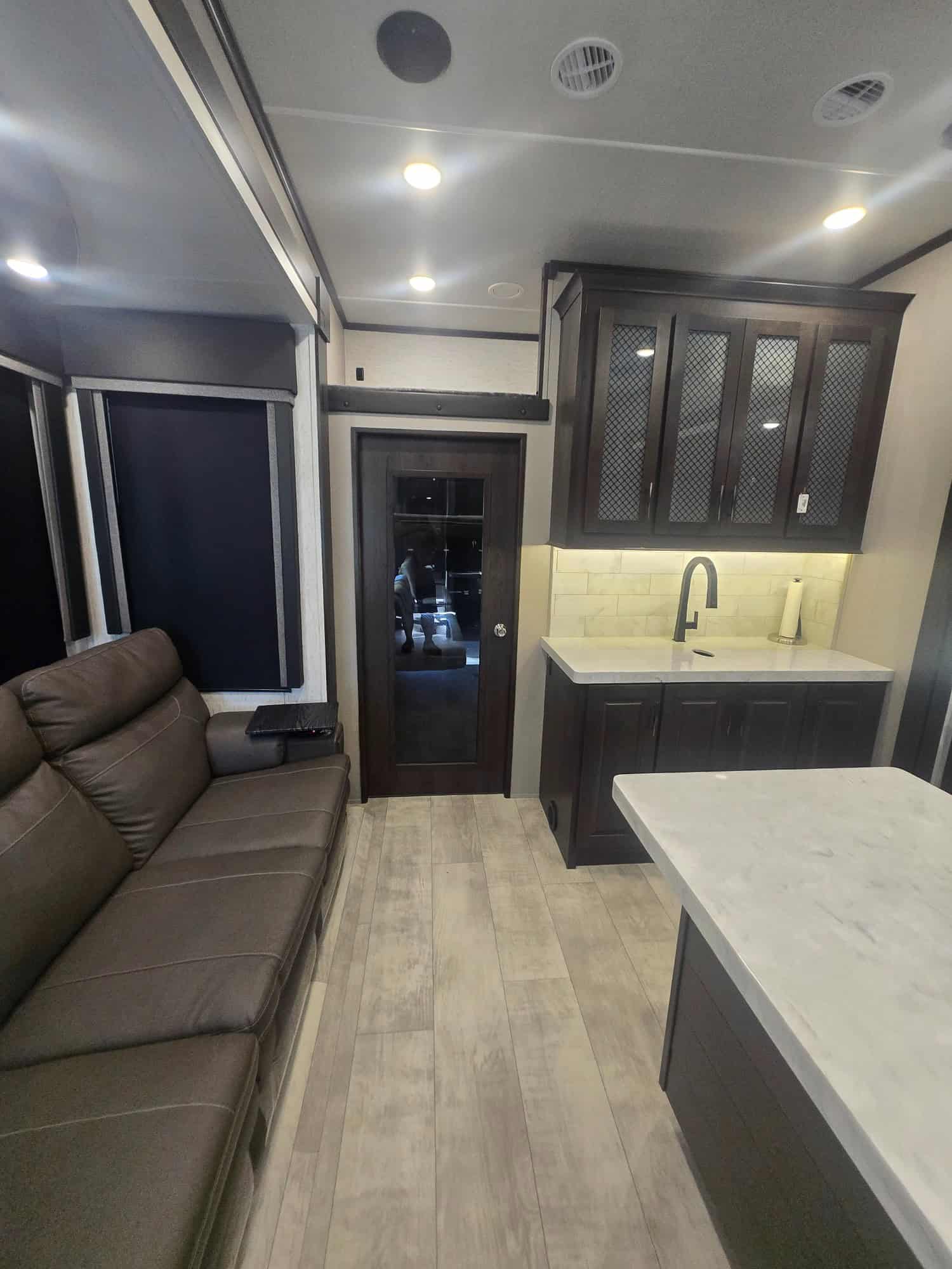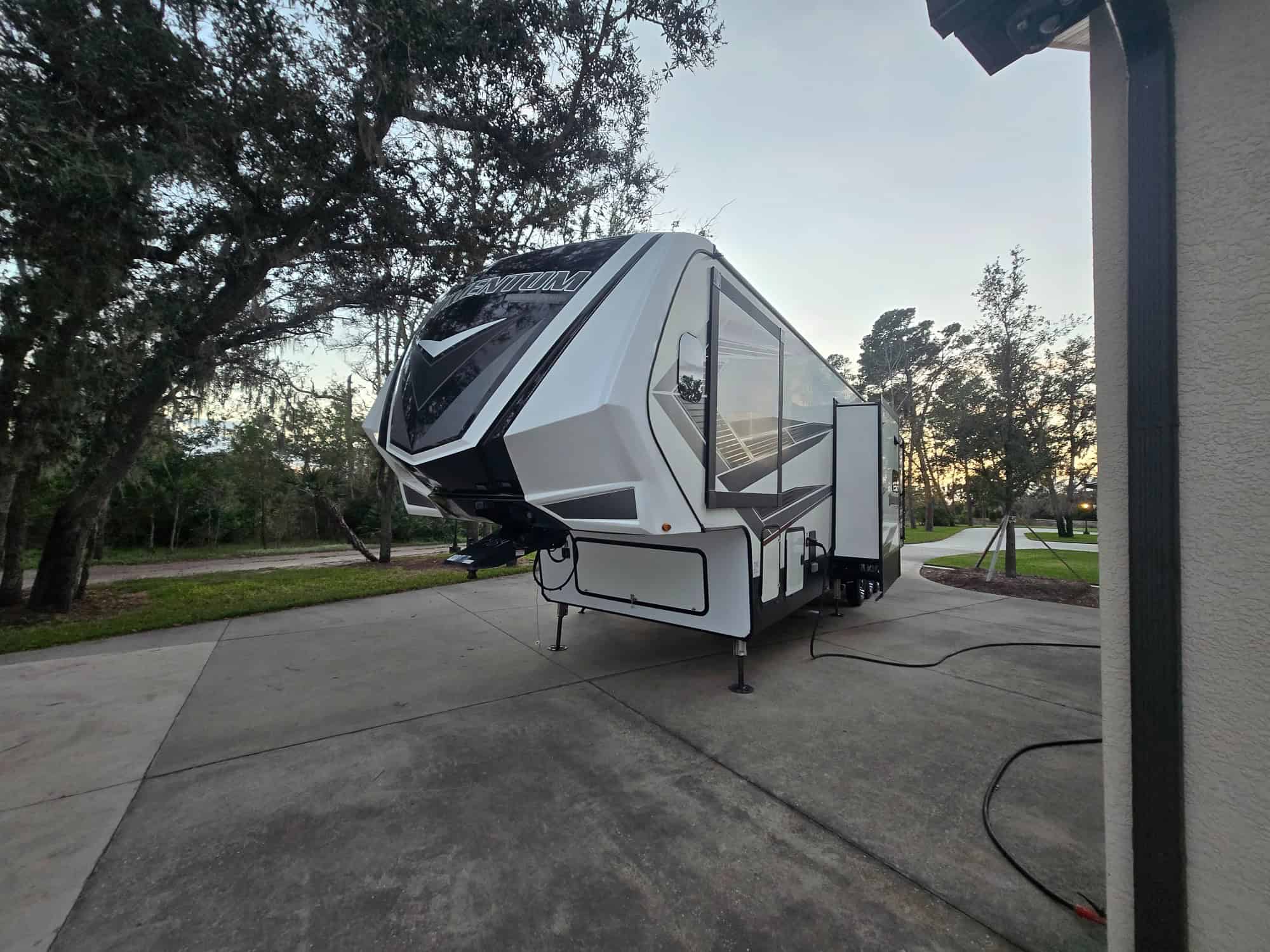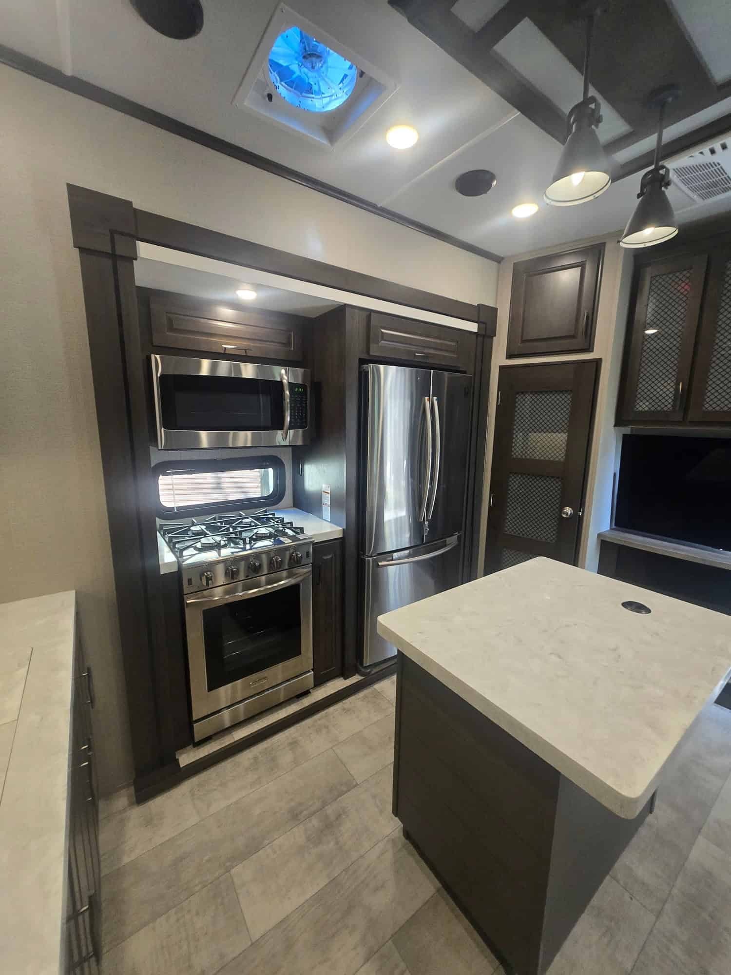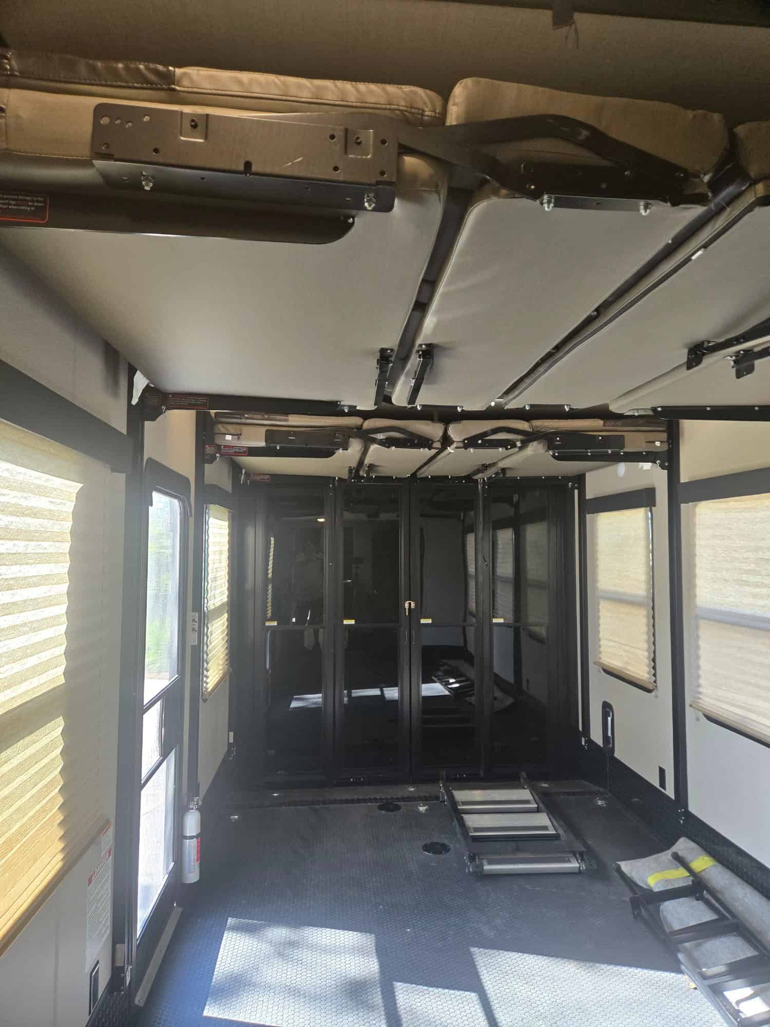 Exterior: Equipped with an onboard fuel station, a high-capacity rear ramp door, two awnings, and a six-point hydraulic leveling system.