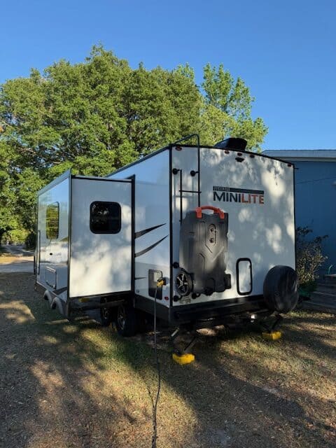 Outside, the Rockwood Mini Lite is just as impressive. The very large awning, grill and speakers add to whatever outdoor setup you could want at any campsite. The sturdy construction and double axles ensures durability and stability on the road. The compact size and light weight of this trailer makes it easy to tow. Included are chocks, blocks, weight distribution hitch, an additional portable sanitary tank and fittings, and more.