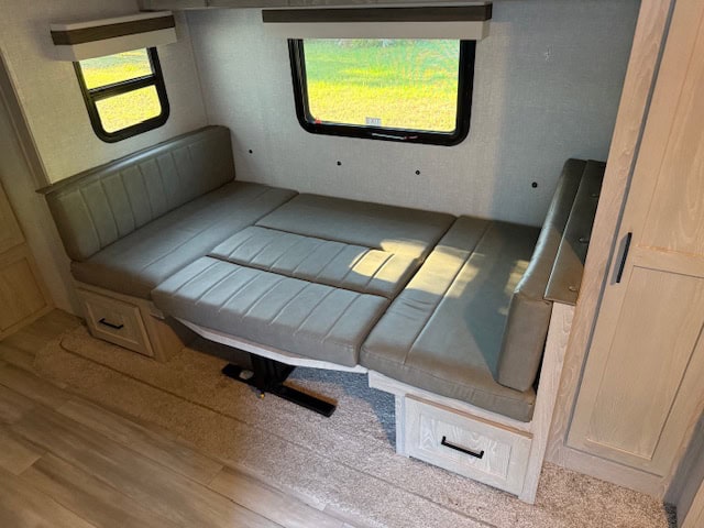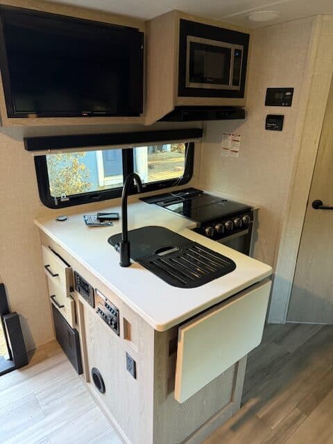 This model features a spacious interior layout including a sofa and slide-out with a wrap-around dinette. It offers a well-designed floor plan that maximizes space and functionality. The living area is light, airy, with multiple skylights, AC, and light colored walls and cabinets. It will sleep 3-4 using the dinette and space-saving murphy bed. The kitchen comes fully equipped with modern appliances, a generous amount of counter space, and ample storage. The bathroom with shower is spacious for any trailer this size and includes lots of storage.