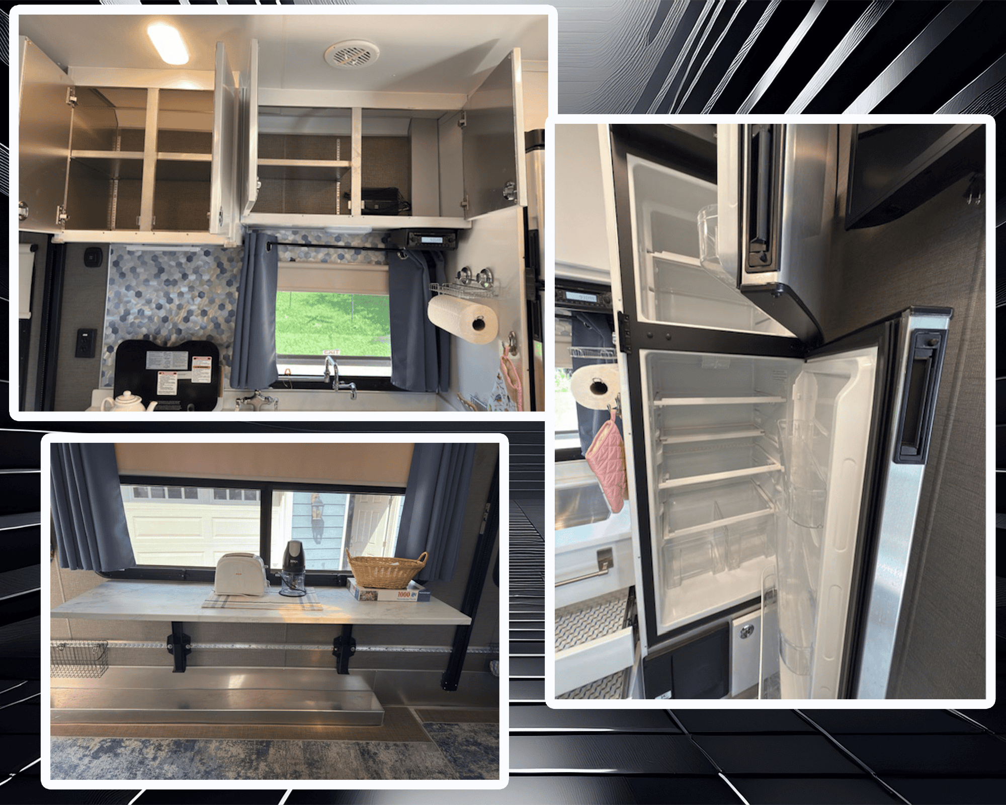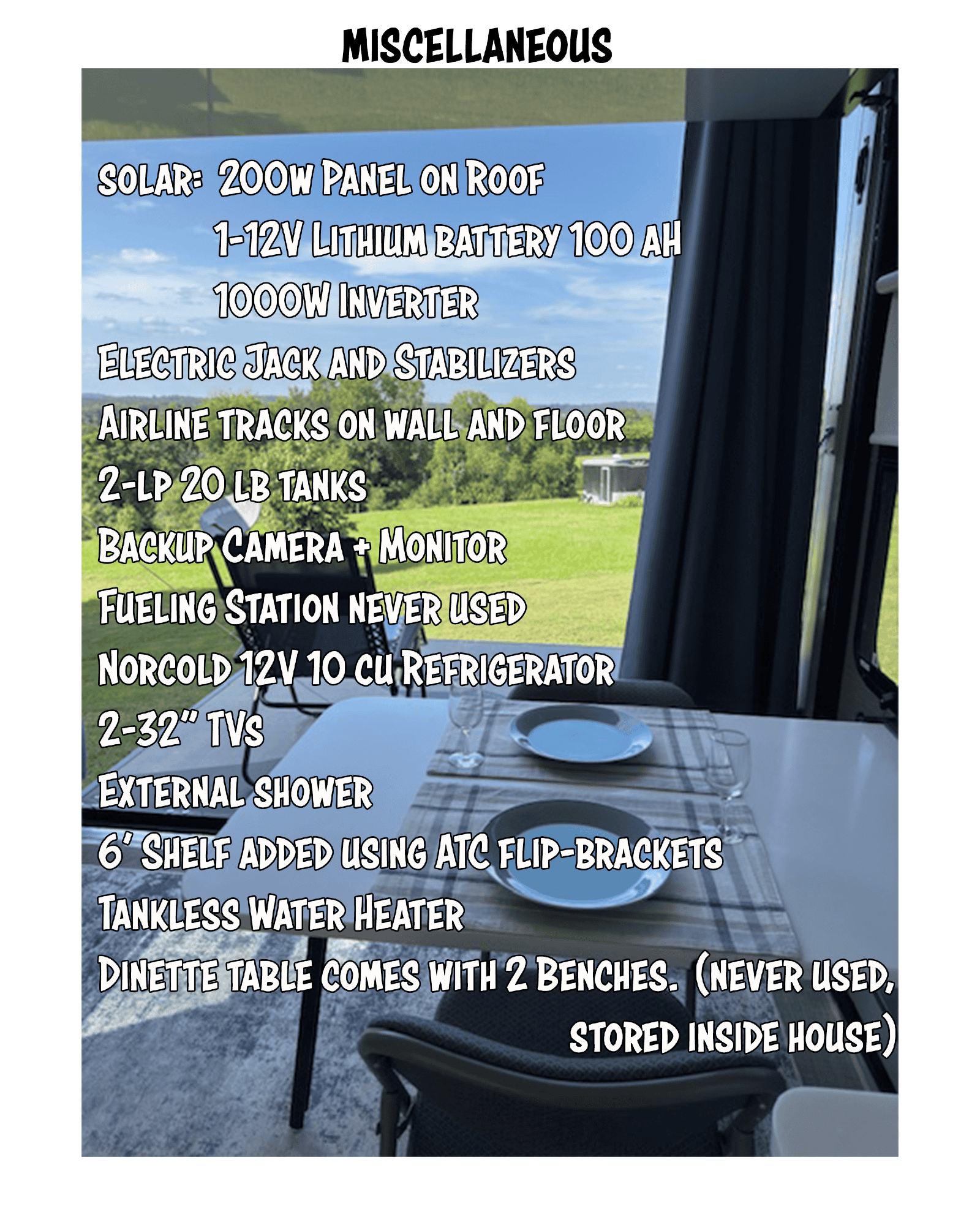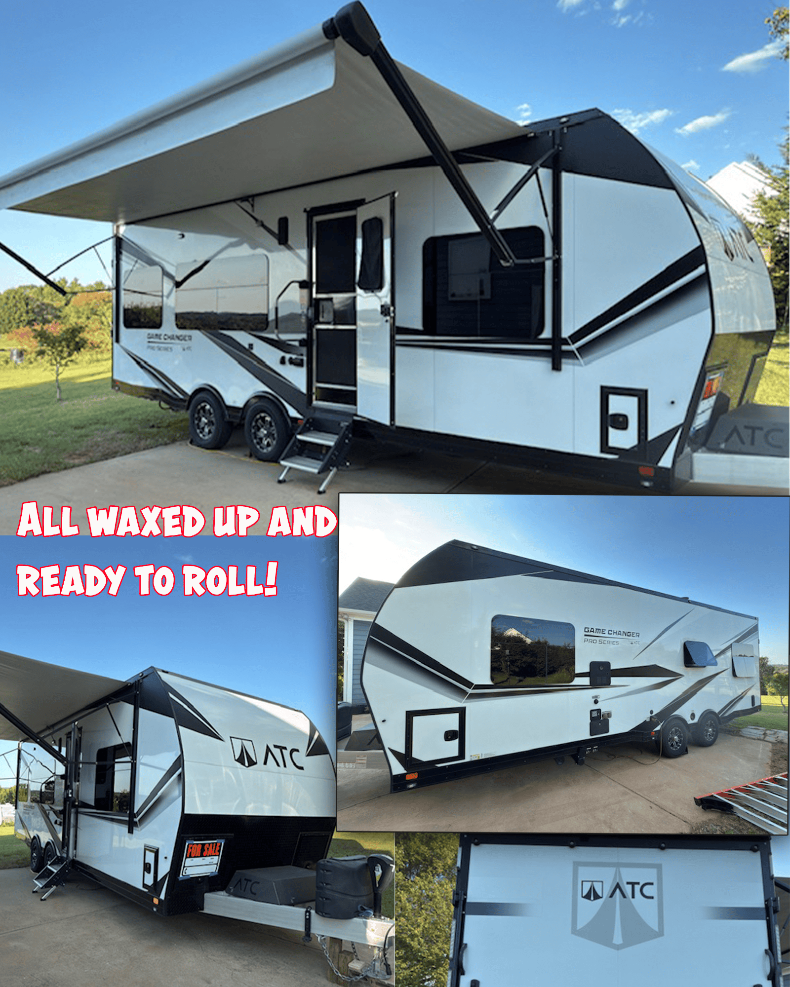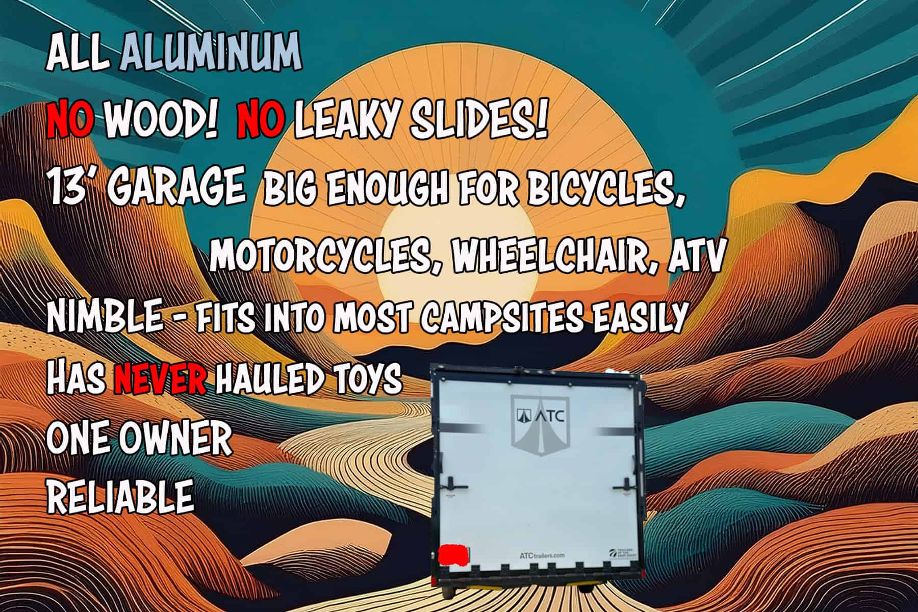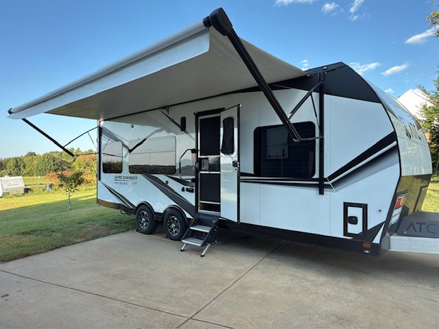 *PRICE REDUCED* Top-of-the-line, all aluminum Toy Hauler with a 13′ garage. Floor length of 25′ (+ 6′ hitch) makes it very easy to tow and nimble when getting to your campsite. Comfortably sleeps 4-5 with two queen beds and a bench-converted bed. Garage has airline tracks on walls and floor. 200 watts of solar on roof using 1 lithium battery. Hauler designed to last a lifetime and built on an all-aluminum, fully welded integrated aluminum frame, All white cabinetry is aluminum. Solid surface counters. You can add your own furniture and/or move the solid-surface table/dinette set around.to your liking. 7 years left of a 10-year transferable structural warranty!