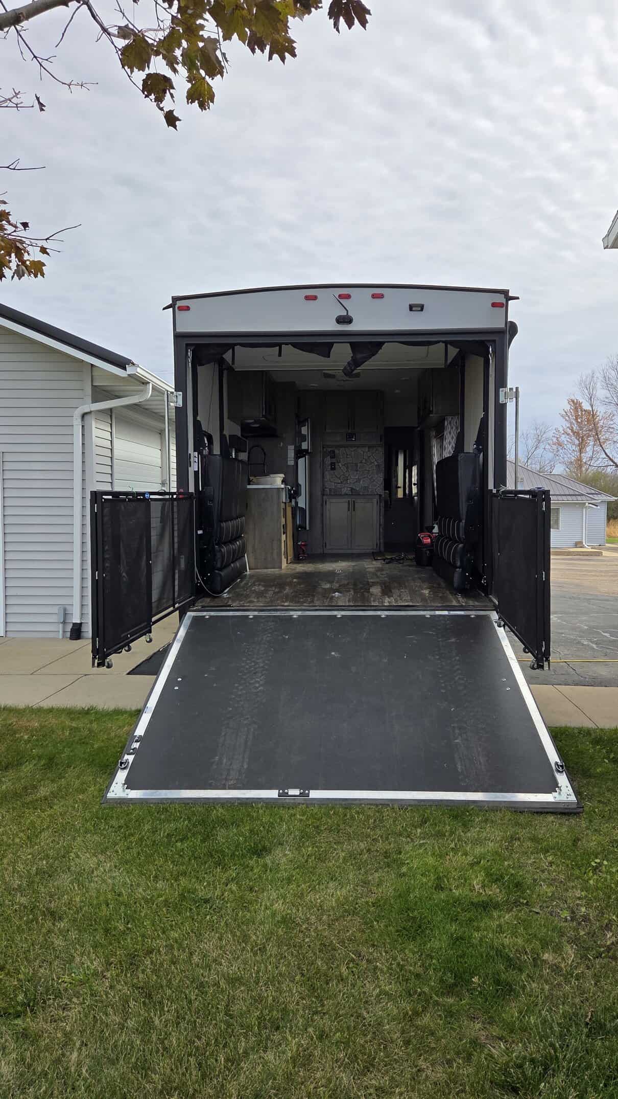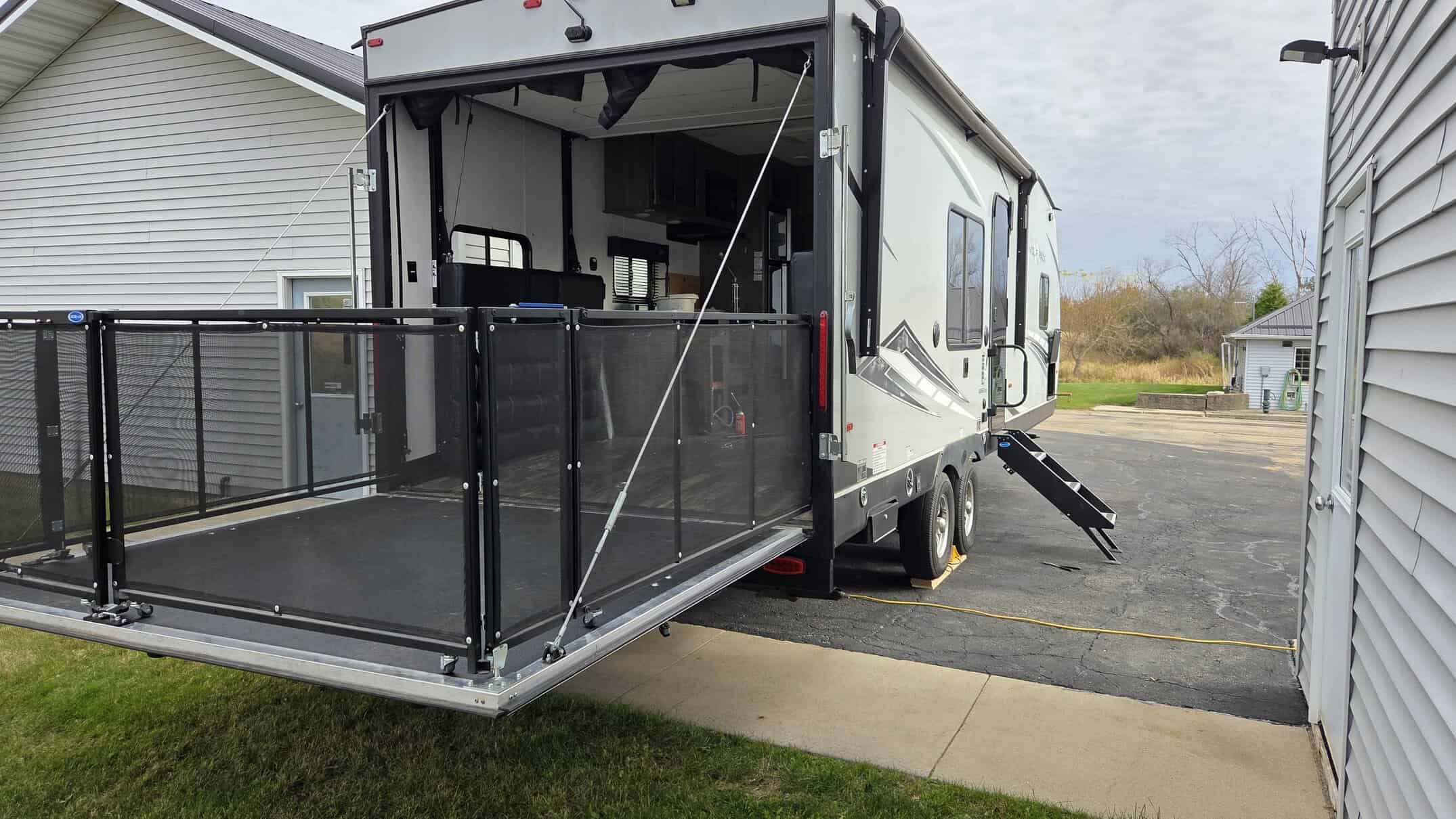 back ramp converts into a deck with side gates and inside roll down screens to keep the bugs out of the camper.