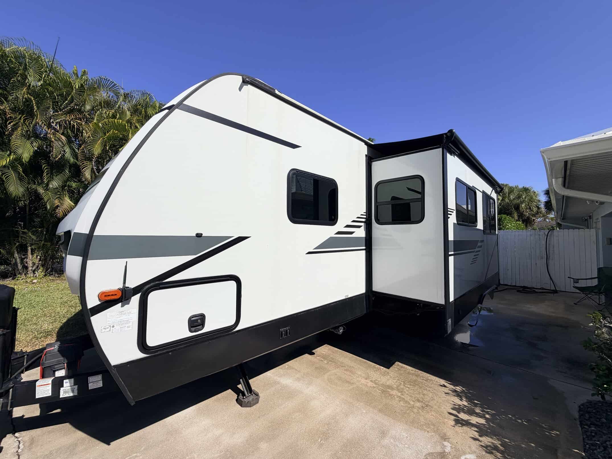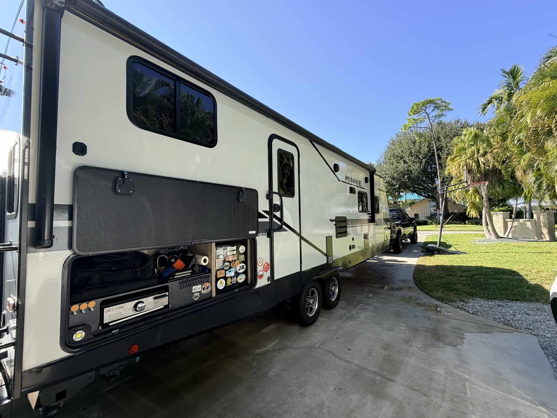 Upgrades are SuperSprings trailer sumo springs to suspension, KoolRv installed in main ac unit, MaxAir Deluxe fan w/remote in bathroom, TireLinc TPMS monitoring system, Haloview rear and side cameras, LevelMate Pro and Fleming Sales Griddle mount on rear bumper.