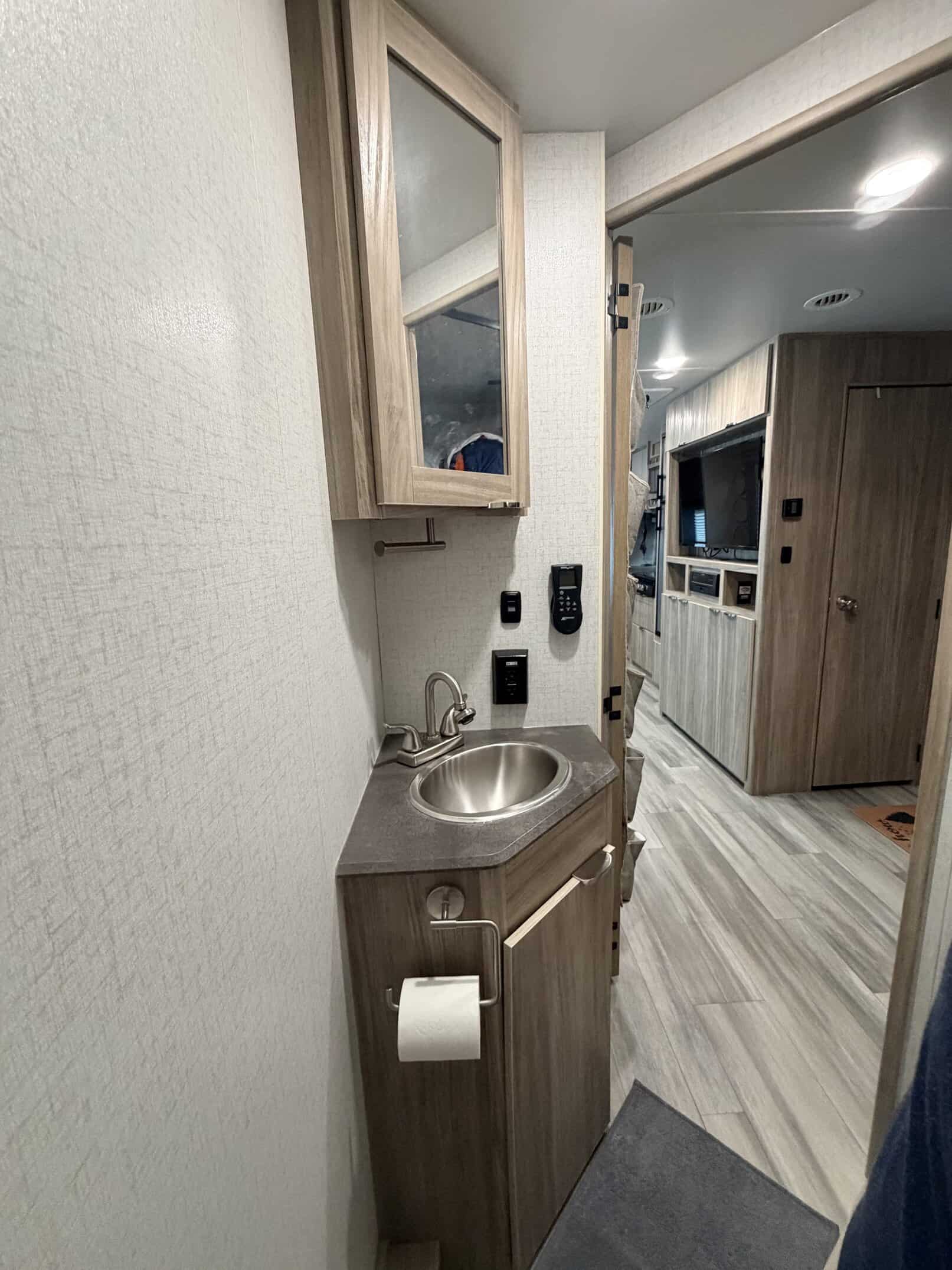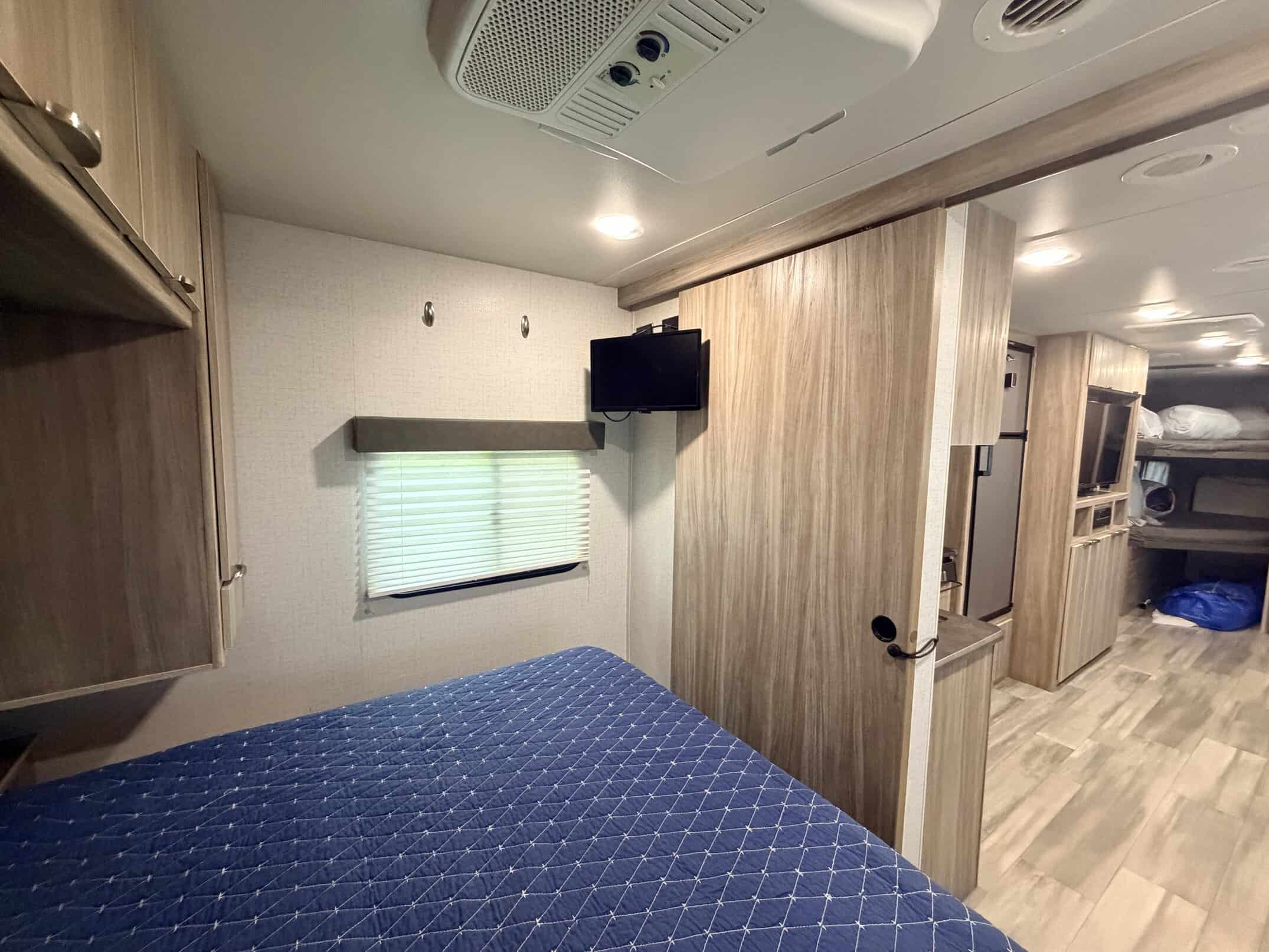 The bedroom in the Winnebago Minnie 2801BHS is a true retreat, with a plush queen-sized bed, wardrobe closet, and overhead storage cabinets. The bathroom is equally luxurious, featuring a spacious shower, porcelain toilet, and sink vanity.