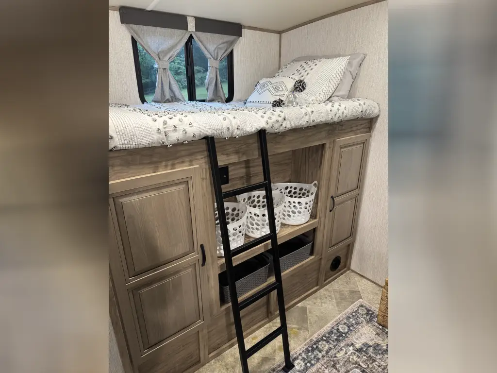 This lightly used 36.25-foot travel trailer is the ideal companion for family adventures or group road trips, offering comfort, space, and convenience on the go. With a flexible floorplan and three slide-outs, it comfortably sleeps up to seven, featuring triple bunk beds, a convertible booth dinette, and a private master bedroom with a queen bed, under-bed storage, and dual wardrobes. The center living area boasts theater-style seating, while the fully equipped kitchen includes a microwave, oven, and 3-burner stove perfect for preparing meals on the road. Additional highlights include washer/dryer hookups with included units, a power tongue jack for easy hitching, and an electric awning with integrated LED lighting. Climate control is handled by a powerful 15k BTU A/C and 35k BTU furnace, ensuring year-round comfort. With a GVWR of 9,825 lbs, 44-gallon fresh water tank, and ample exterior storage including pass-through bins this trailer is road-ready and equipped with a sway bar hitch for a smooth, stable ride. Solar panel wiring and backup camera prep add modern convenience, making this trailer a turnkey solution for your next adventure.