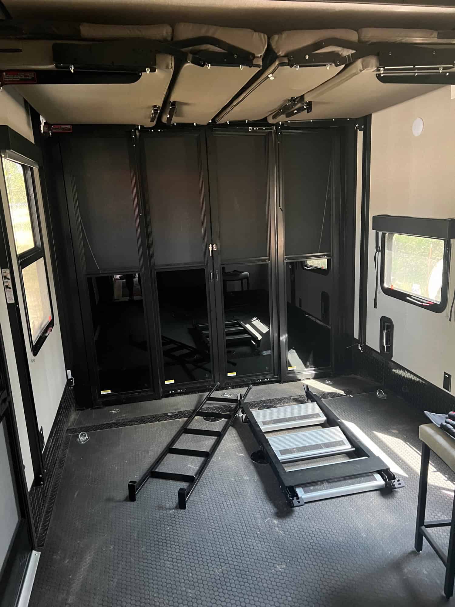 3 slides, dual pane windows, sleeps 7, walk around king bed, power drop down bunks, washer/dryer prep, solar 3000w with 2000w inverter,13 foot cargo, 1 1/2 bath, artic package, fuel station, 5.5kwgenerator 3 tv’s Rockford fosgate stereo.
